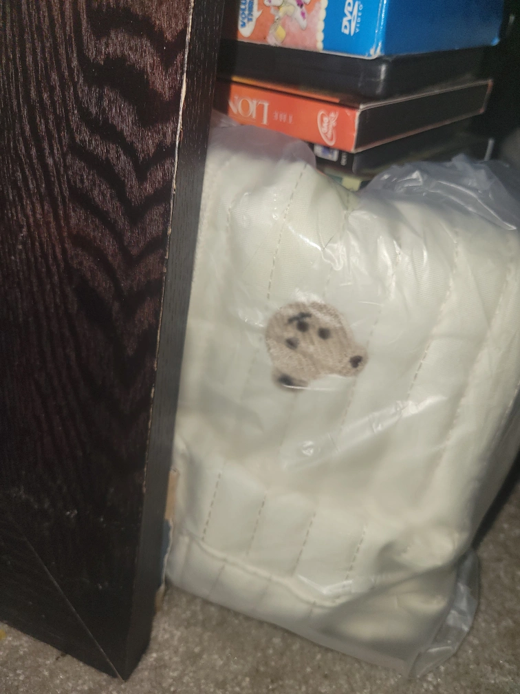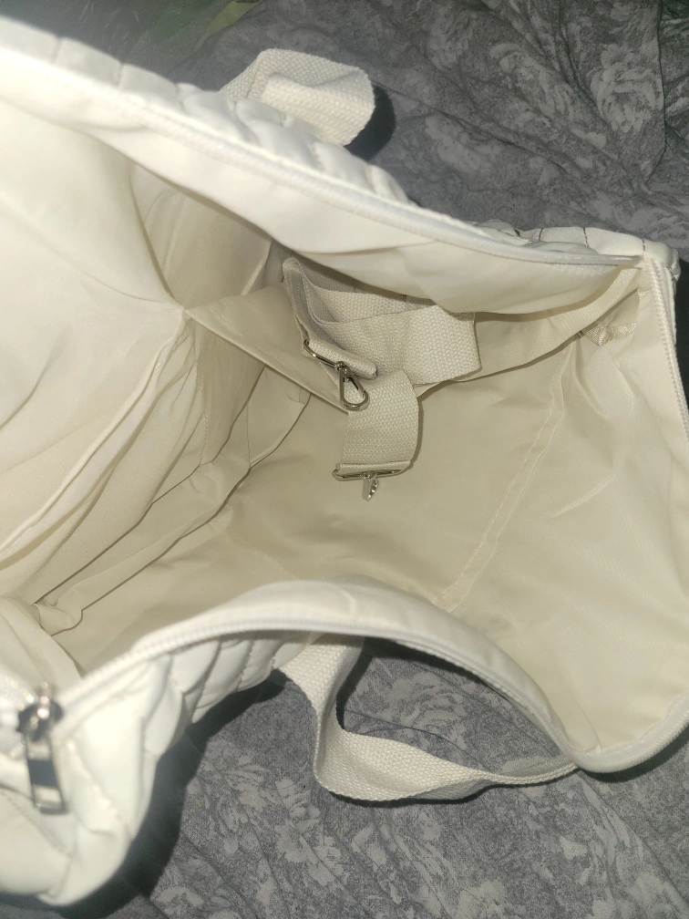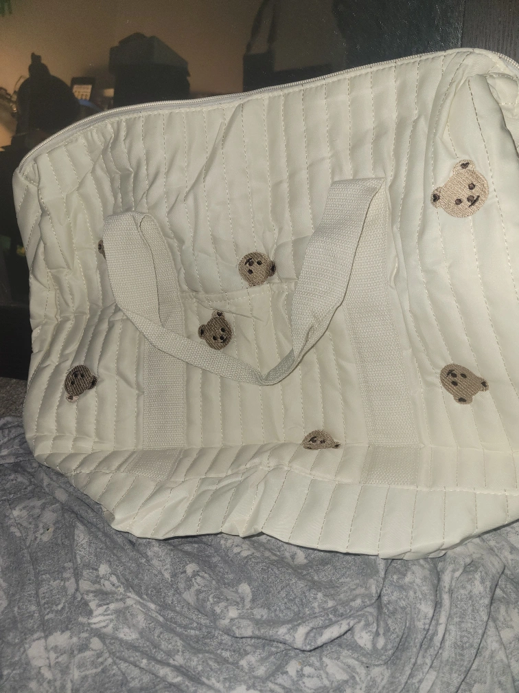 Off-white quilted travel bag. Features cute embroidered bears. Zipper closure and top handles. Interior pocket. Perfect for weekend trips or carrying essentials.