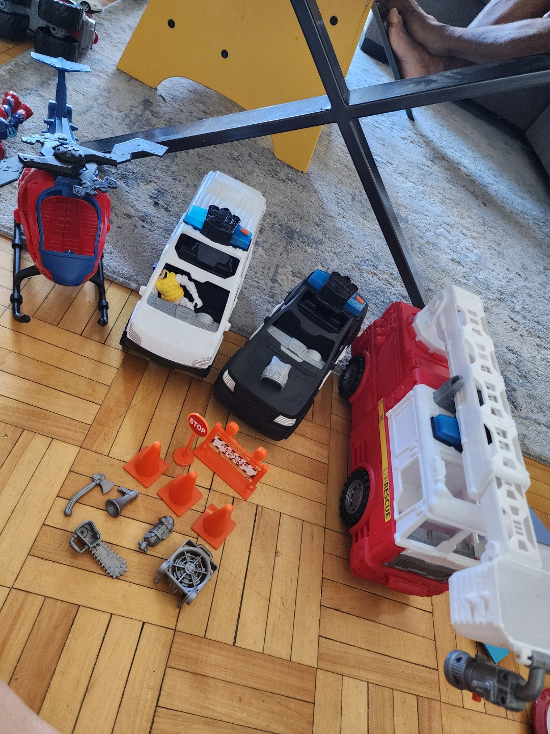 Police cars, firetruck, helicopter, ambulance and rescue accessories. Great for imaginative play. Some small parts.