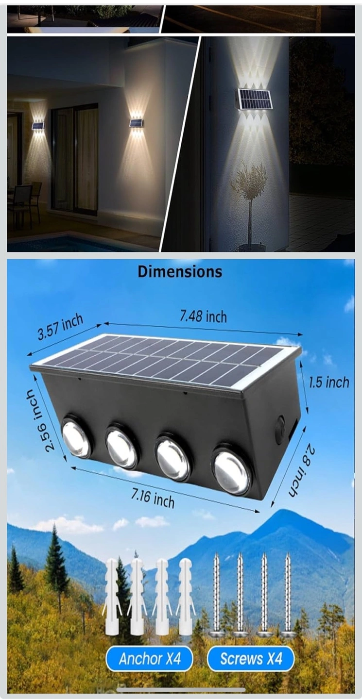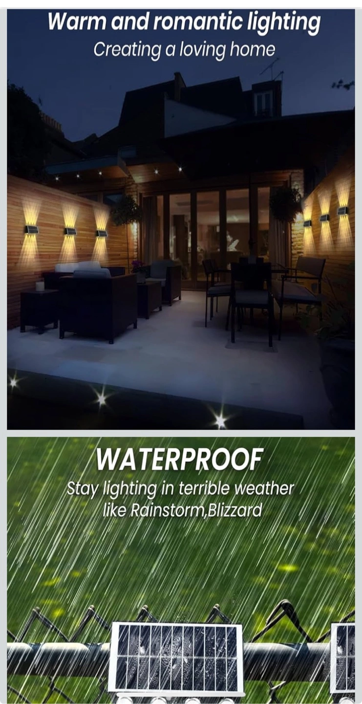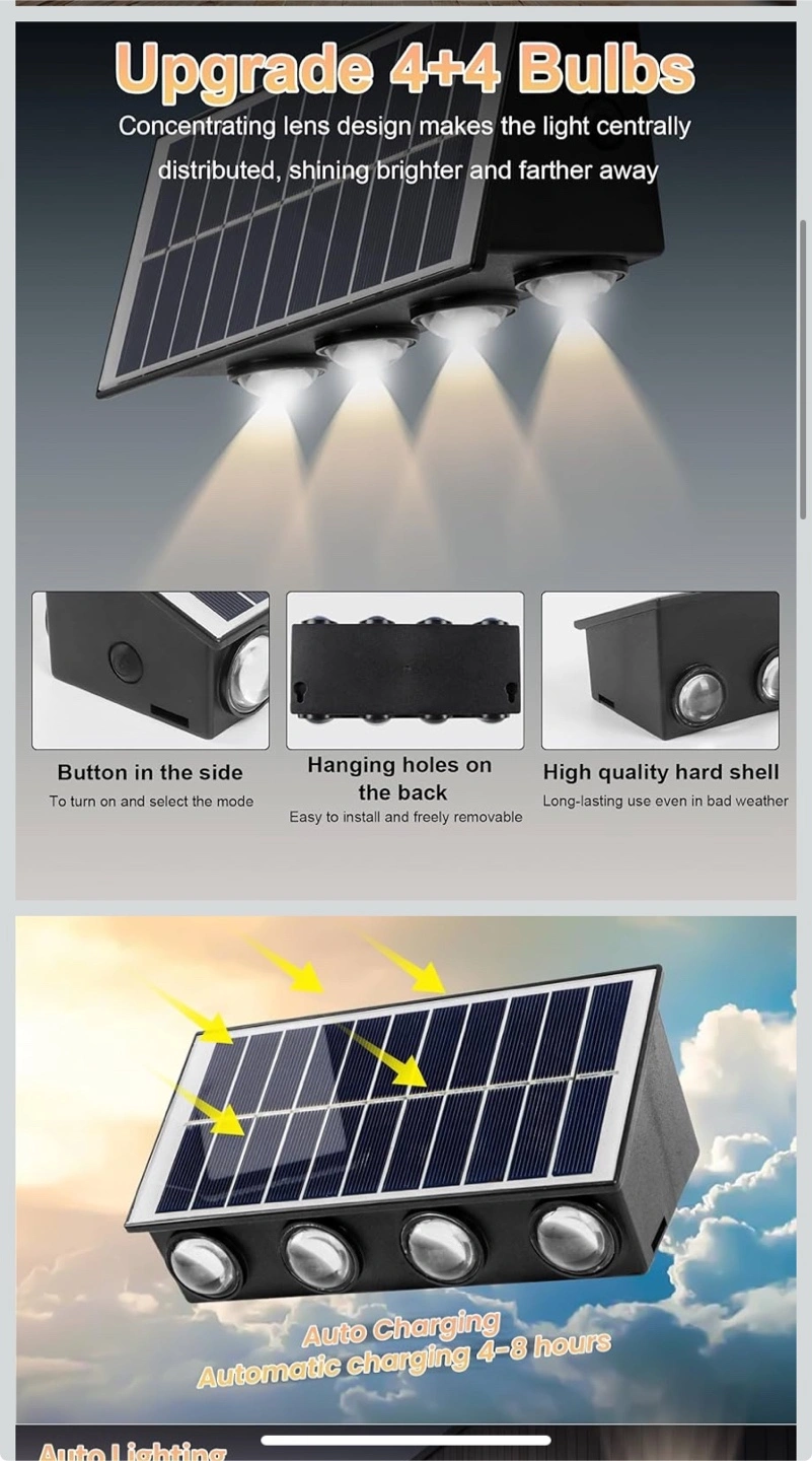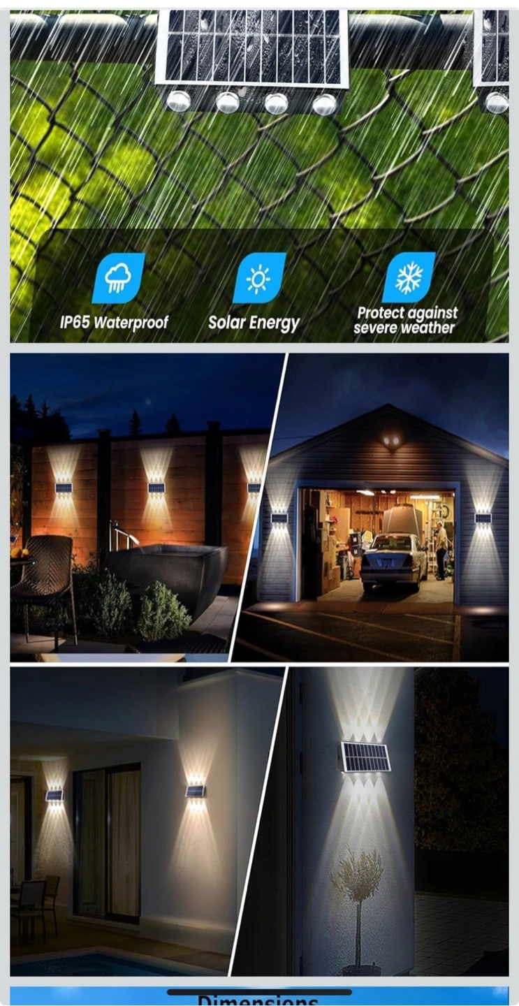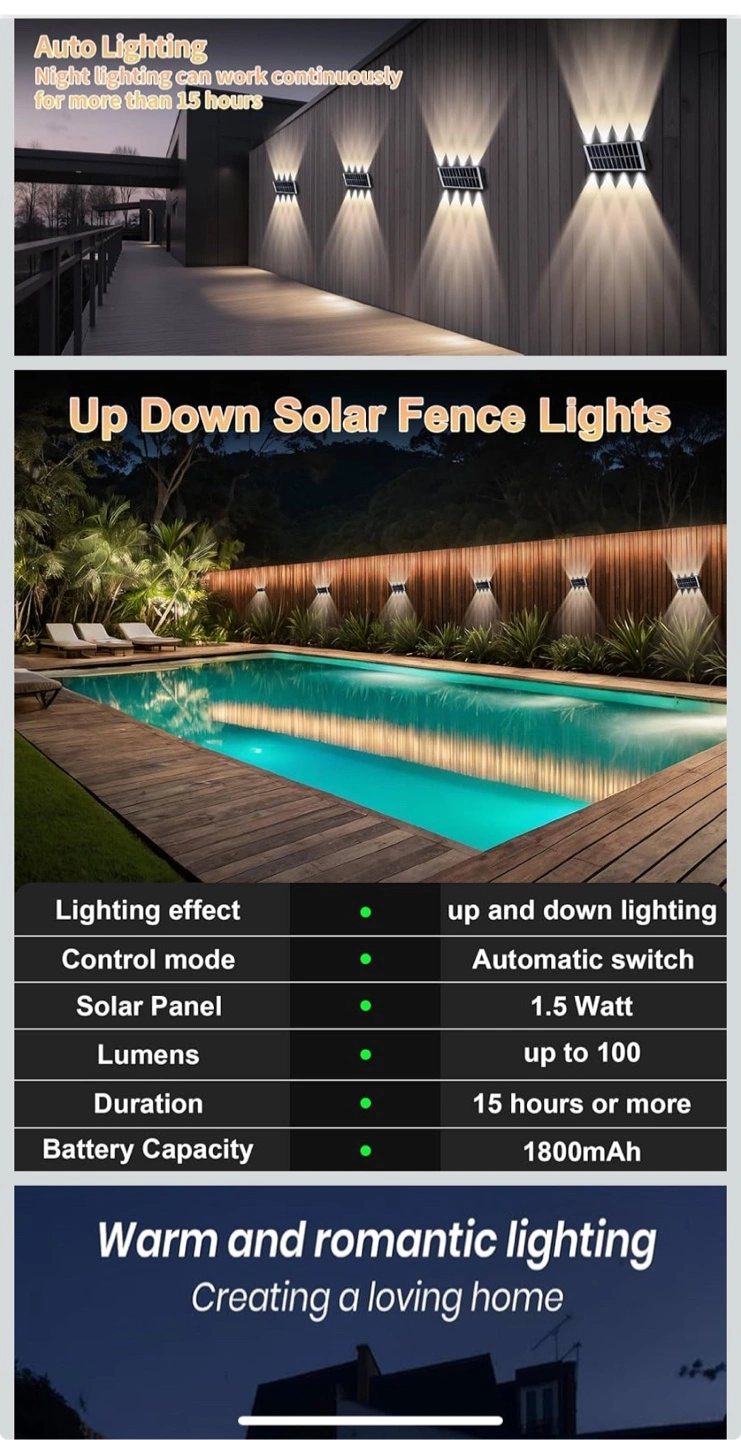Solar powered fence light. IP65 waterproof. Weather resistant. Four LED lights. Easy installation. Auto charging and lighting.