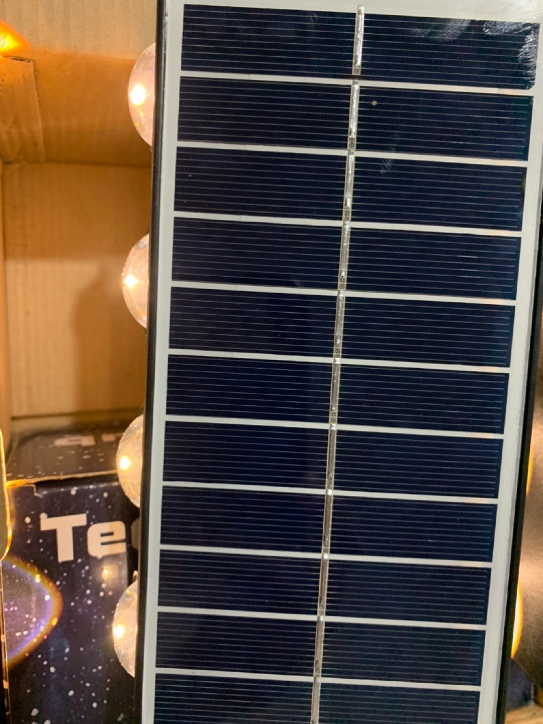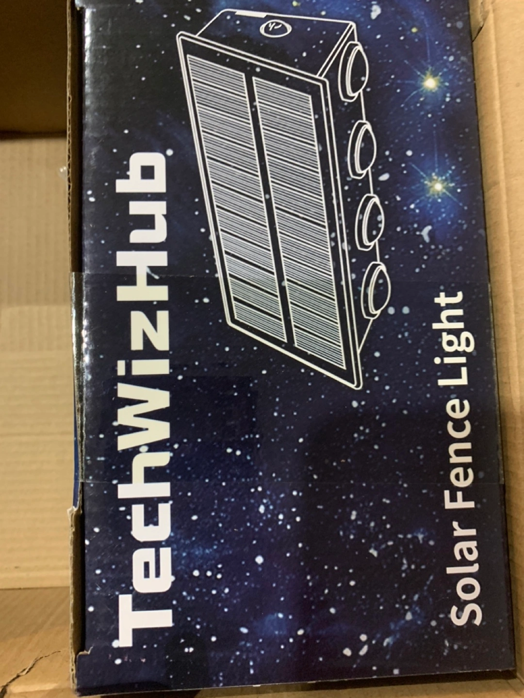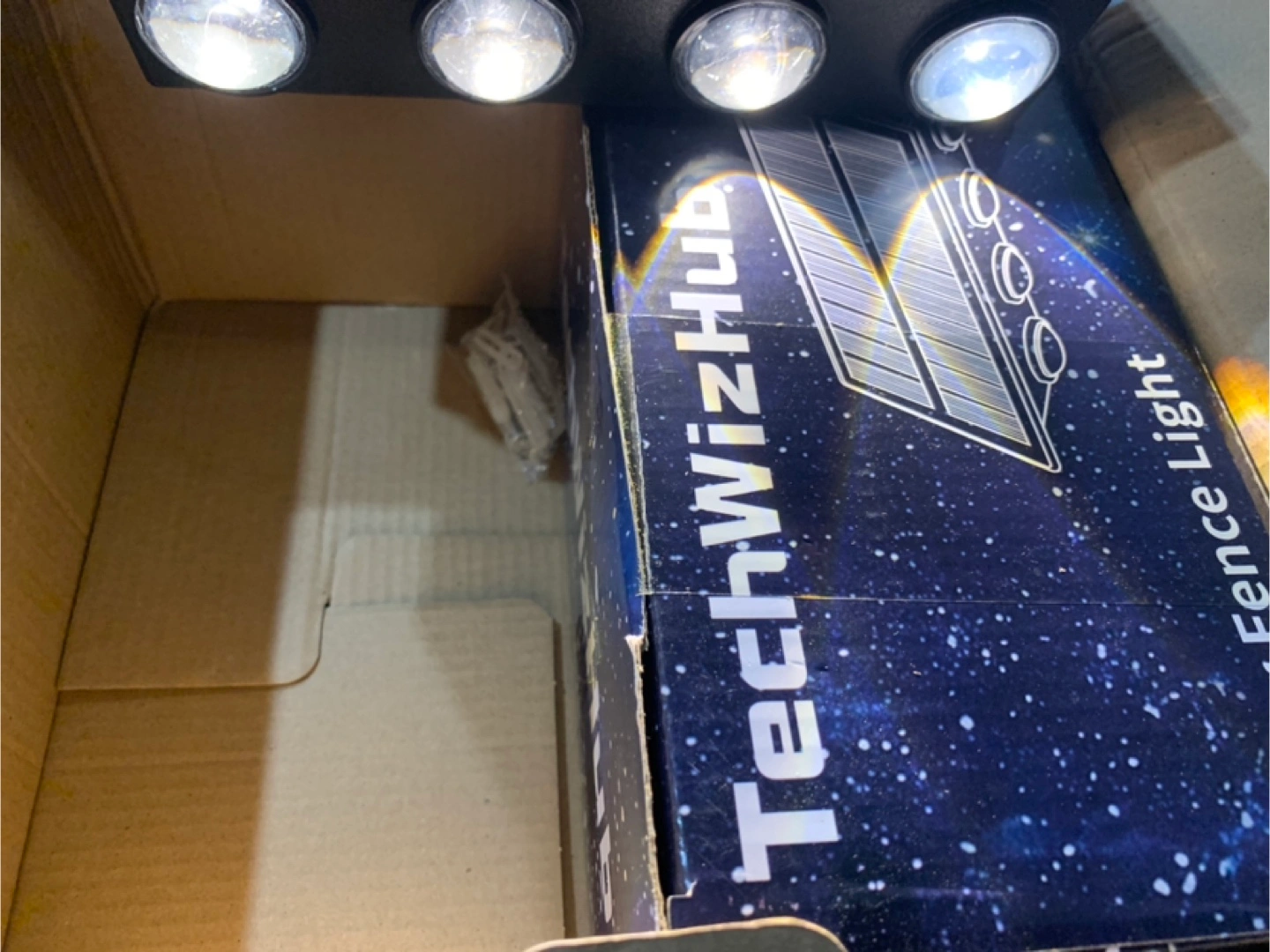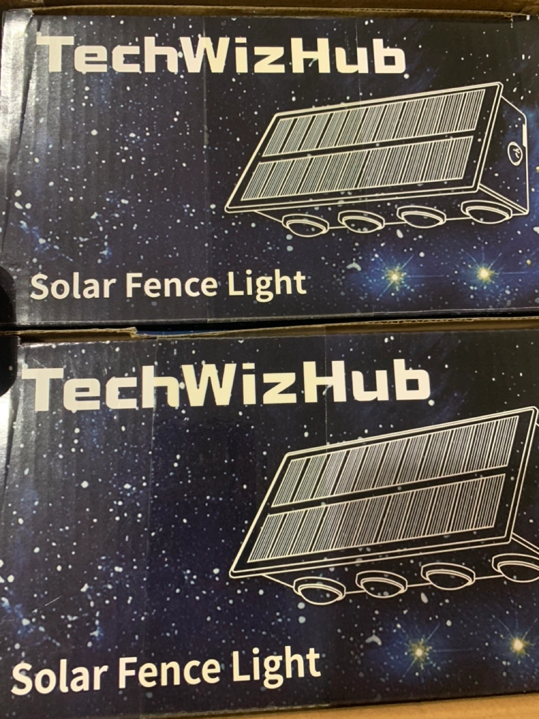 Solar powered fence light. IP65 waterproof. Weather resistant. Four LED lights. Easy installation. Auto charging and lighting.