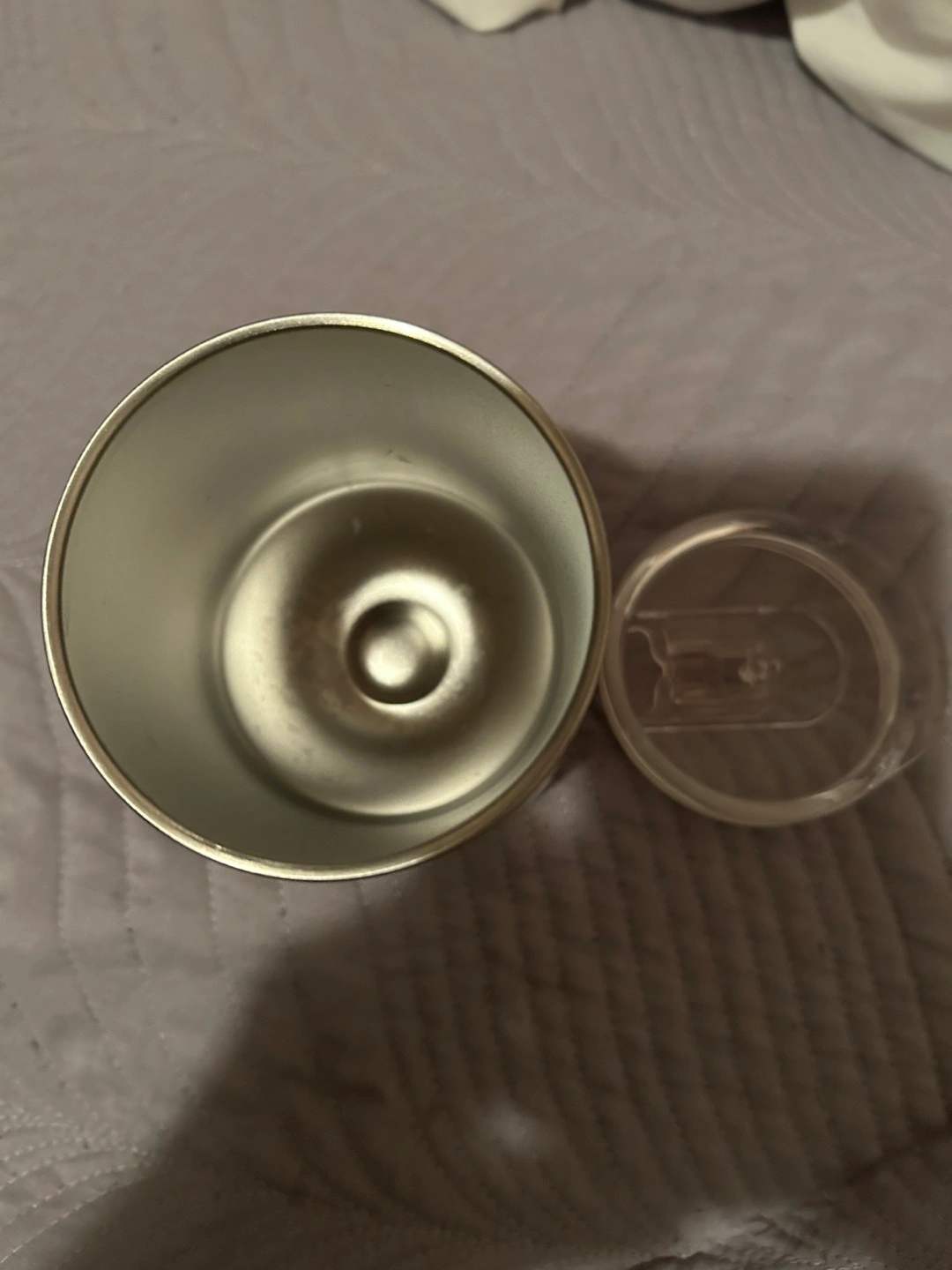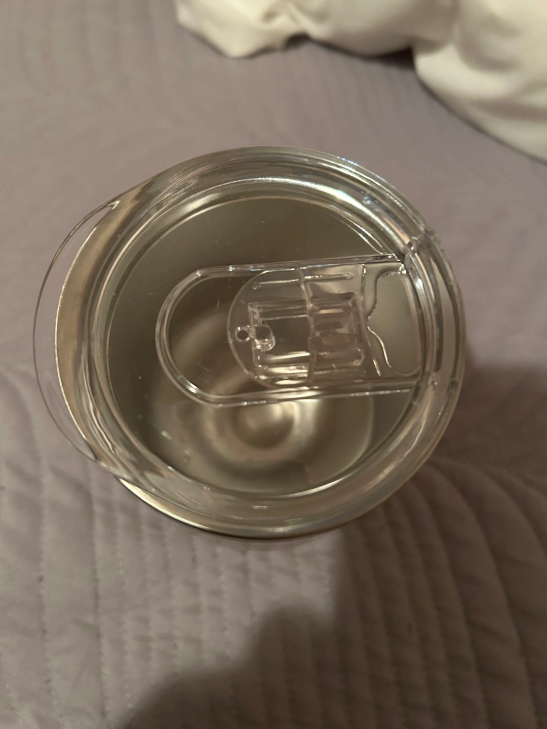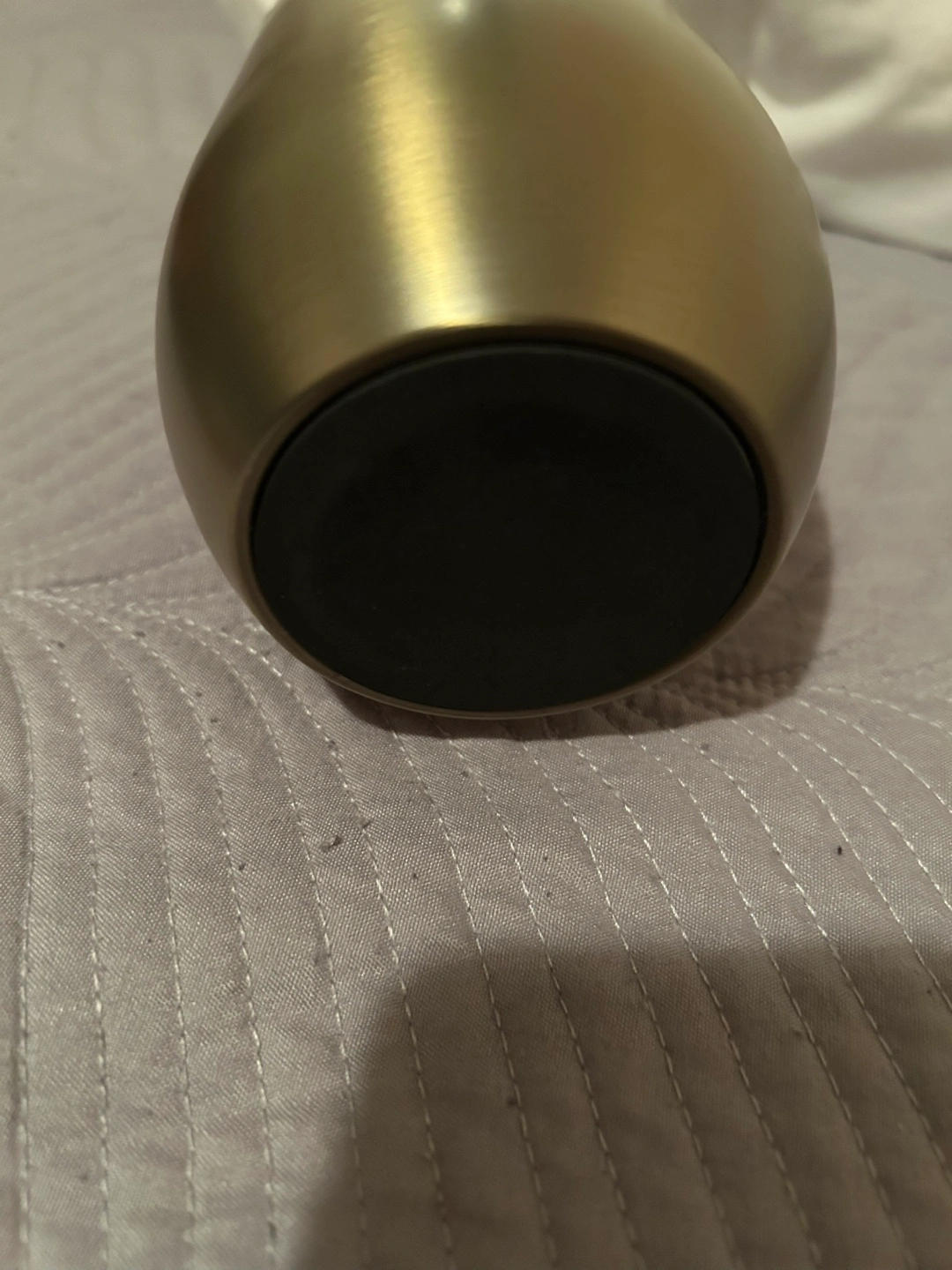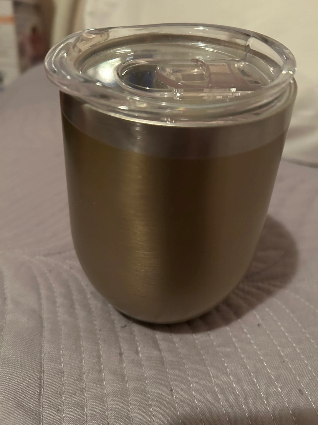 New ,Reusable coffee or tea tumbler. Features a gold coloured stainless steel body, clear plastic lid, and a black rubber base. Keeps your drinks cold or hot.