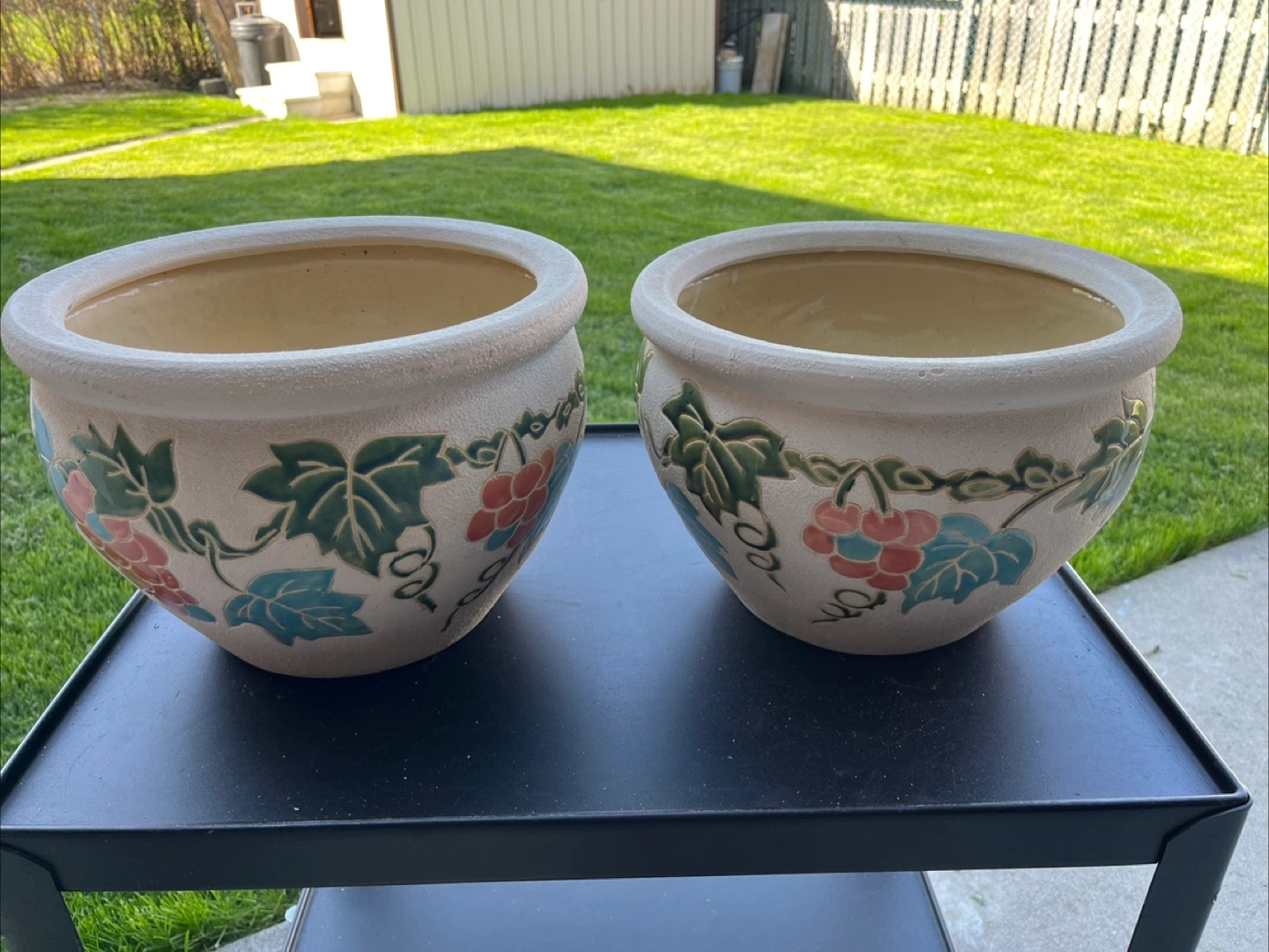 Two lovely ceramic planters. Round shape. Cream coloured base with grapevine and berry design. Perfect for indoor or outdoor plants. $15 each $30 for pair.