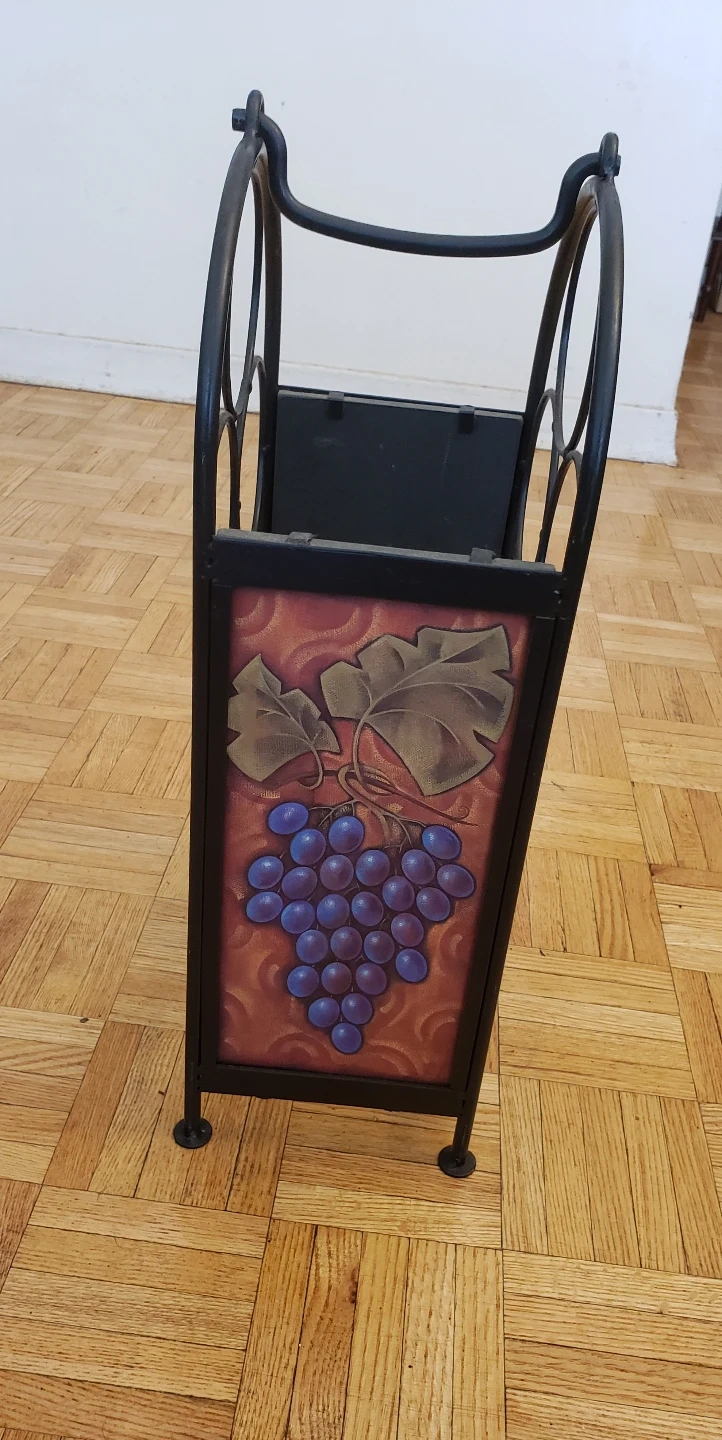 Freestanding metal wine rack. Holds approximately seven bottles. Features decorative grape design. Black metal frame.