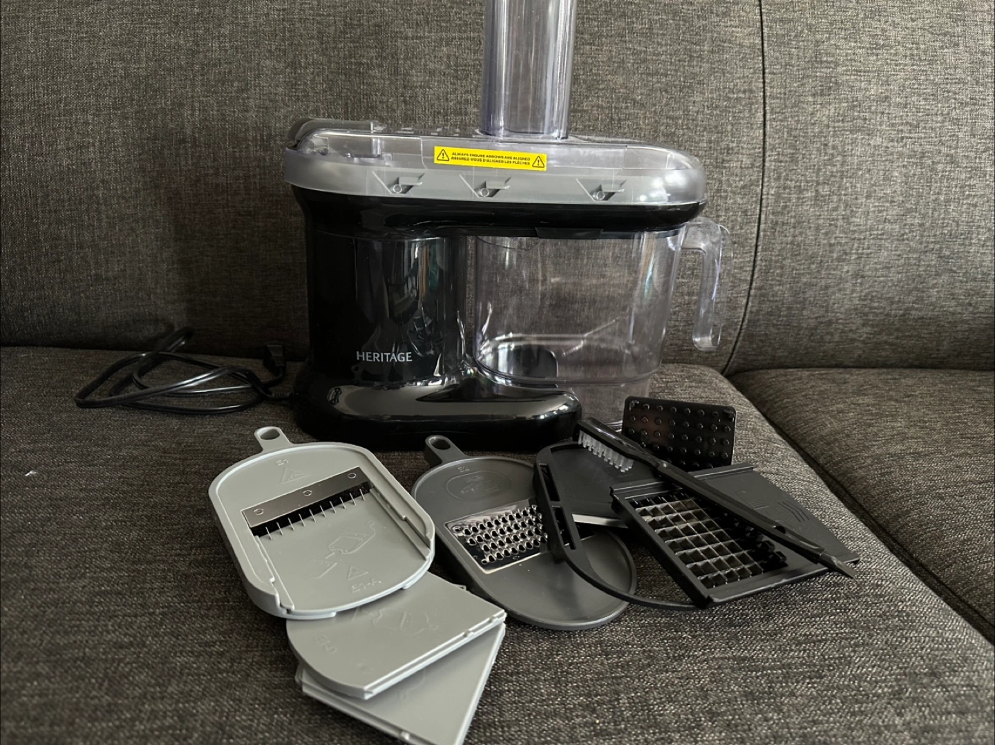 Electric food mandoline/slicer. Seven interchangeable blades. Includes cleaning brush. Black and grey. Used once as I got another food processor as a gift. Cash only