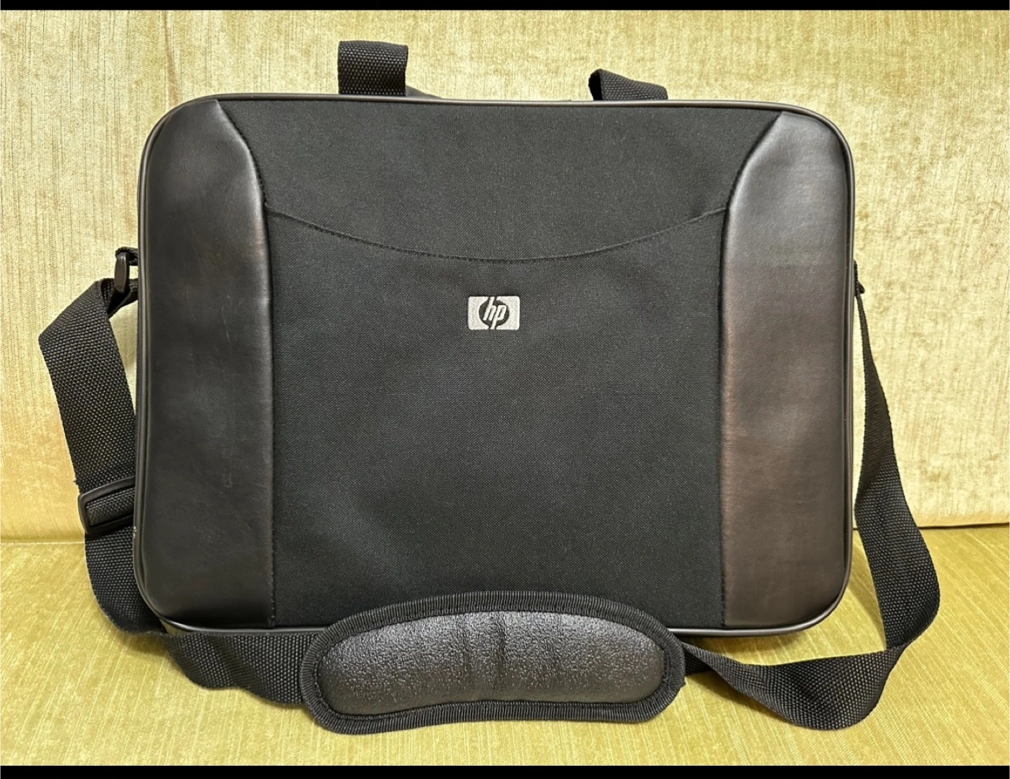 Black laptop bag with an adjustable shoulder strap and a top handle. It features an HP logo on the front.