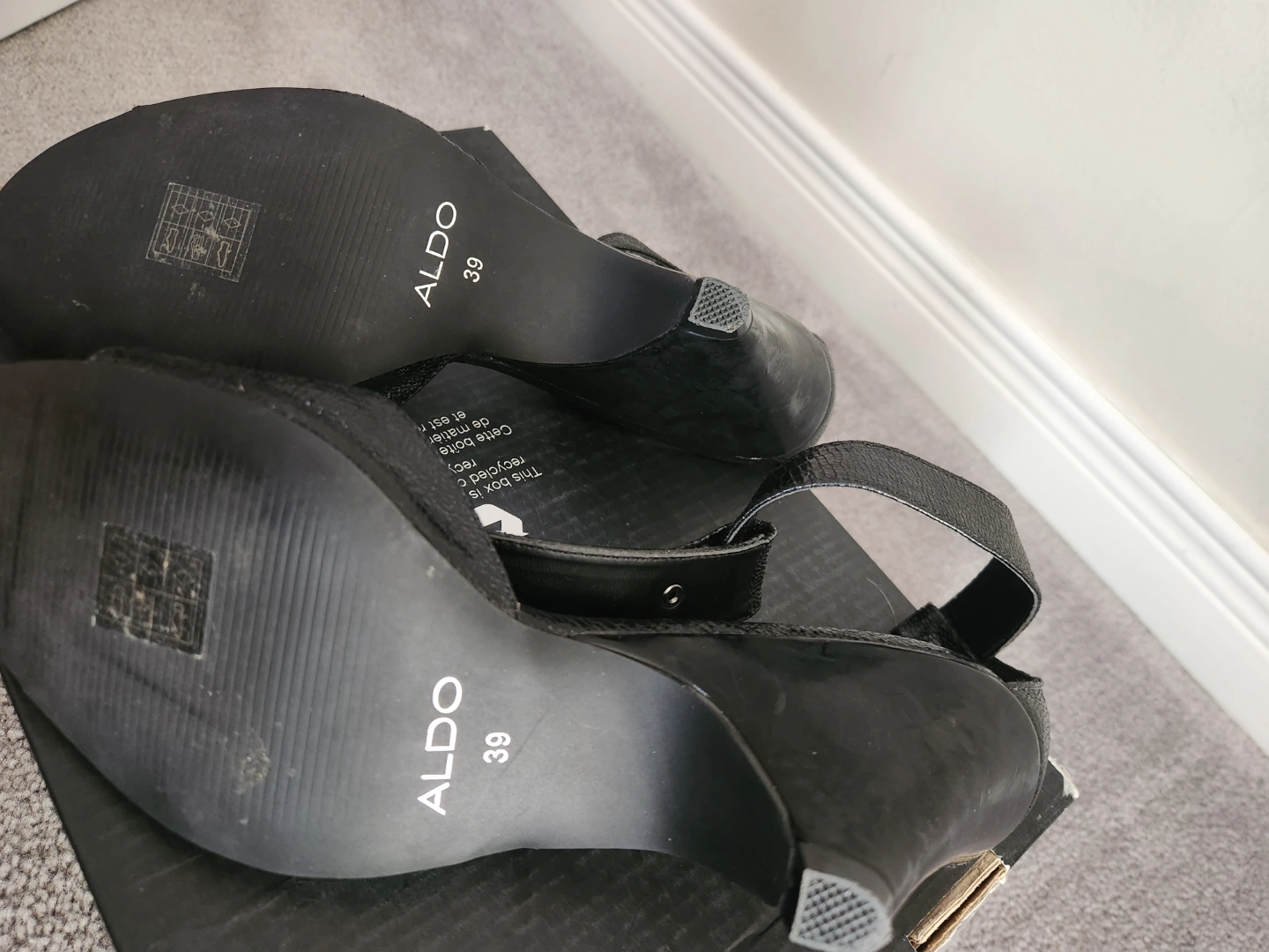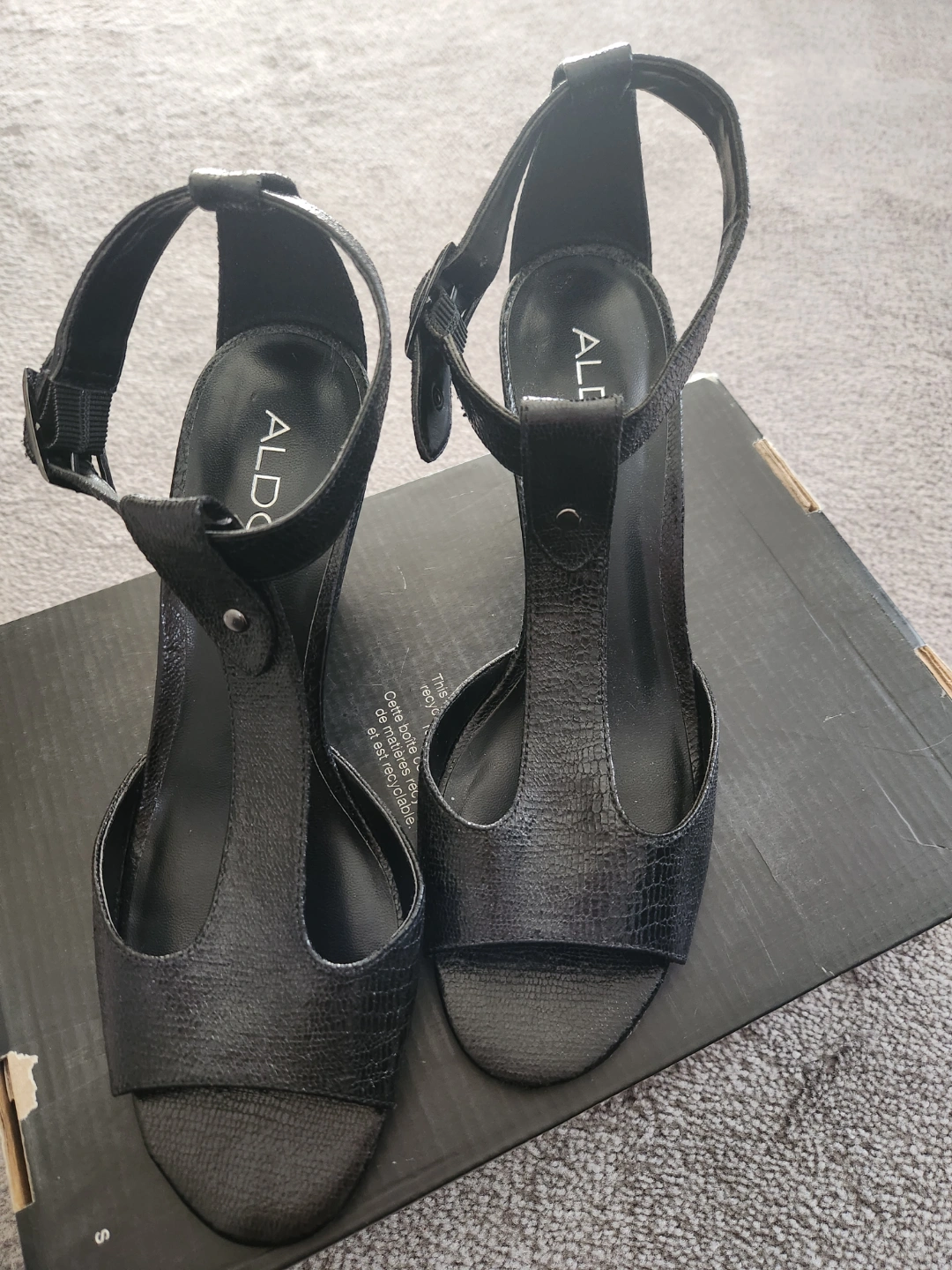 Elegant black sandals. T-strap design. Wedge heel. Size 39. Great for evening wear or special occasions. Fits more like an 8.5.