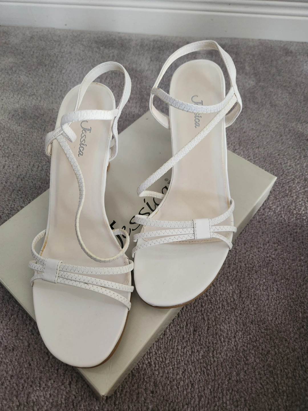 White leather-look sandals. Low heel. Size 8. Sold in original box. Never worn.