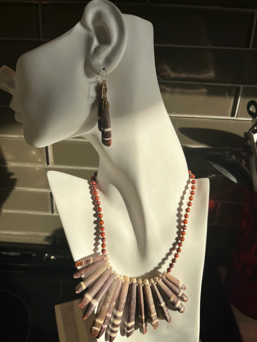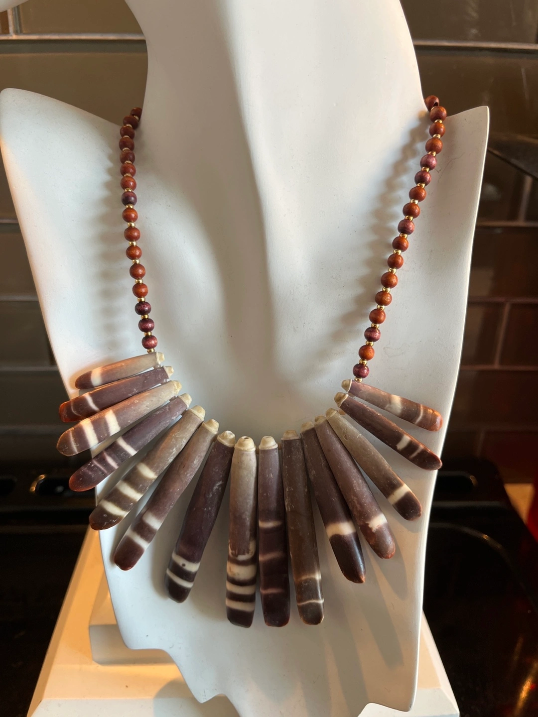 Stunning statement necklace. Features a fan of dark brown and white striped natural sea urchin spikes . Brown wooden beads complete the look. Secure clasp. You can pick up by Carlton and Jarvis area