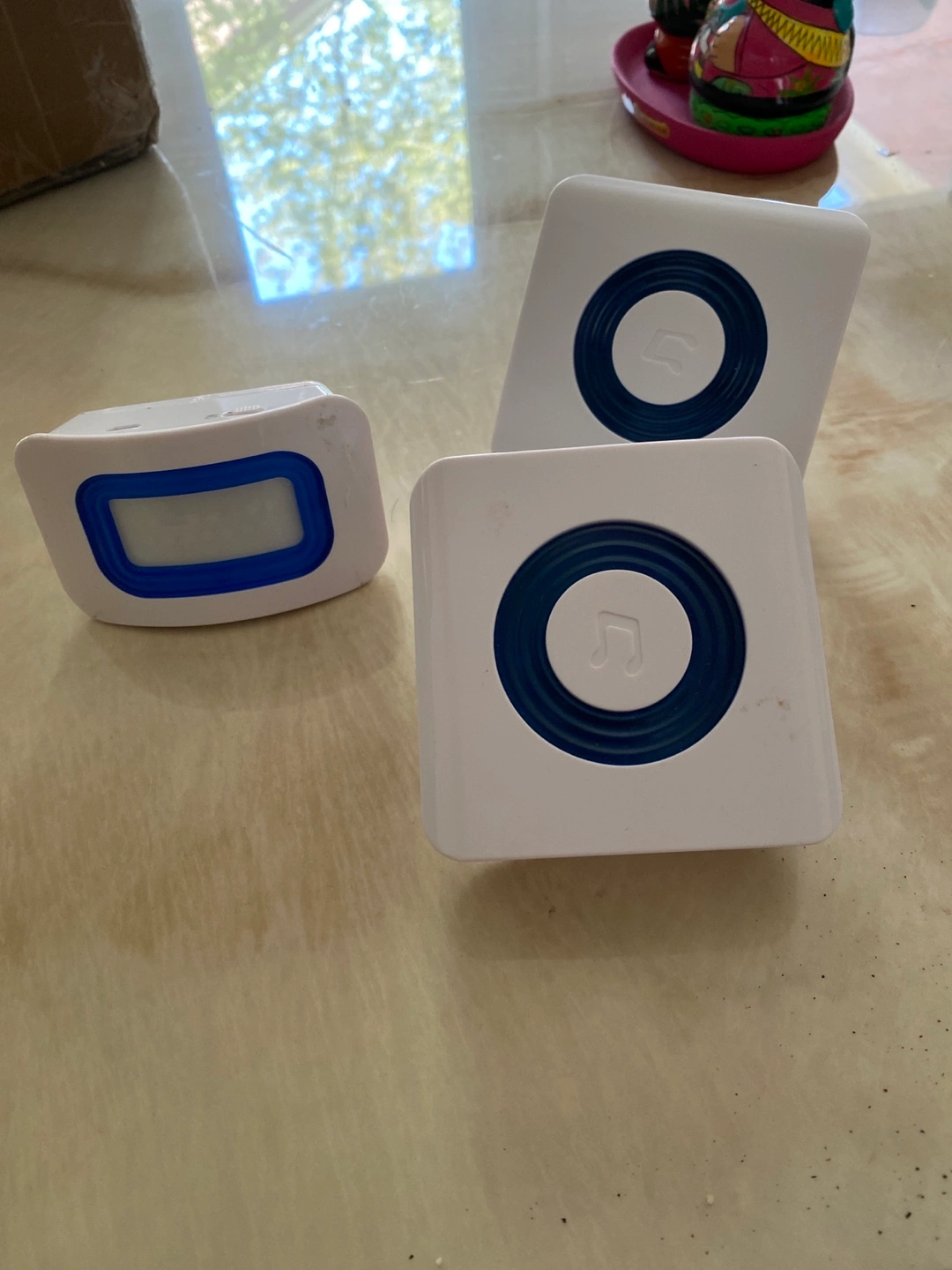Three-piece wireless doorbell system. Includes two receivers and one motion sensor. Easy setup for home security.