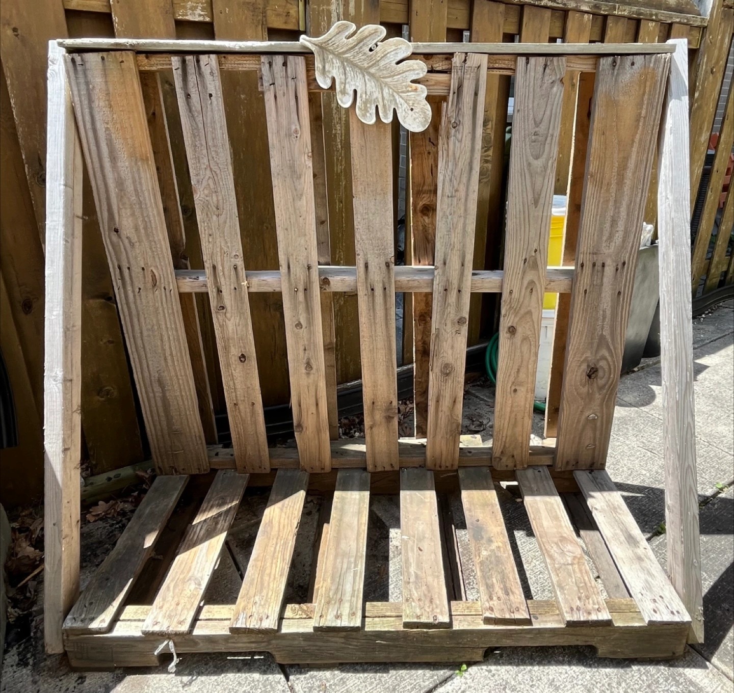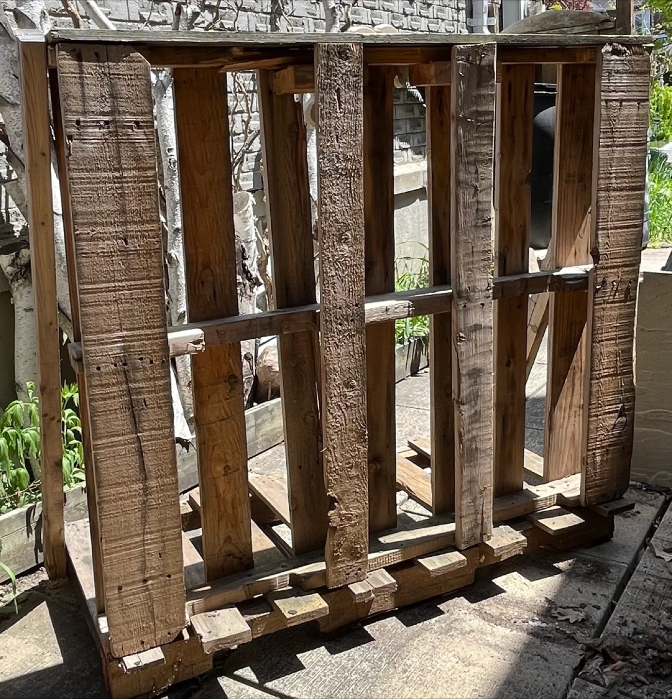 Repurposed wooden pallet. Great for storage or display. Shows wear from previous use. Could use some touch-ups. 2 shelves. Sturdy construction. Used to display plants. Versatile - be CREATIVE! Solid stone fig leaf included.