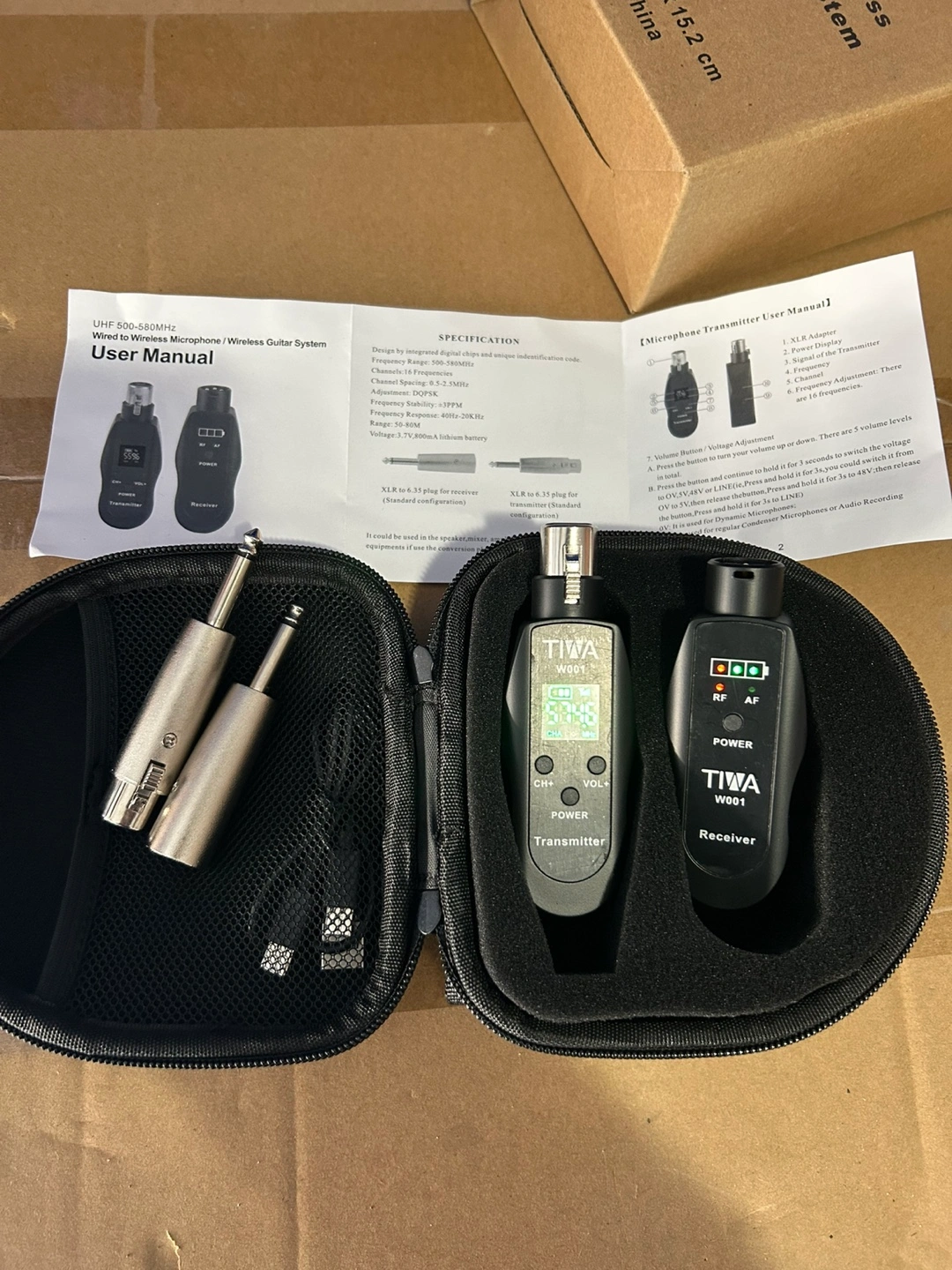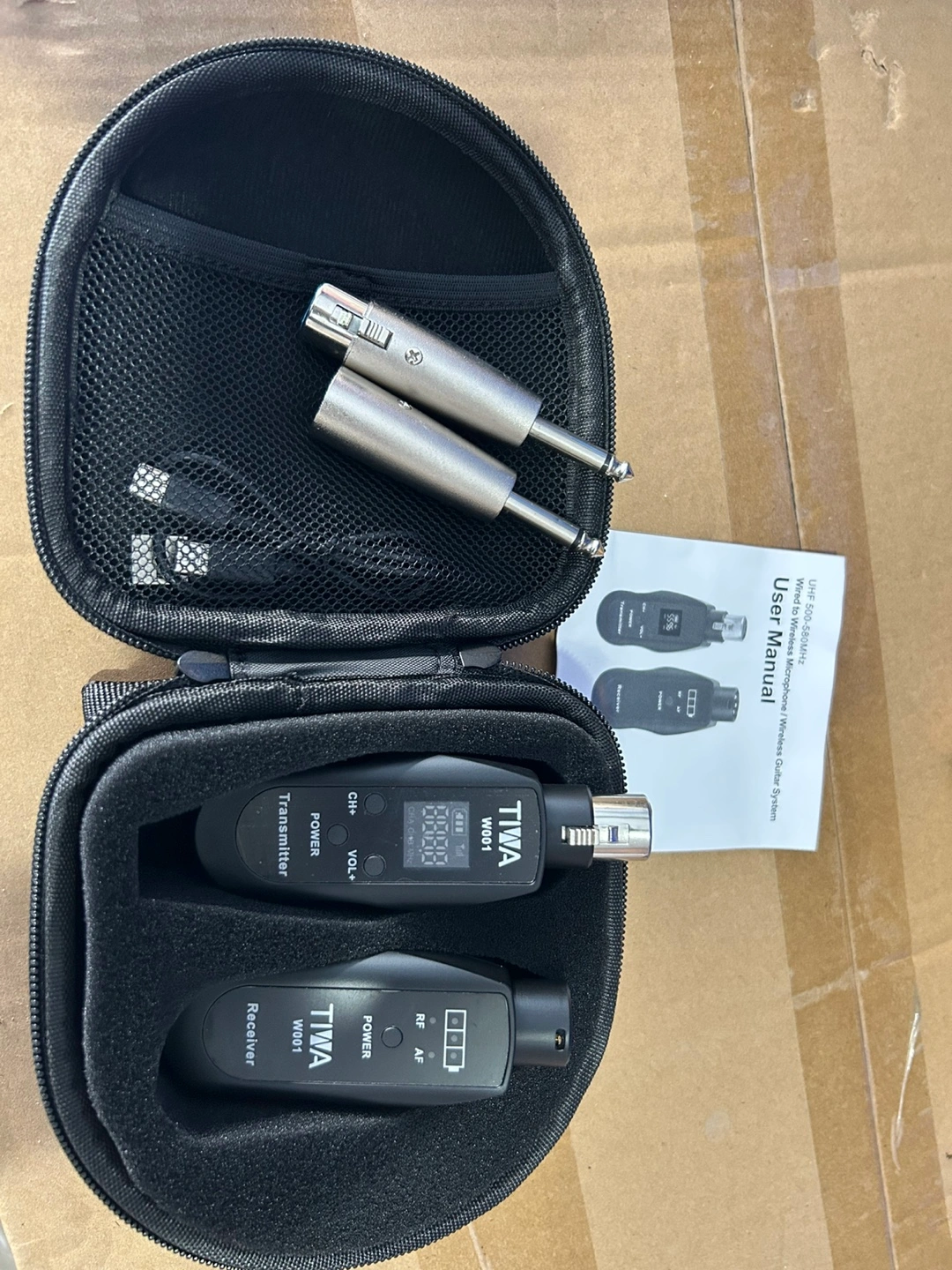 Wireless microphone transmitter and receiver set. Includes carrying case and user manual. Ideal for musicians or presenters.