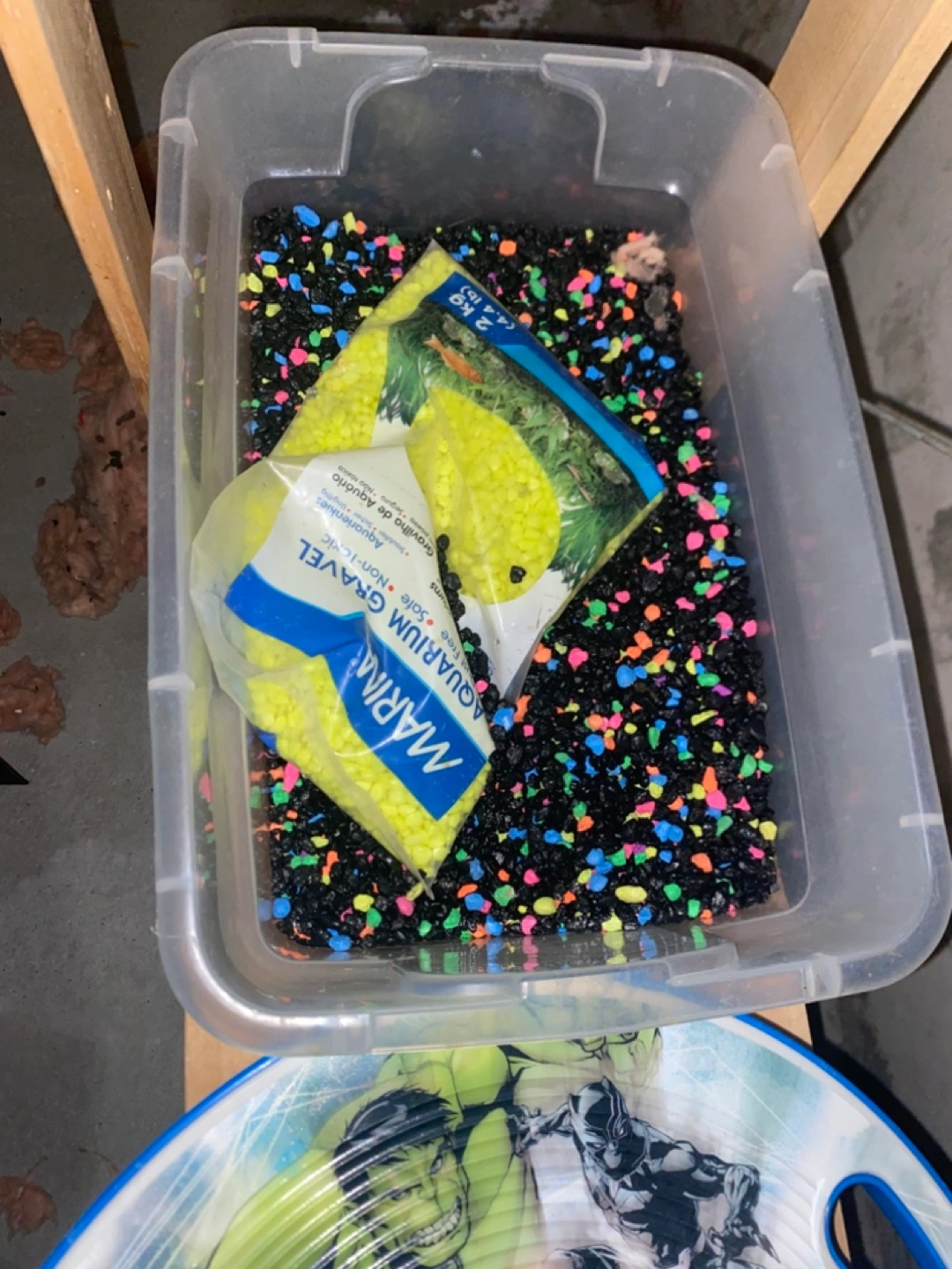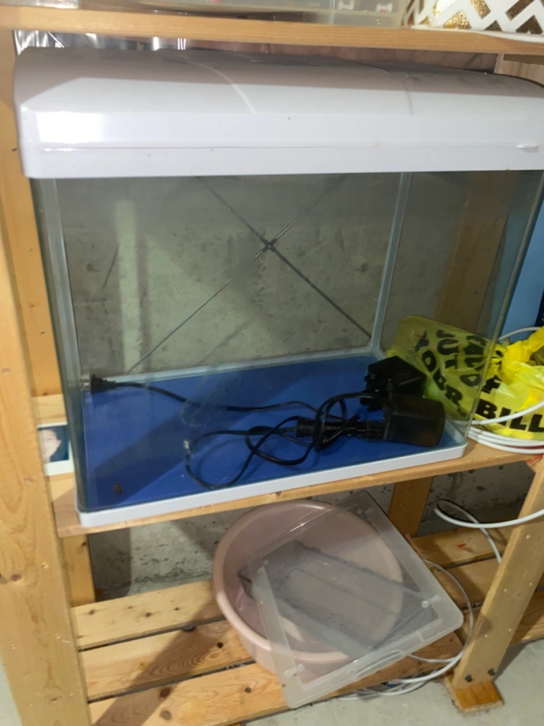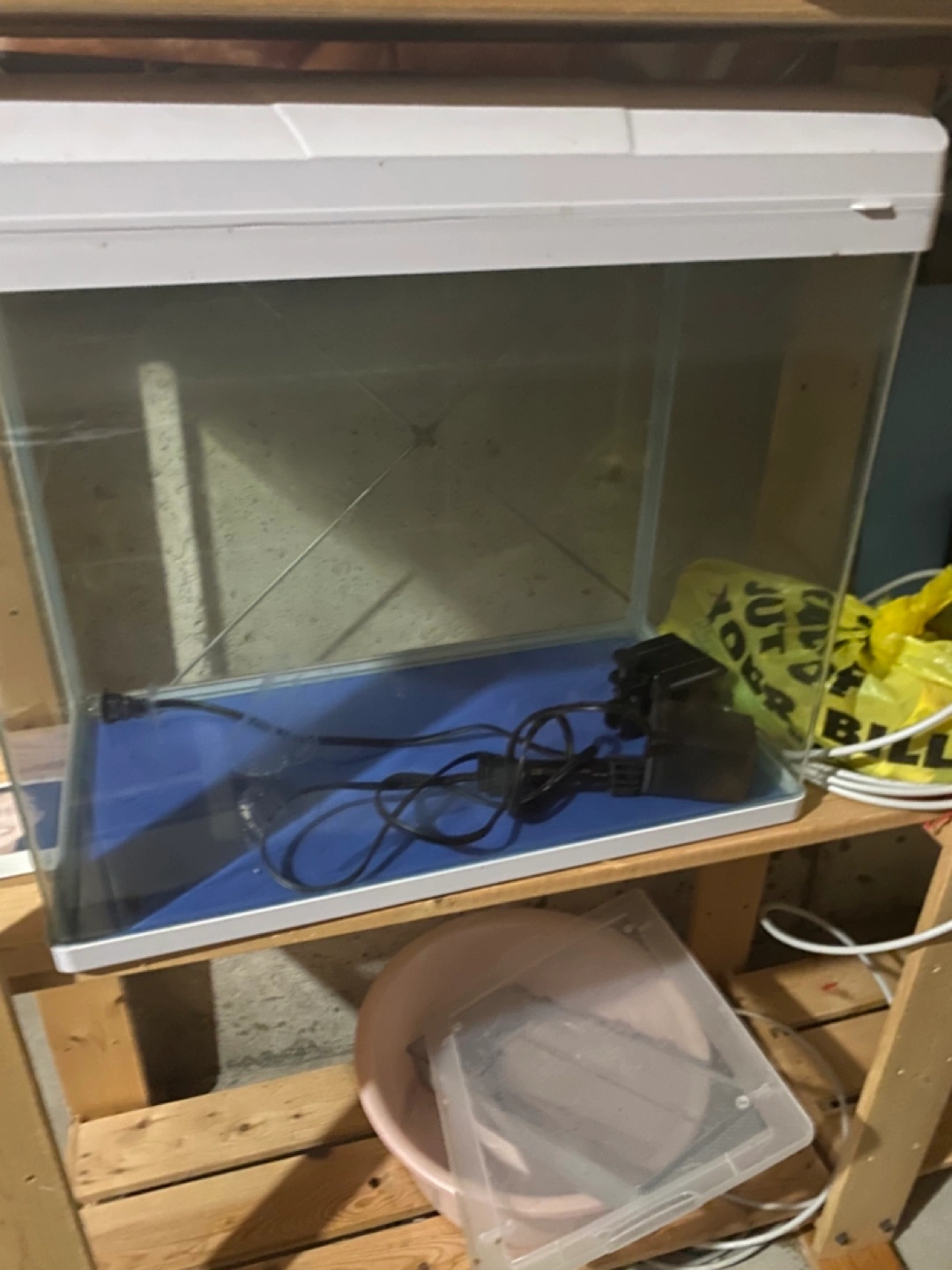 Medium sized aquarium, white frame, clear glass. Includes filter pump. Blue mat at the bottom. Pre-owned, minor cosmetic imperfections possible. Comes with rocks