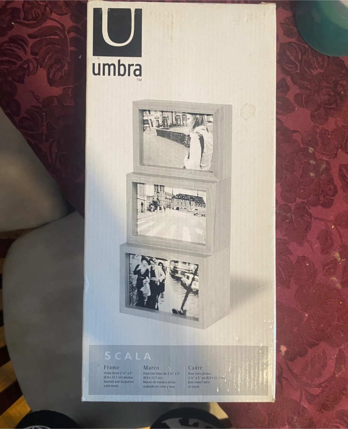 New in box. Three-photo frame. Stained and lacquered solid wood. Holds three 3 1/2" x 5" photos. Great for displaying favourite memories. Very good condition( never used) Cash only One for $10 Two for $20
