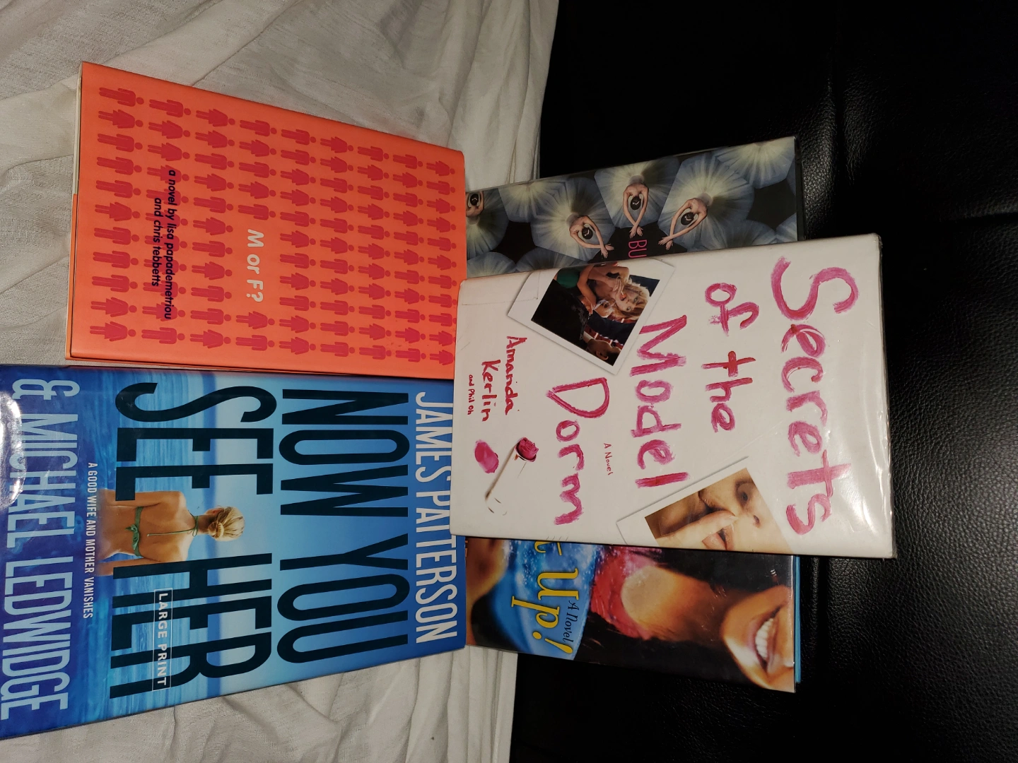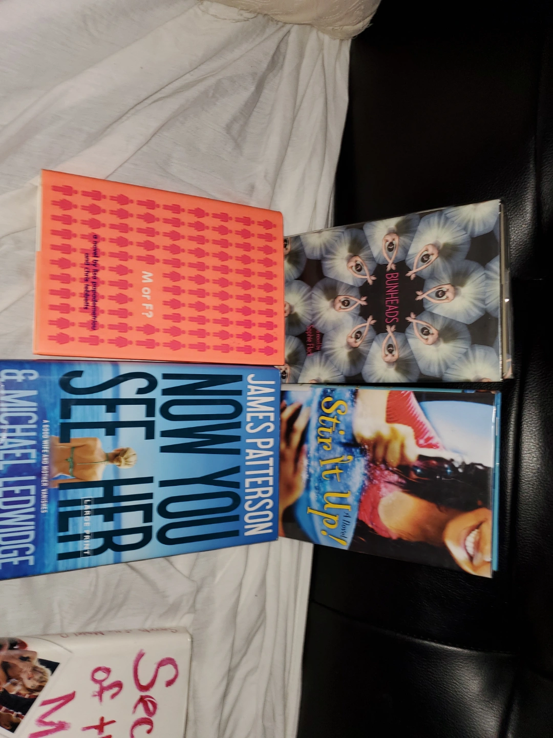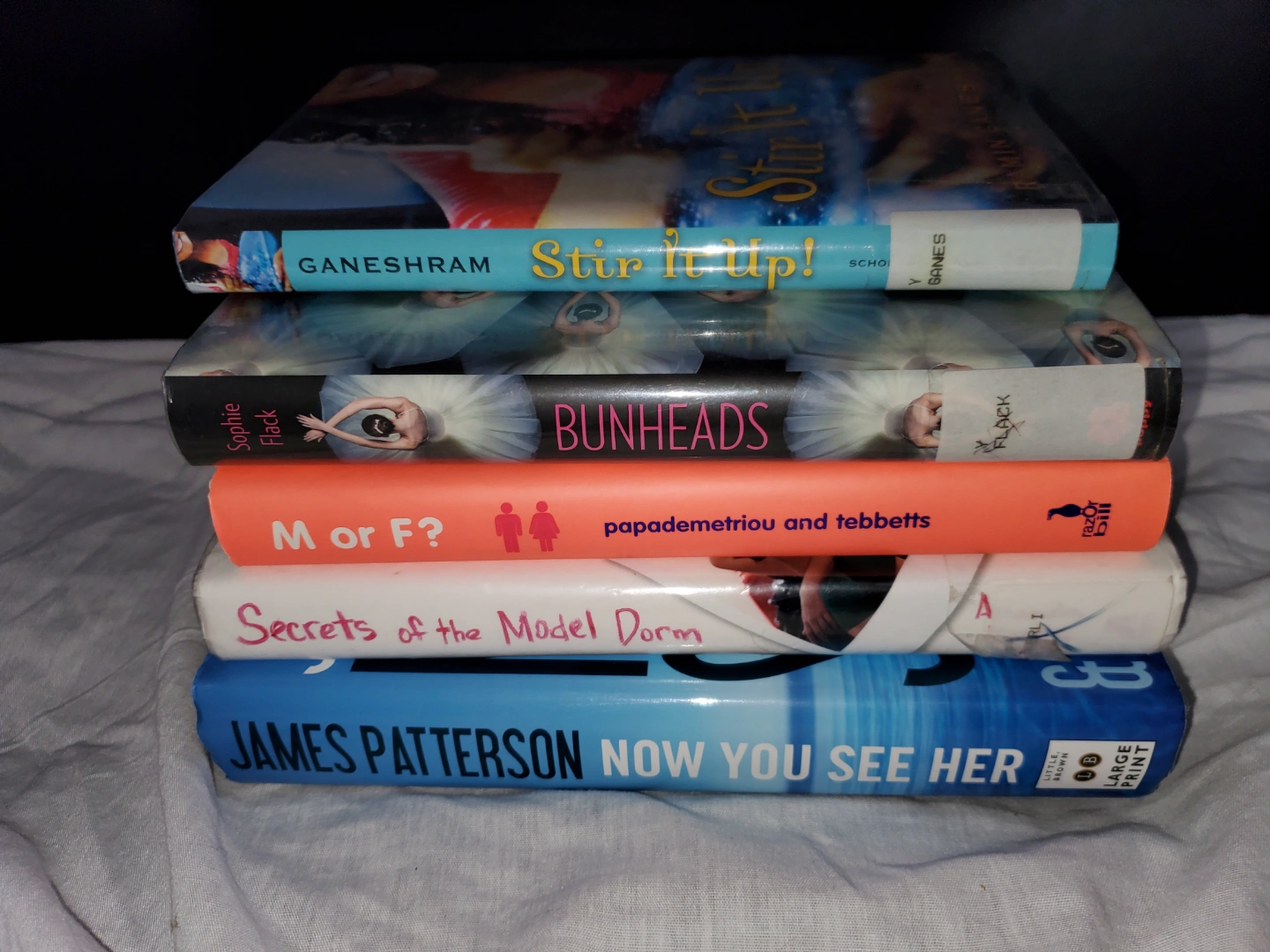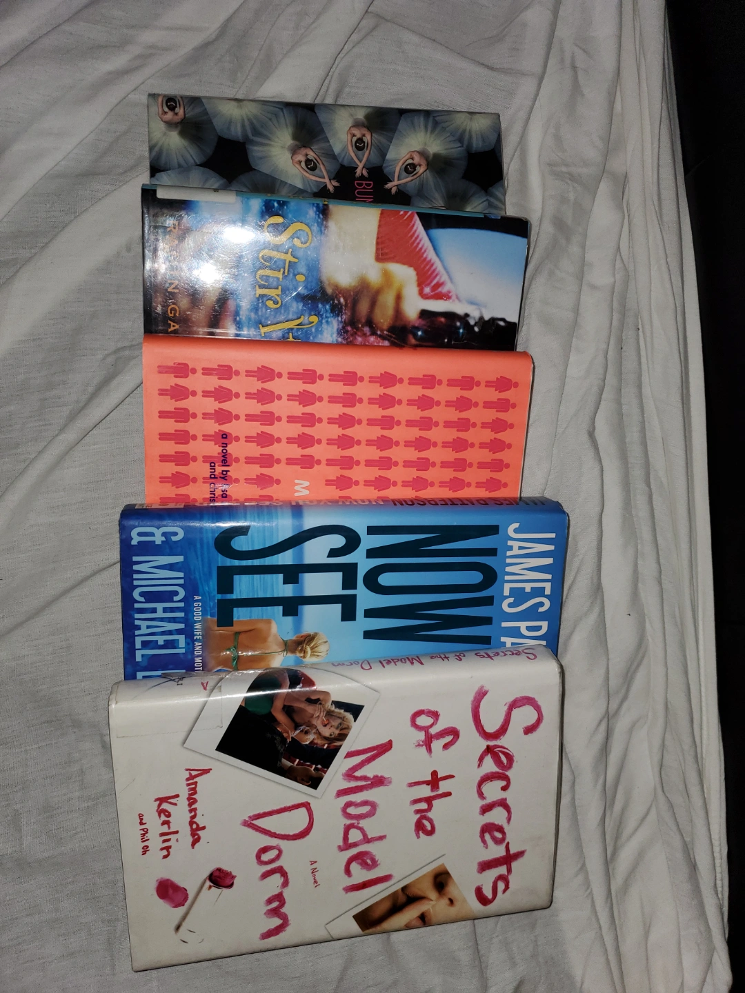 Bundle of five novels. Authors include James Patterson, Amanda Kerlin, Sophie Flack, and more. Various genres and conditions. Some are in almost new and some in good condition. Bunheads – $2.50 Dance-themed YA novel, unique niche, lightly worn copy. Stir It Up! – $2.00 Cultural fiction for younger readers; Scholastic imprint = decent quality. M or F? – $2.00 Older LGBTQ+ themed teen novel; niche interest but low resale demand. Secrets of the Model Dorm – $2.00 Less recognizable title, but still fun chick-lit for the right reader. Now You See Her by James Patterson – $4.00 Well-known author, thriller genre, large print edition (less common), good resale value if in nice condition.