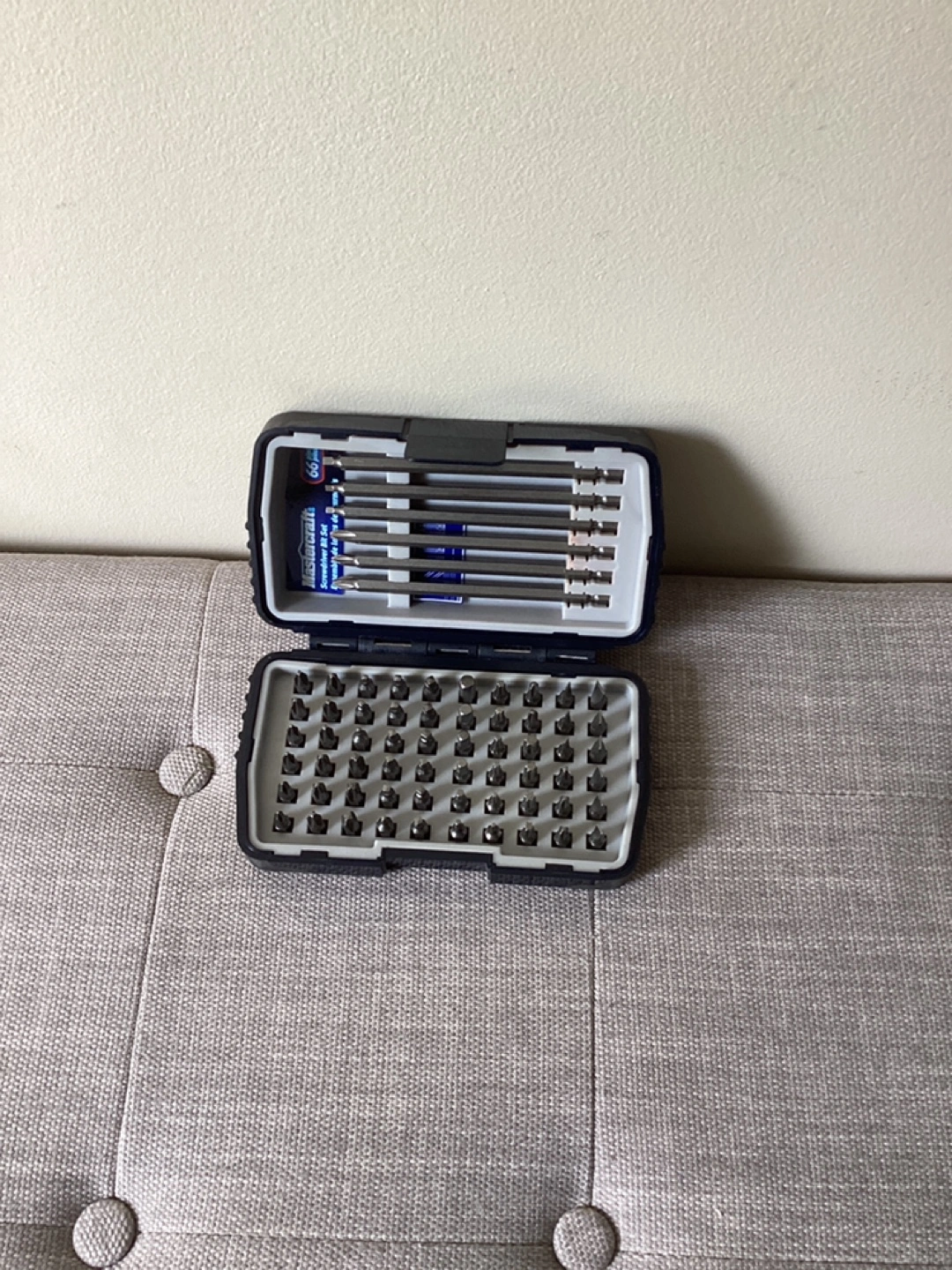 Complete set of screwdriver bits. Various sizes and types. Convenient storage case. Great for home repairs and projects.
