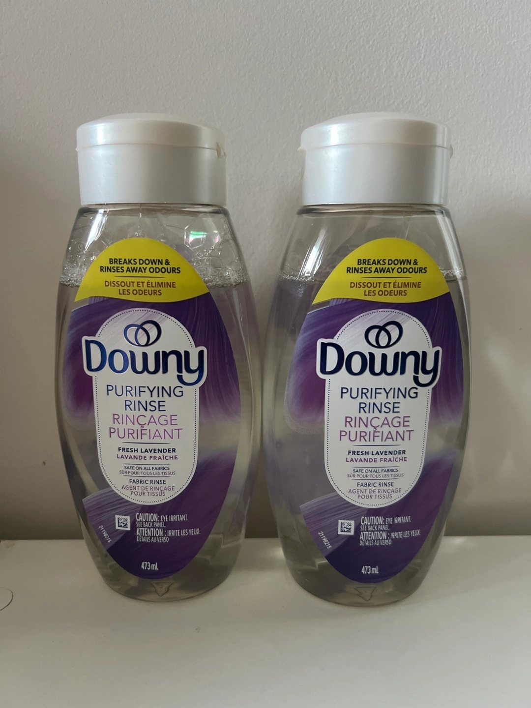 Two bottles of Downy Purifying Rinse in Fresh Lavender. Safe for all fabrics. Breaks down and rinses away odours. 473ml each. $6 for 1 or $10 for both