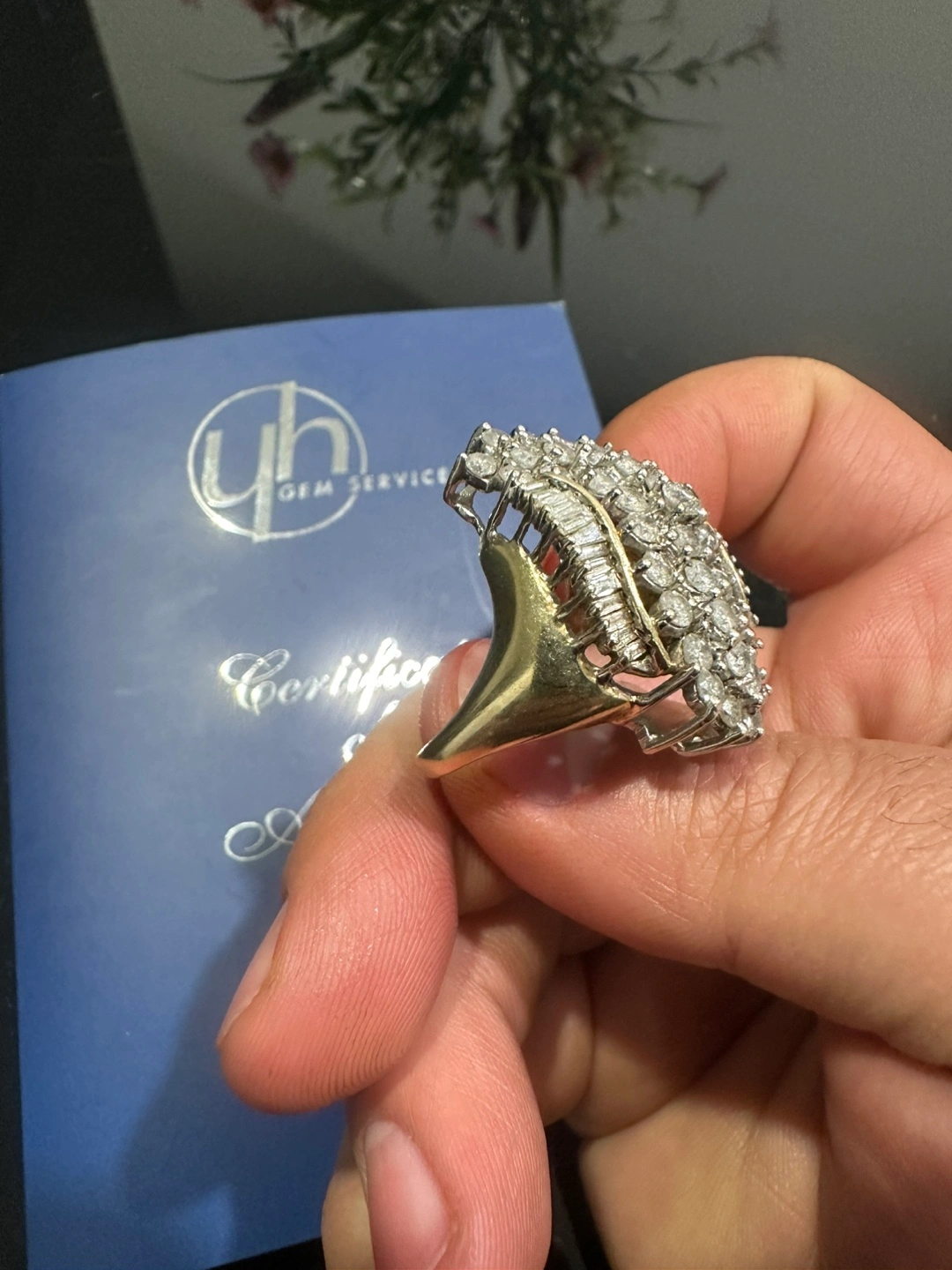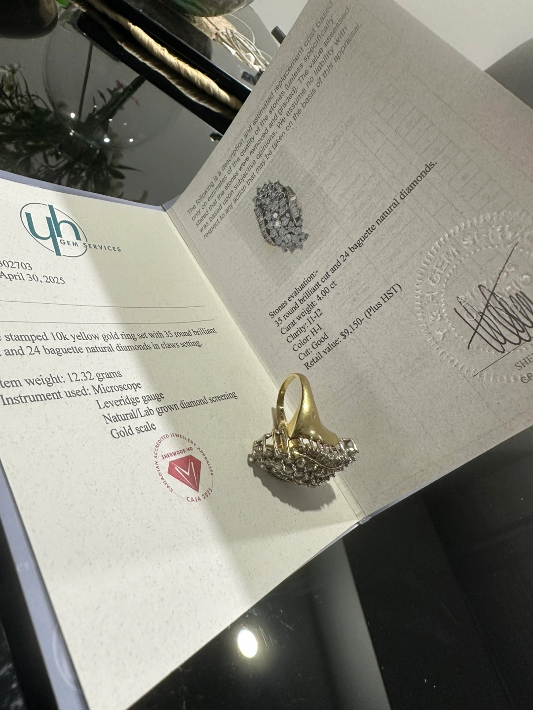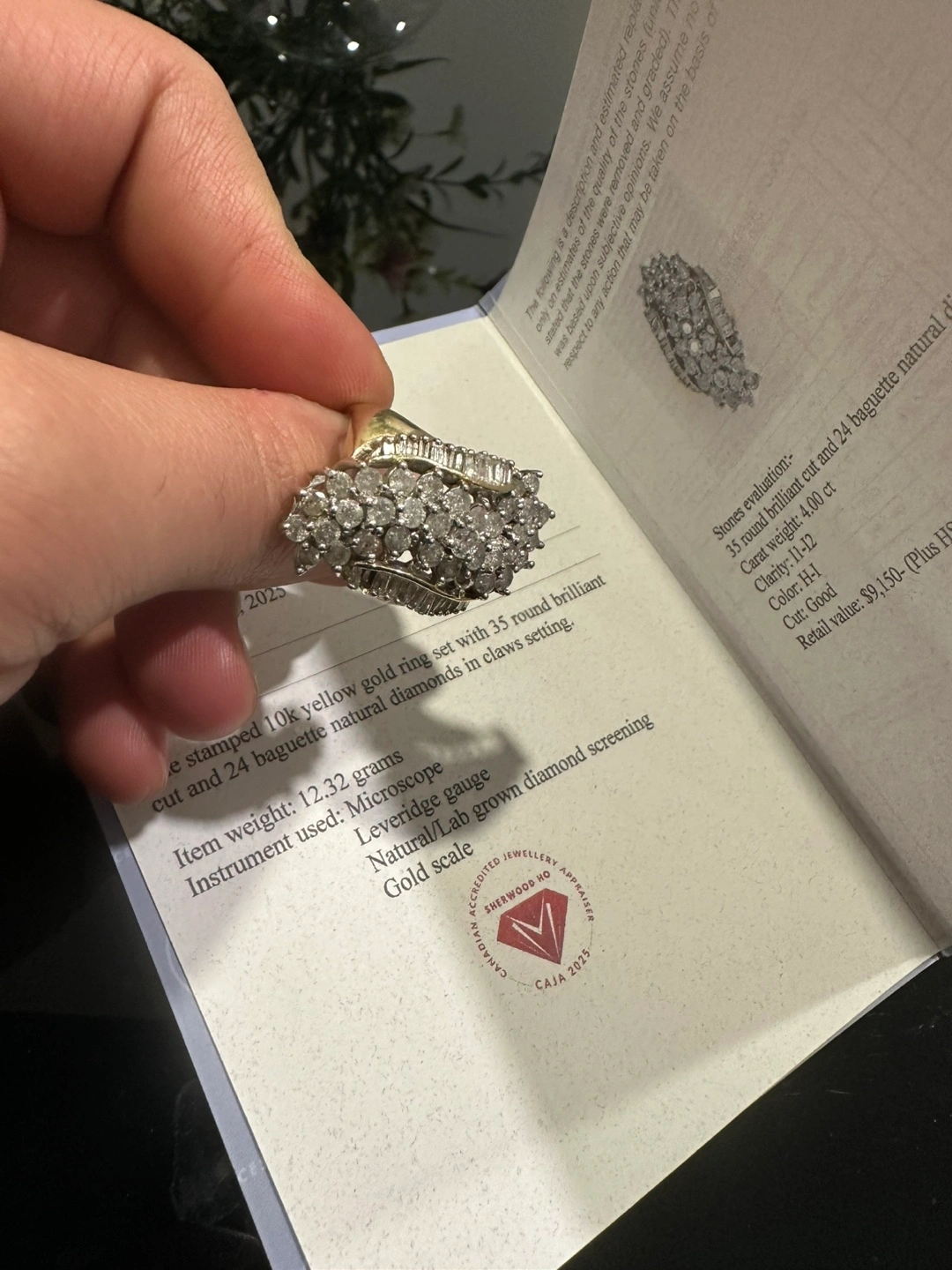 Stunning 10k yellow gold ring. Features 35 round brilliant cut and 24 baguette natural diamonds. Set in a claw setting. Approximately 12.32 grams. Comes with appraisal.