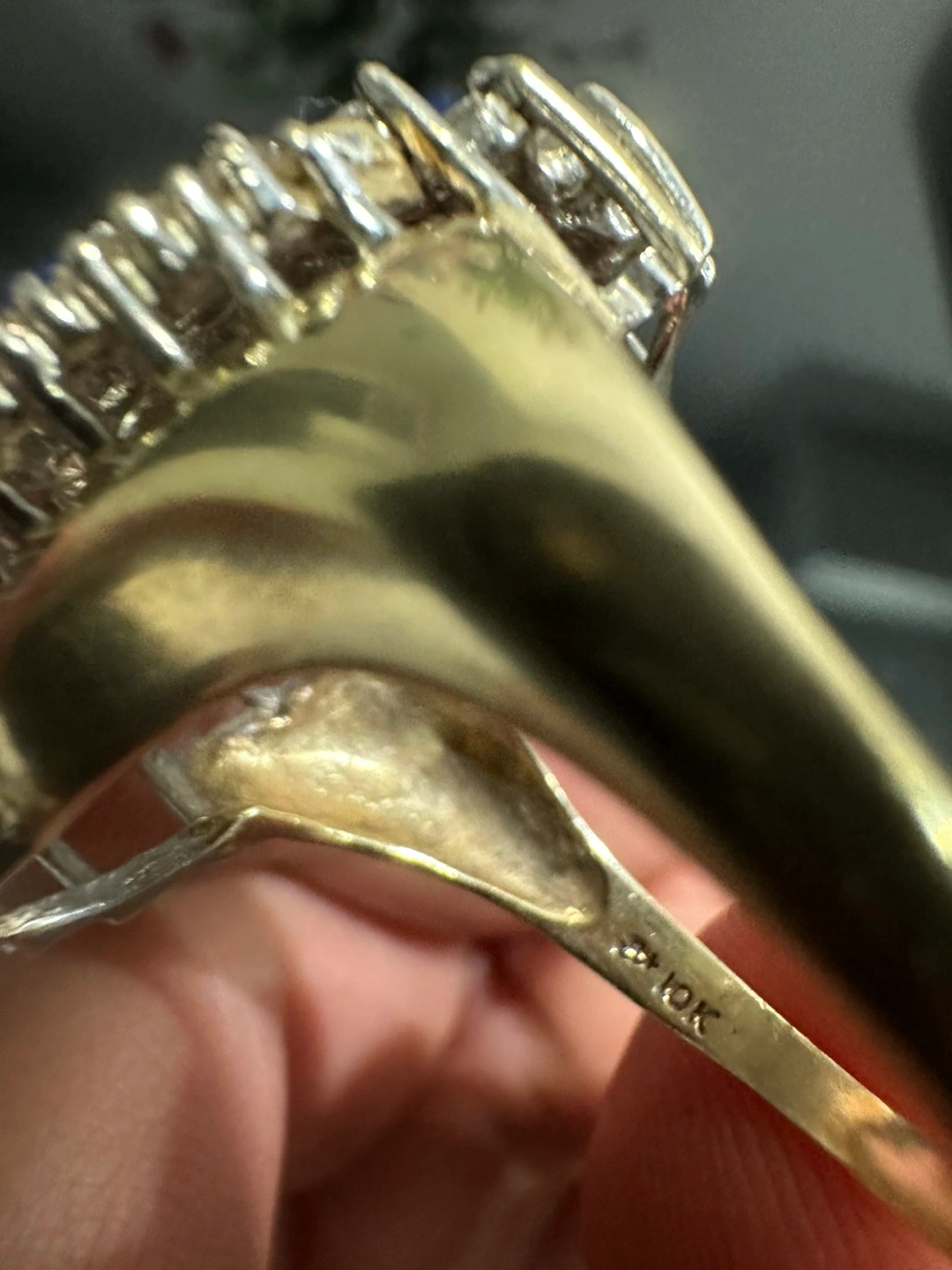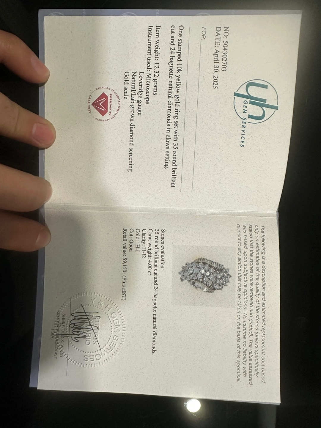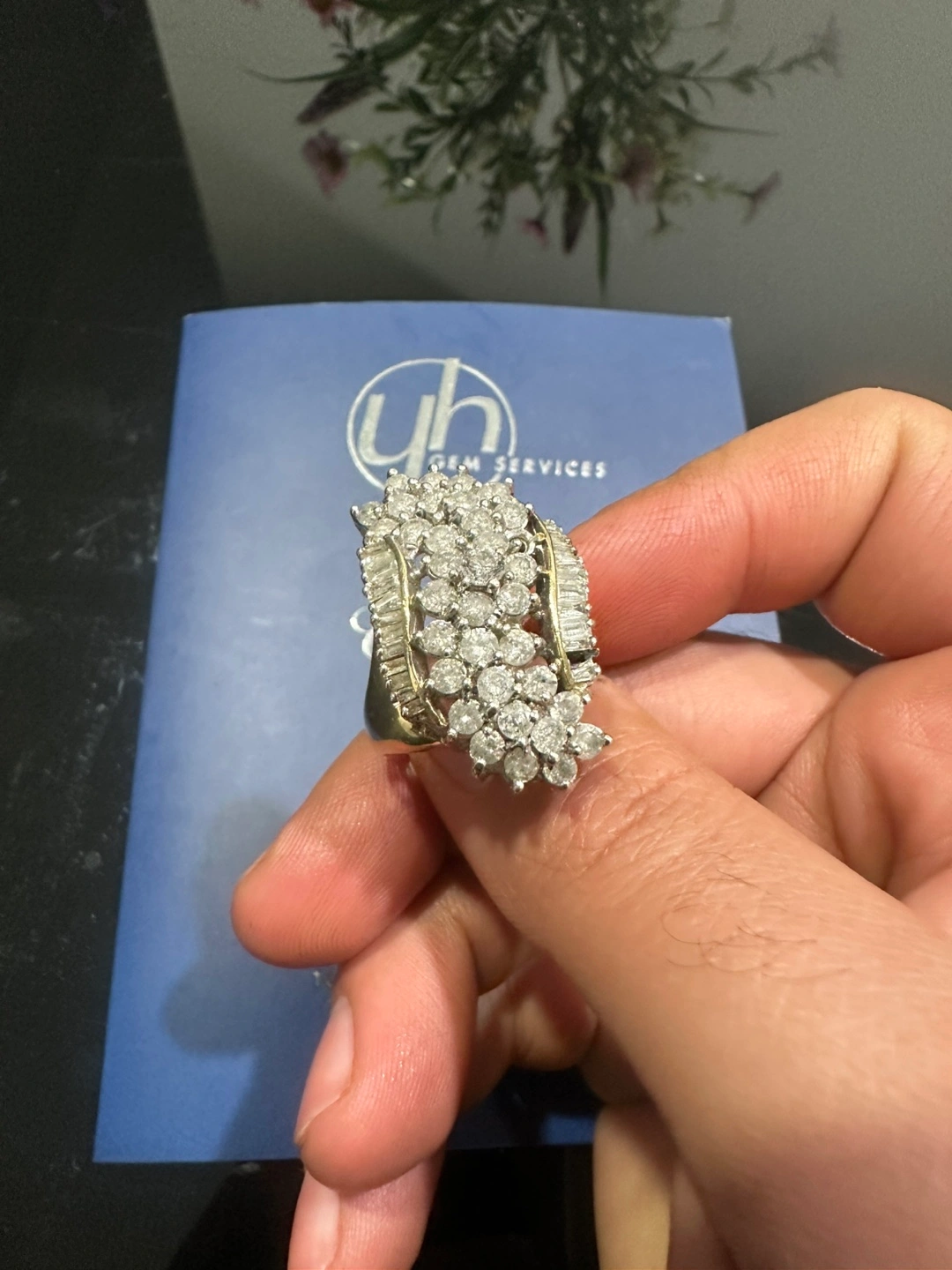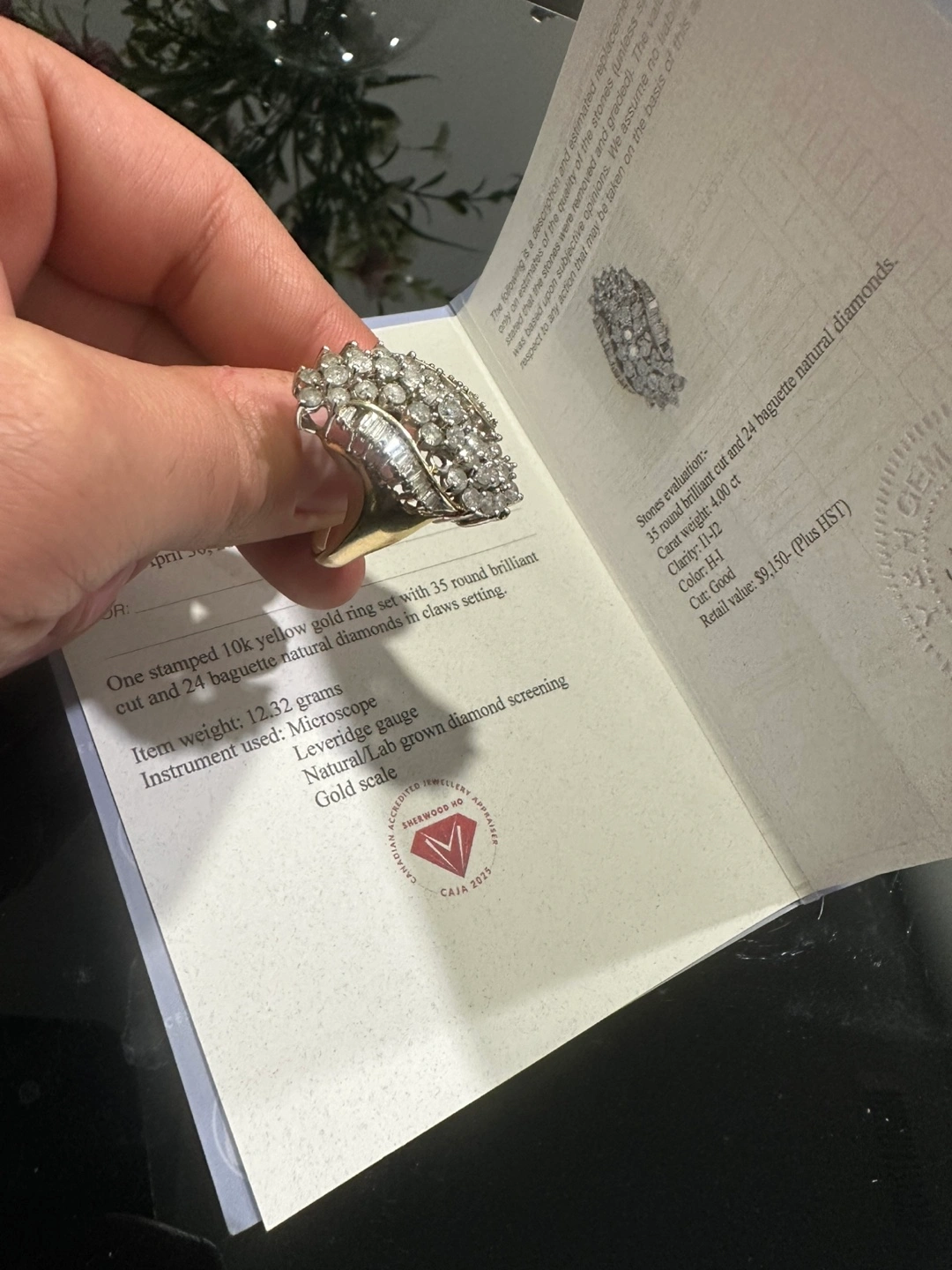 Stunning 10k yellow gold ring. Features 35 round brilliant cut and 24 baguette natural diamonds. Set in a claw setting. Approximately 12.32 grams. Comes with appraisal.