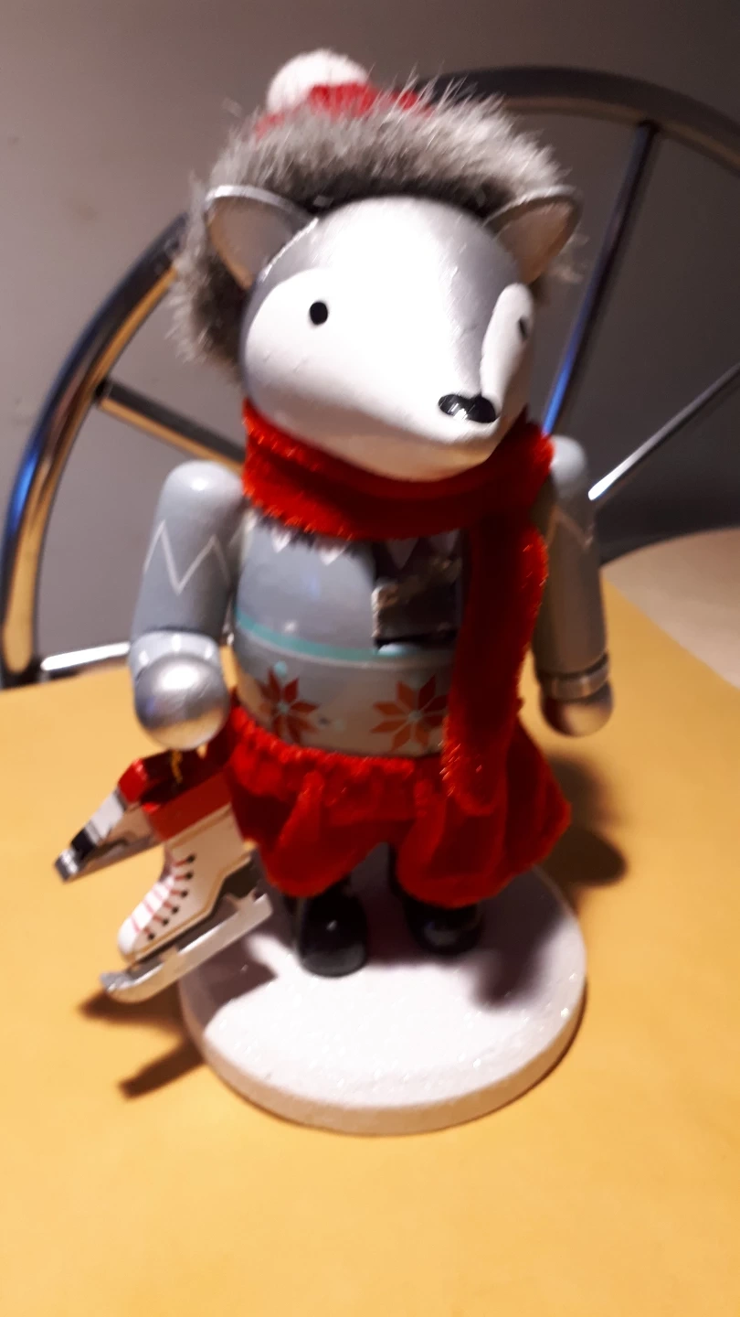Cute winter-themed nutcracker. Grey and white figurine wearing a red outfit. Holds ice skates. Perfect for holiday décor. Made in China.