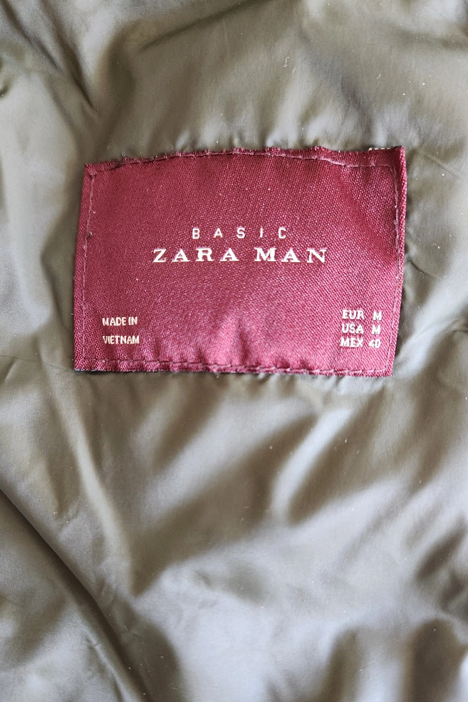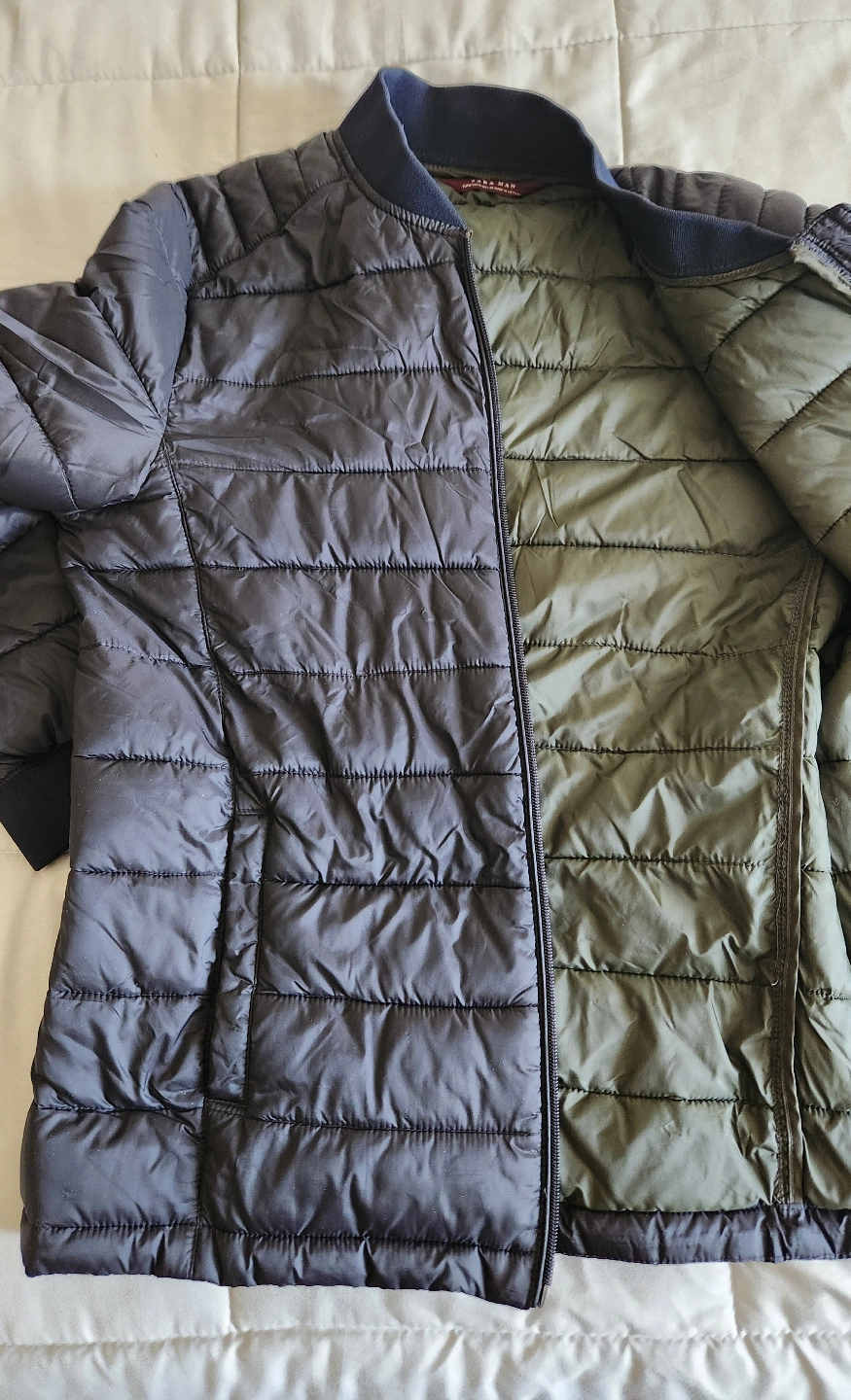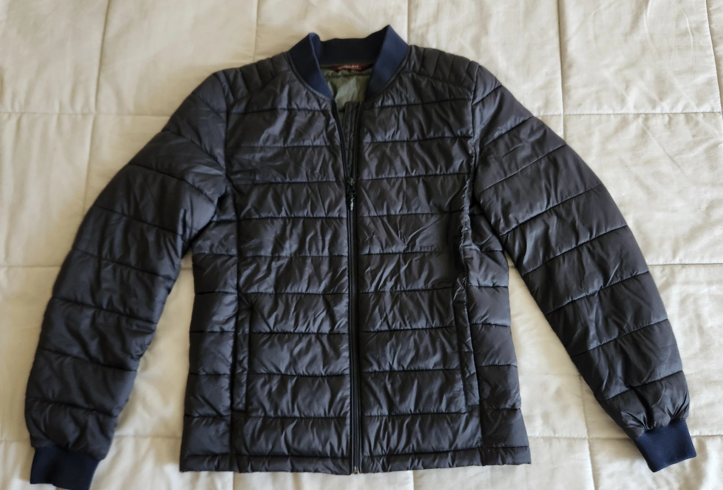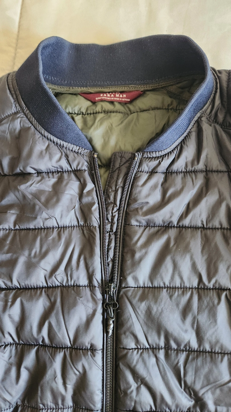 Men's black puffer jacket. Zip-up front. Ribbed collar and cuffs. Olive green interior lining. Size small. Made in Vietnam. The label says M, but it's more like Small.