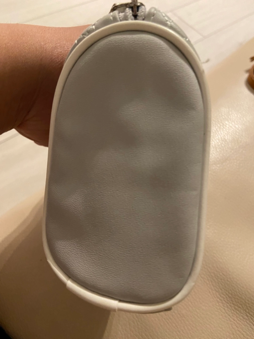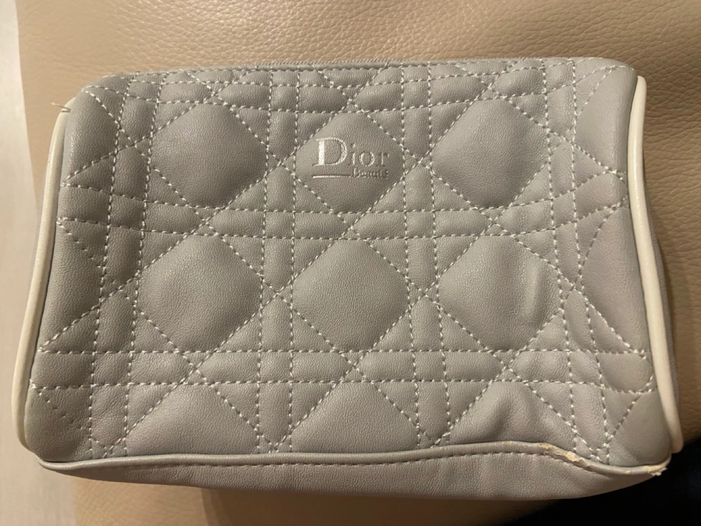 Grey quilted cosmetic bag. Small zippered pouch. Slight damage to one corner. Dior Beauty logo.