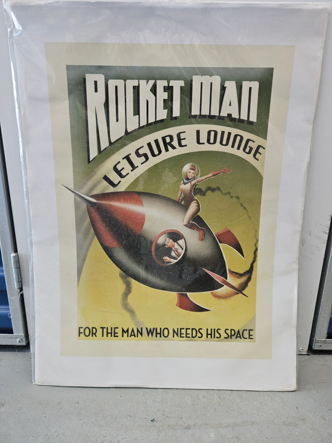 Mid-century modern style poster. Features a rocket ship, woman, and man. Great for a man cave or retro-themed room. Perfect for framing.