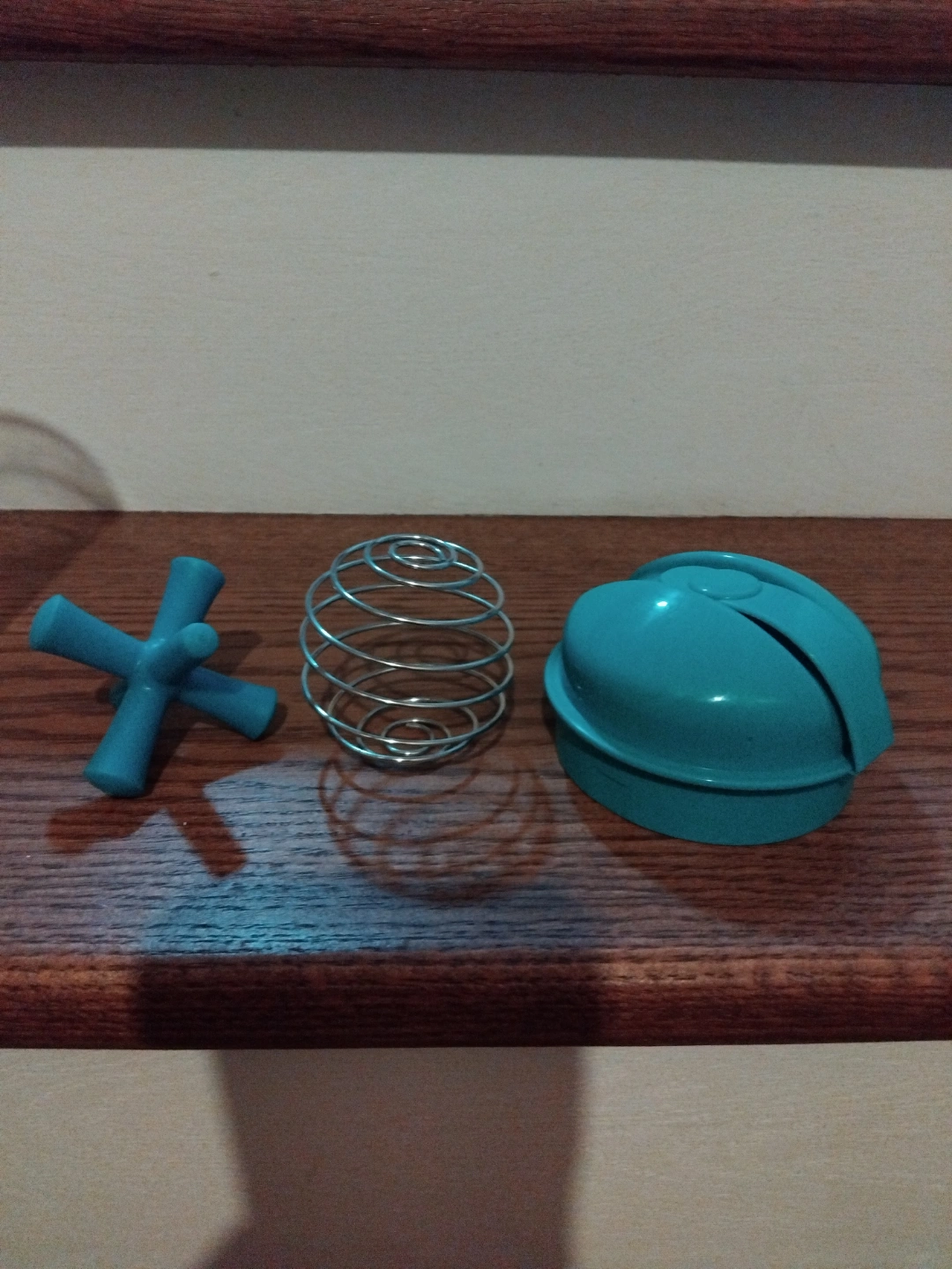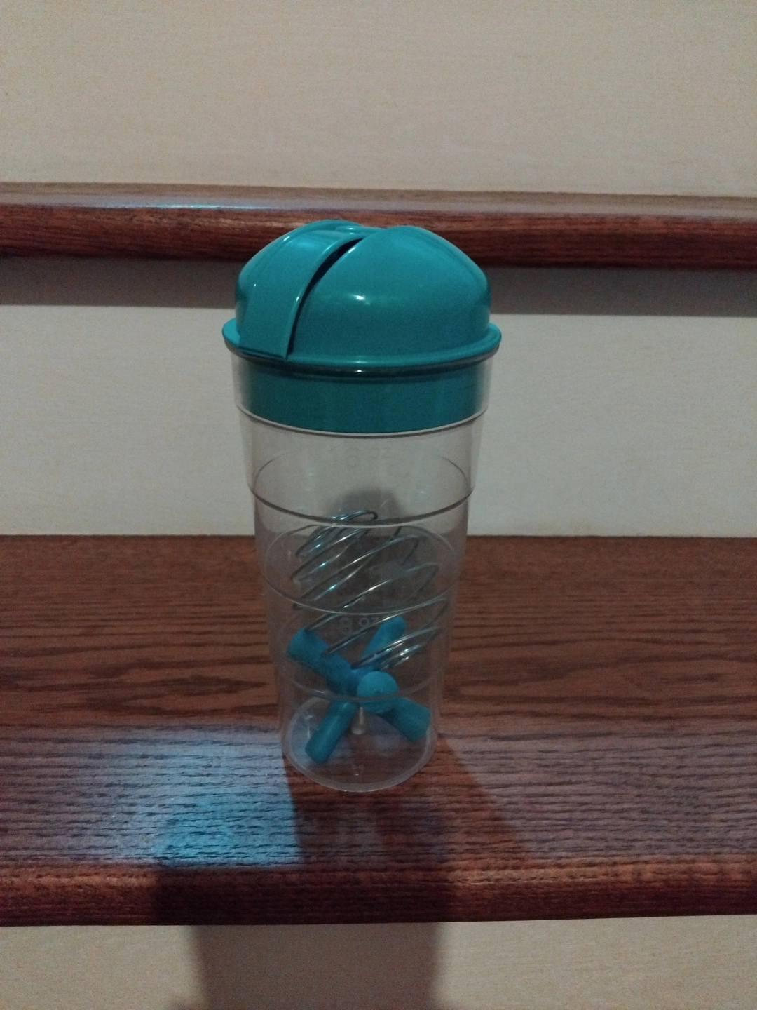 Portable shaker bottle. Features a teal lid and base. Includes a wire whisk and a plastic mixing ball. Great for smoothies and protein shakes.