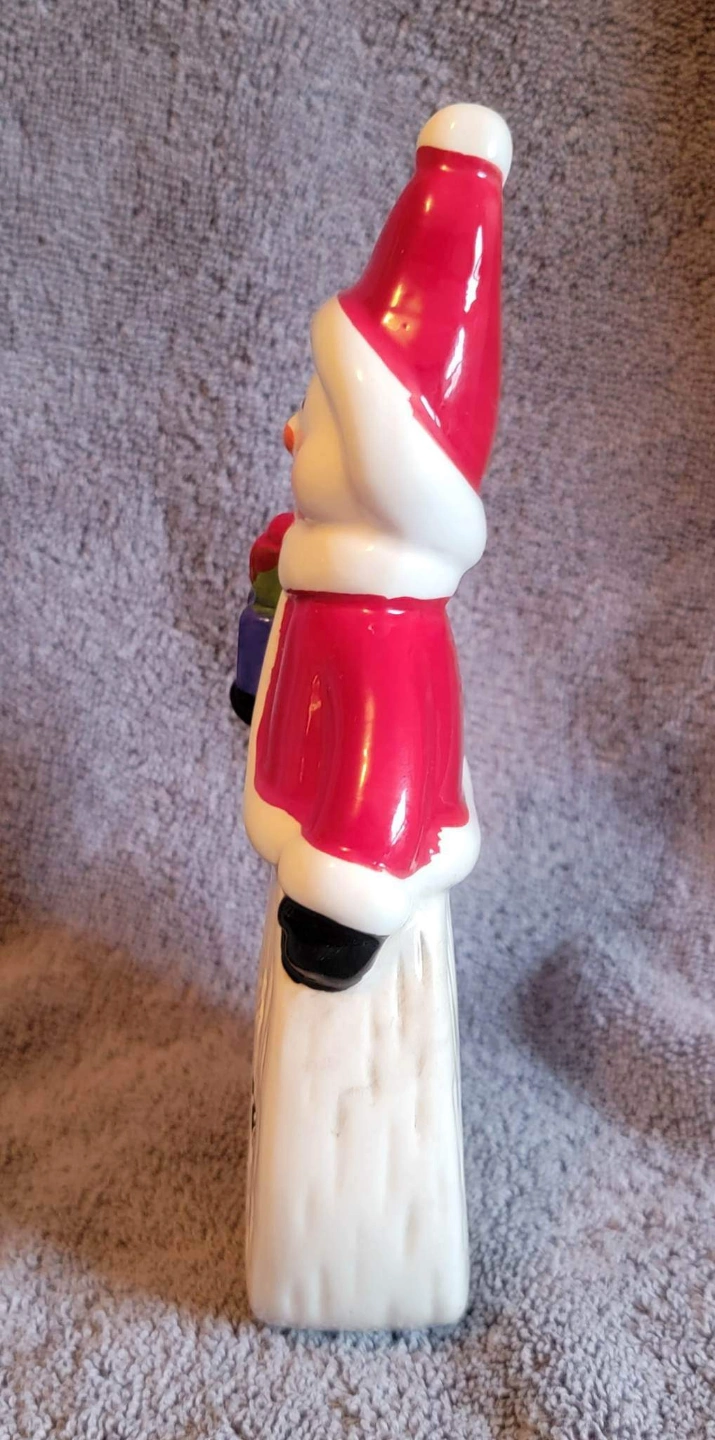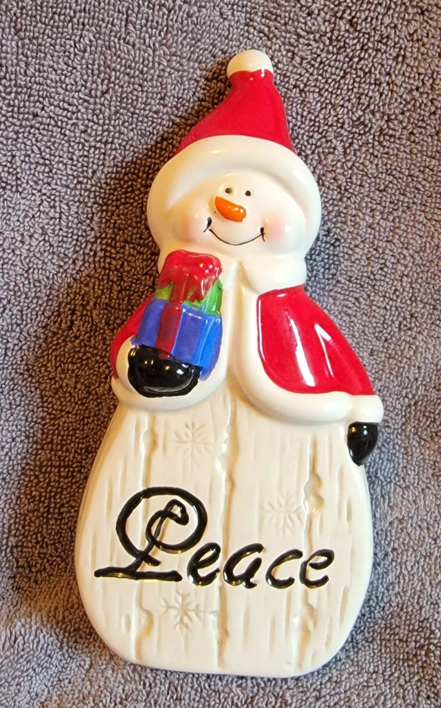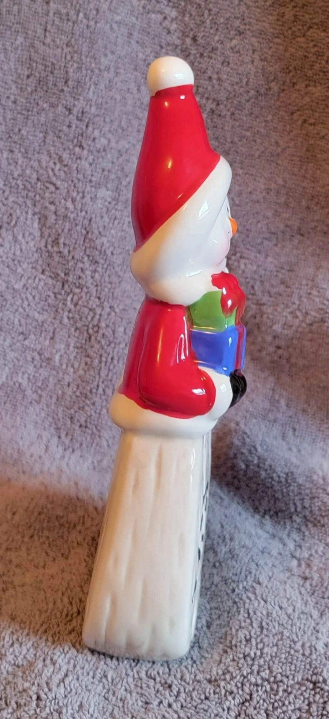 This Multi-Coloured Santa Snowman Ceramic Christmas Figurine has a little of wear on the Nose and Bottom but otherwise it is in Excellent condition. Made of Ceramic. Measurements: Length: 3 1/2 inches. Width: 1 1/2 inches. Height: ~ 7 1/4 inches. Perfect to decorate your home with. From a smoke free home. Cash and E-Transfer accepted. Pick up only.