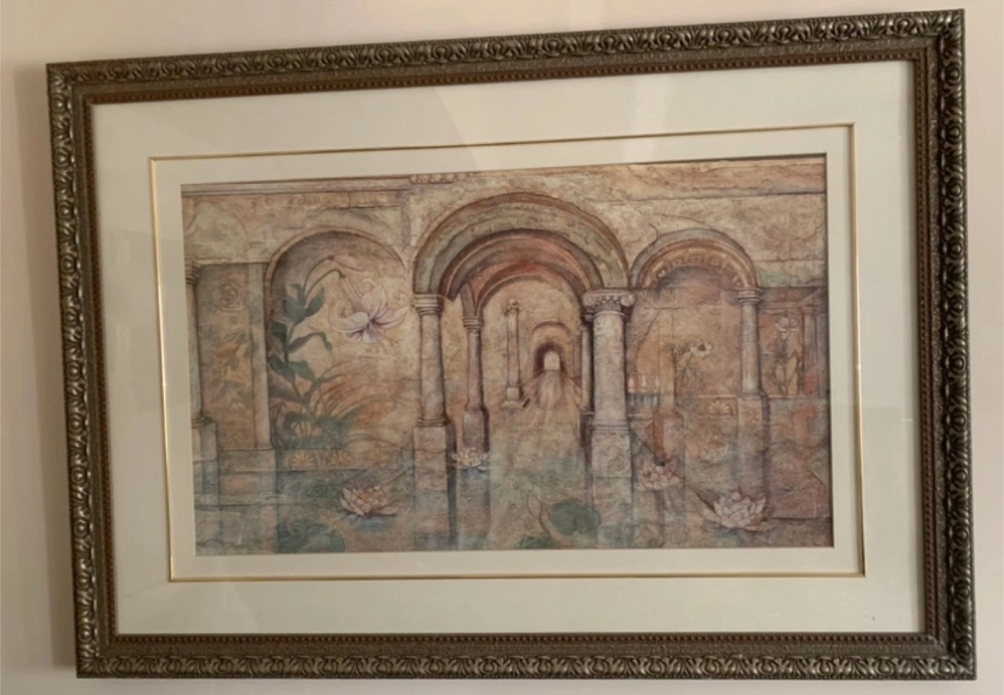 Large framed art print. Depicts an ancient architectural scene with water lilies. Ornate frame. Neutral colours.