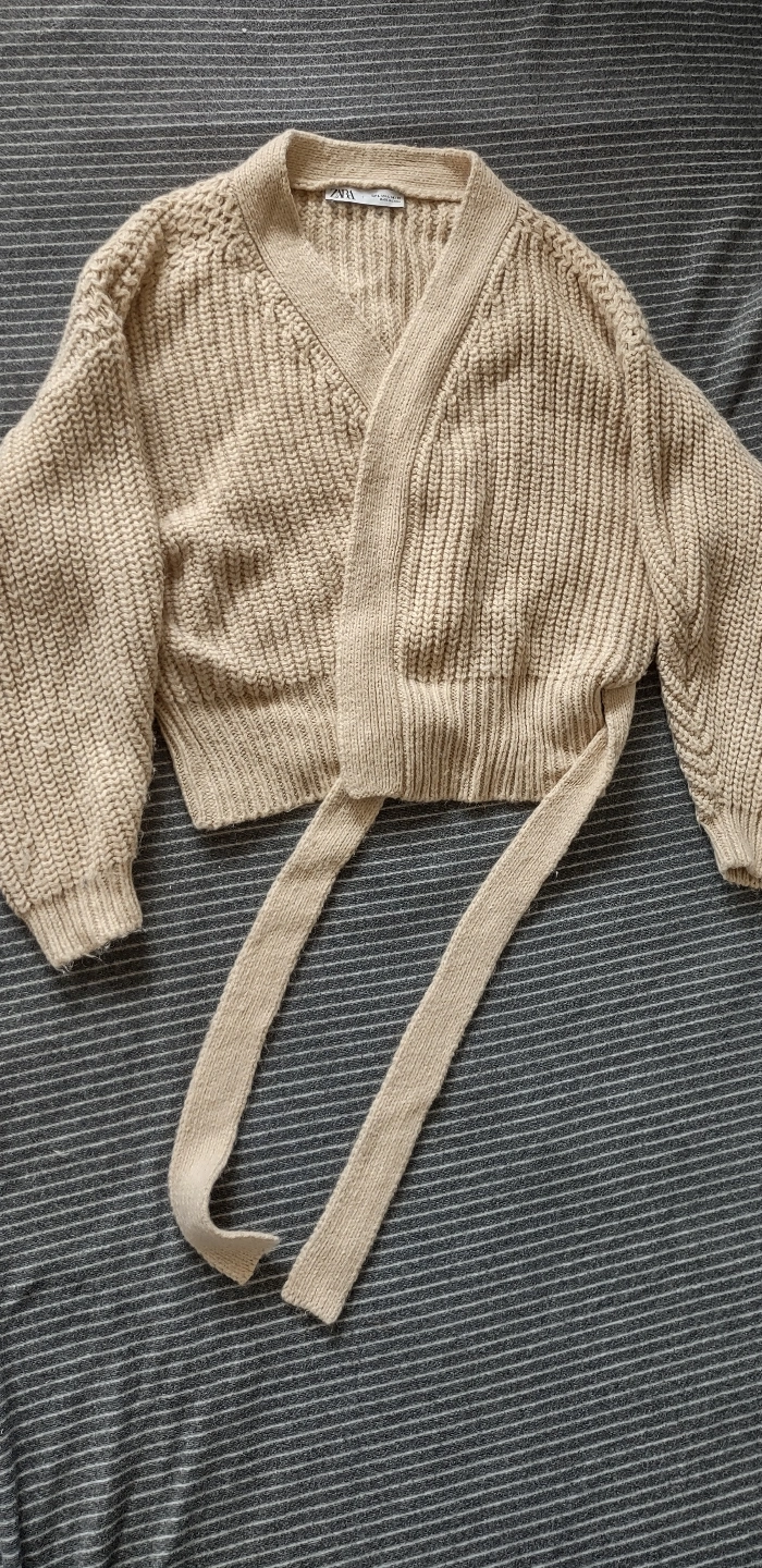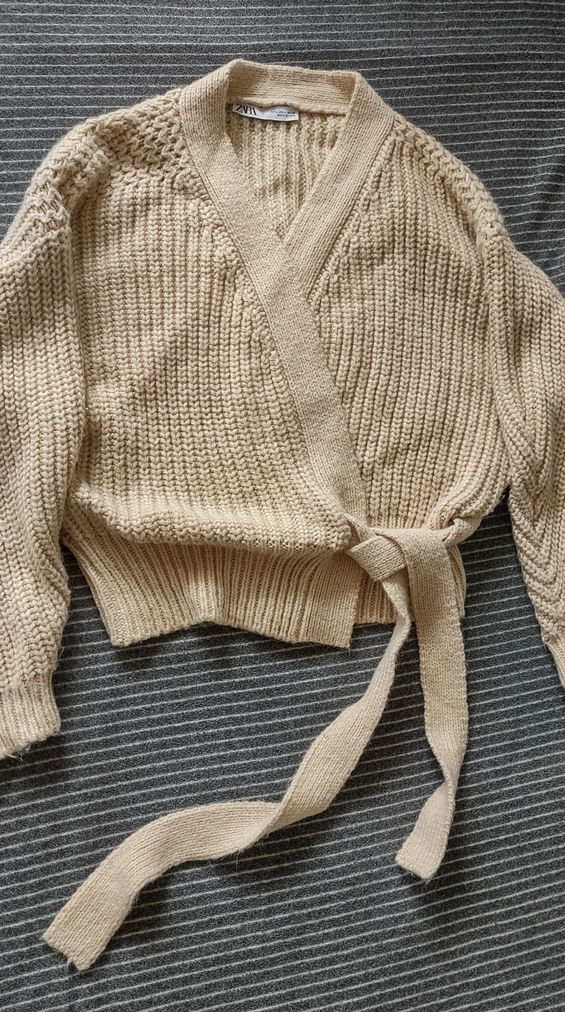 Women's beige knit wrap cardigan. Size large. Features a V-neck and long sleeves. Self-tie belt.