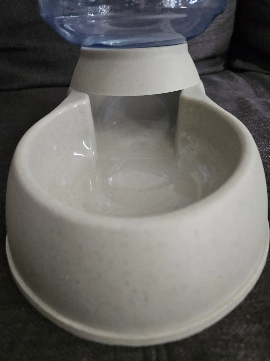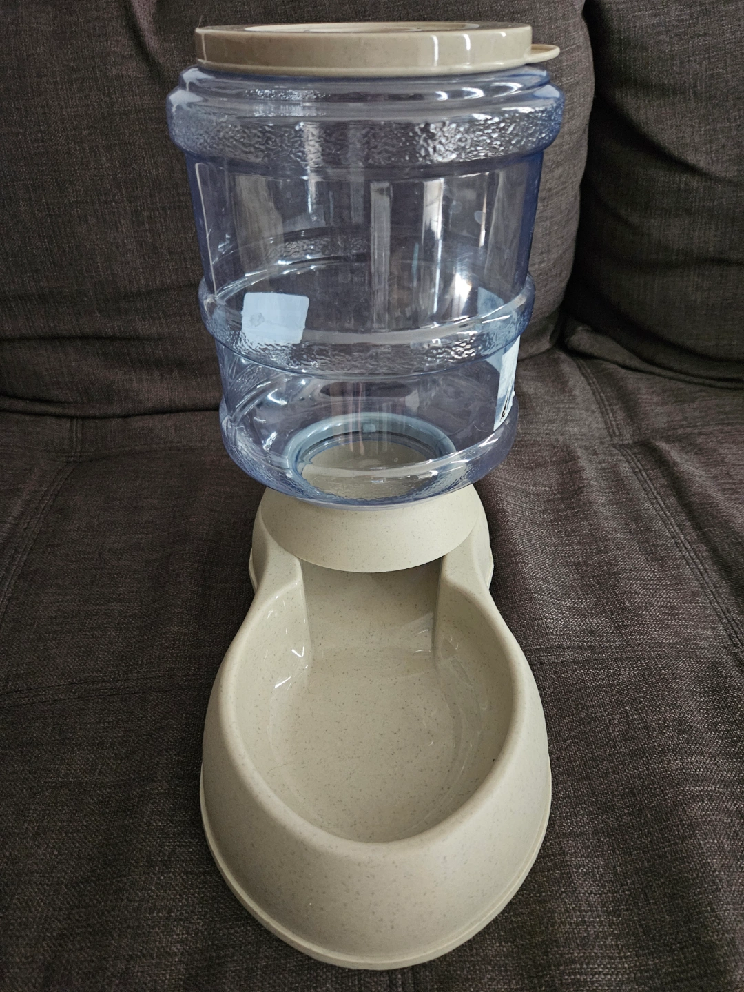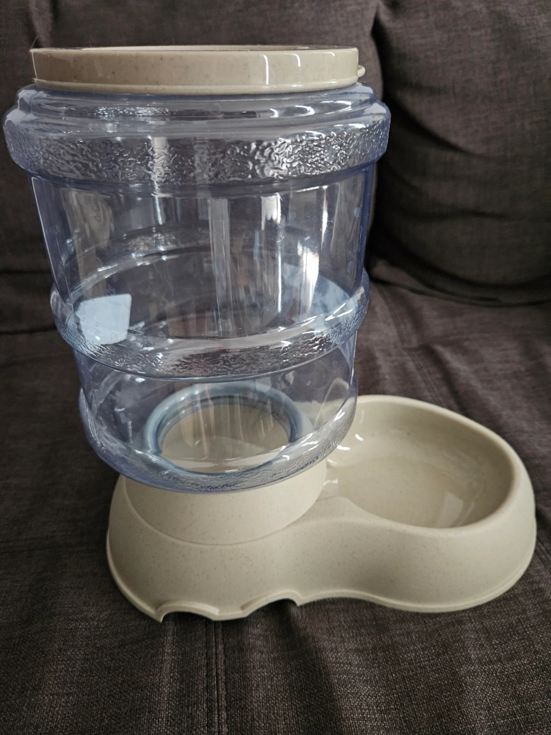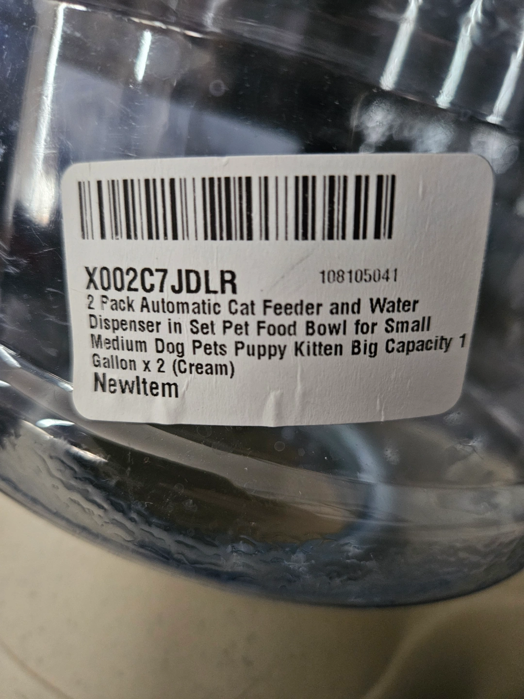 Automatic cat feeder / dispenser. Set includes pet food bowl for small-medium dogs and cats. Large capacity, cream coloured. Product stickers on 1 gallon dispenser. Removable lid on top of dispenser. Never used. See my other listings.
