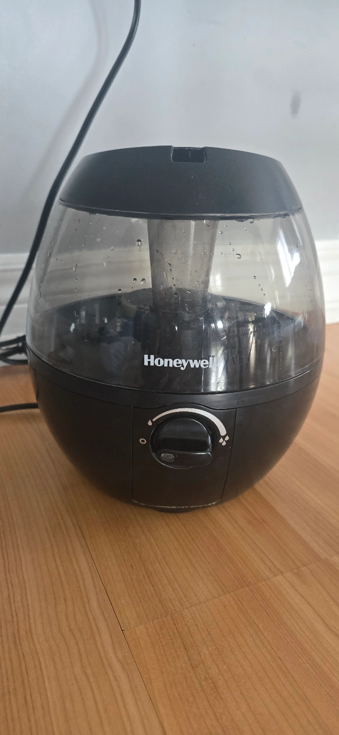 The Honeywell HUL520BC MistMate Ultrasonic Cool Mist Humidifier, a pre-owned unit in black, features adjustable mist control, automatic shutoff, ultra-quiet operation, visible cool mist output, and a 0.5-gallon water reservoir. Its design incorporates a large, easily accessible water tank and components for extended use.