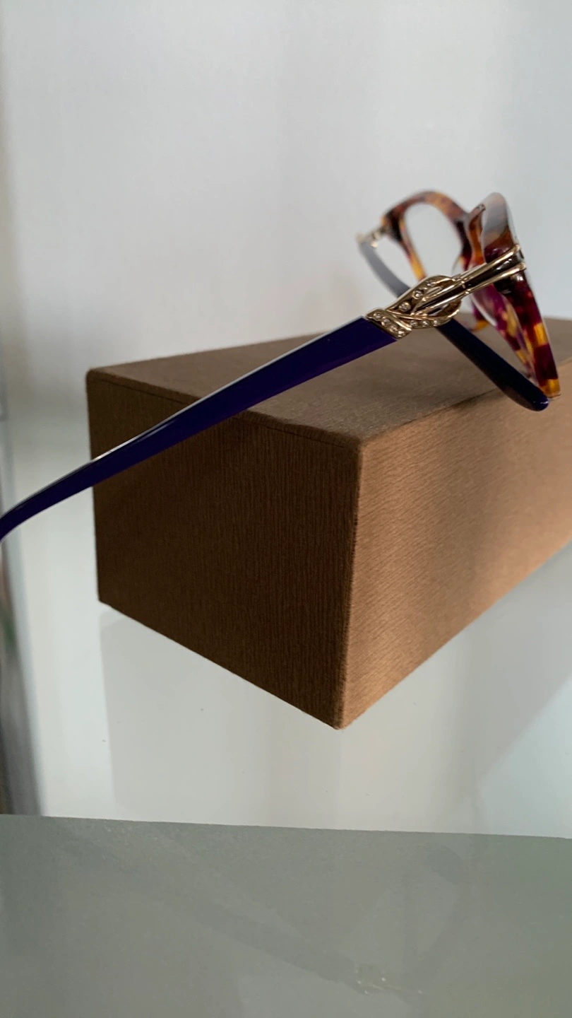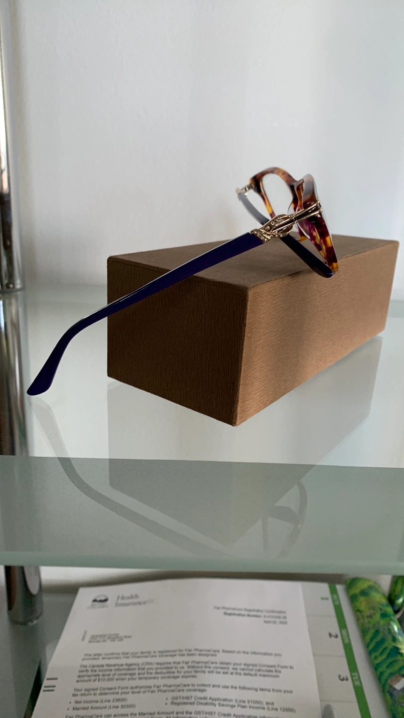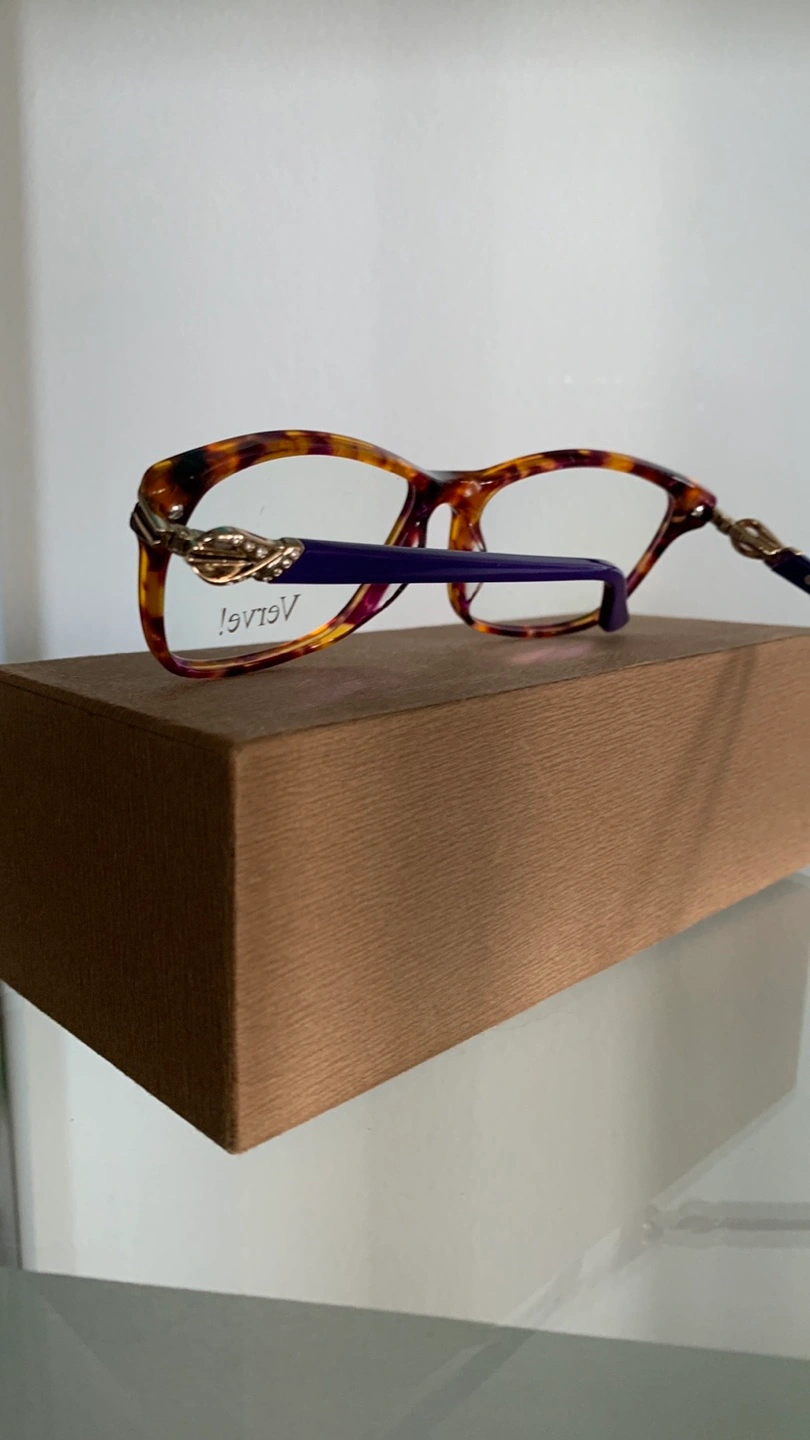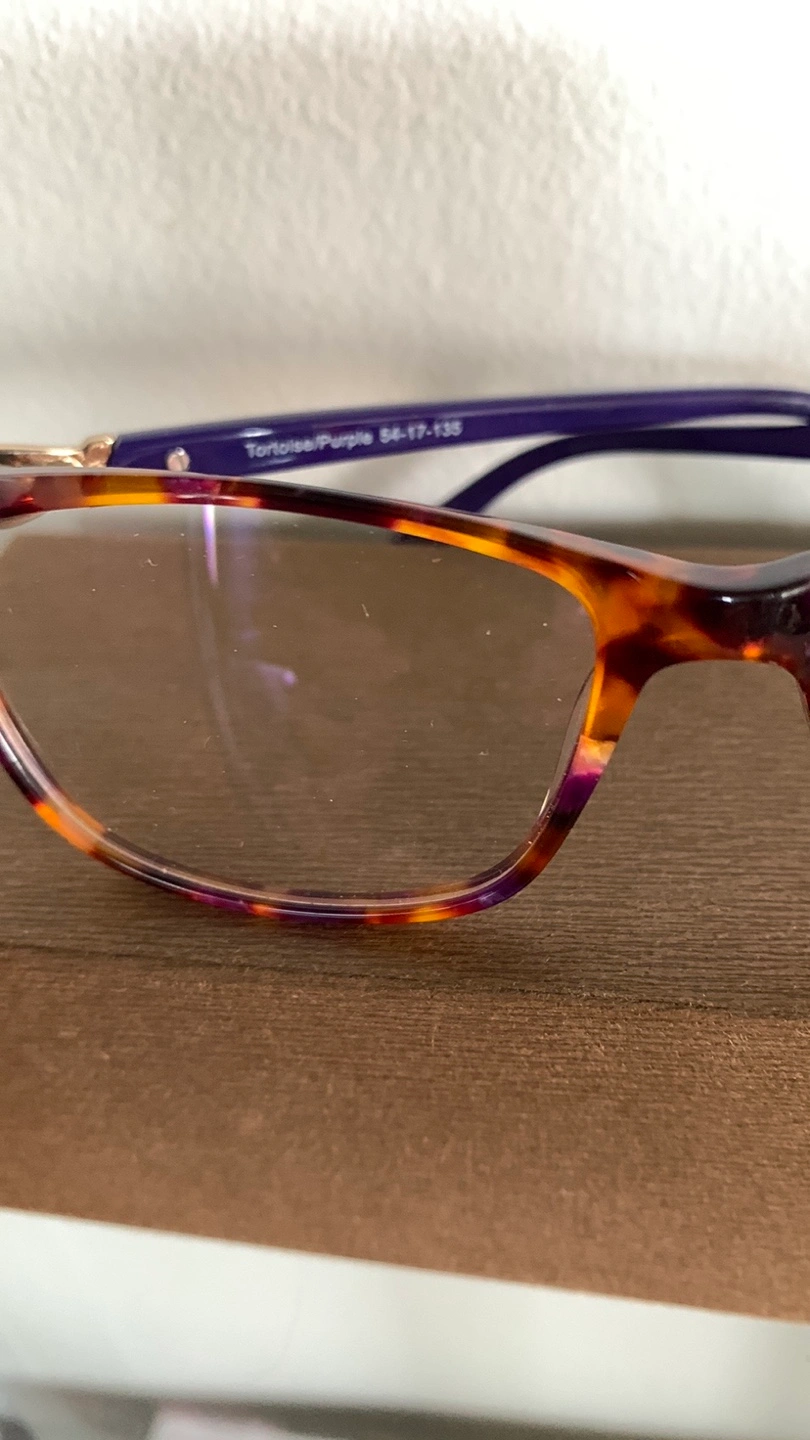 Women's eyeglasses. Tortoise shell and purple frames. Gold detailing on temples.