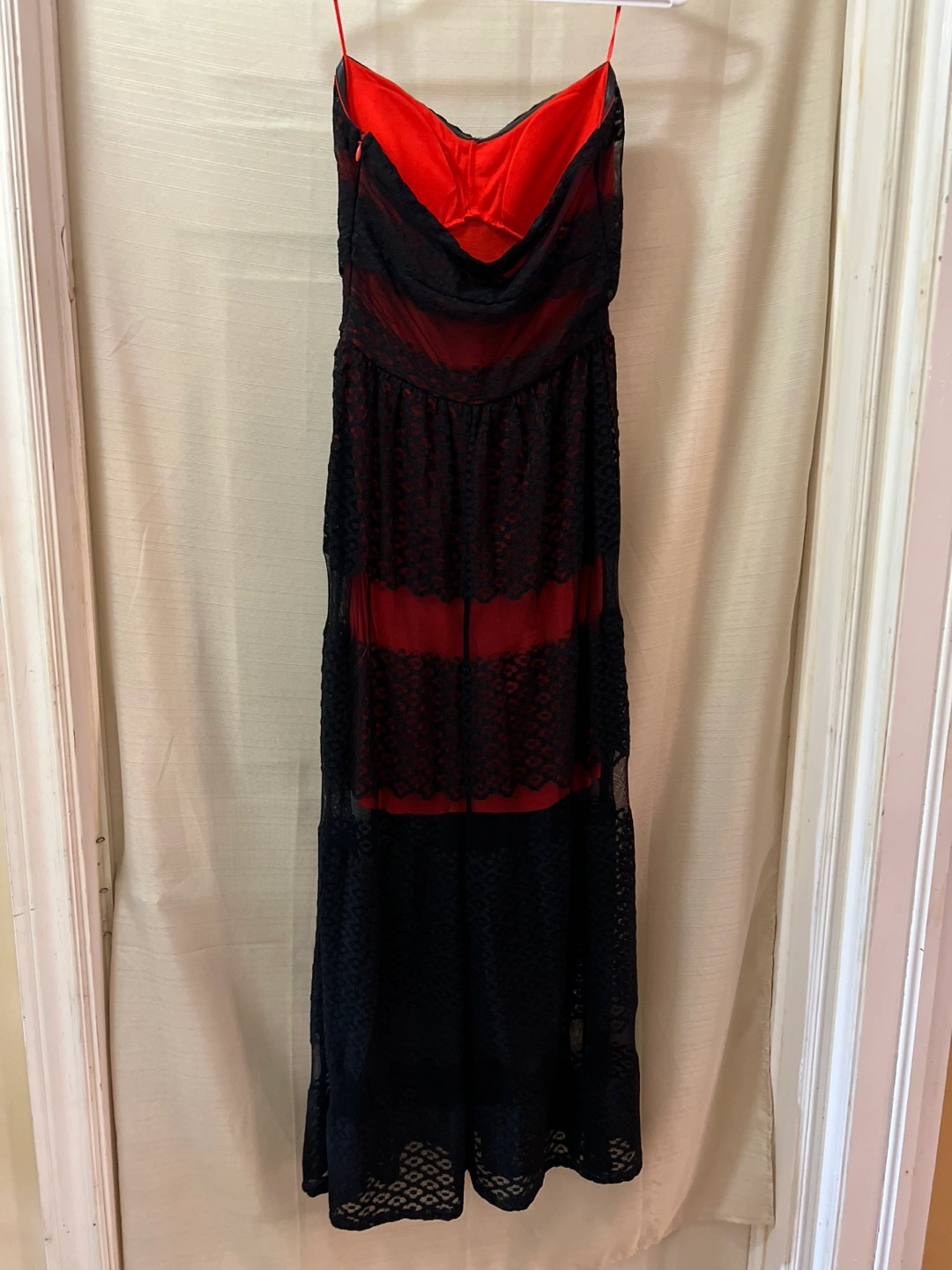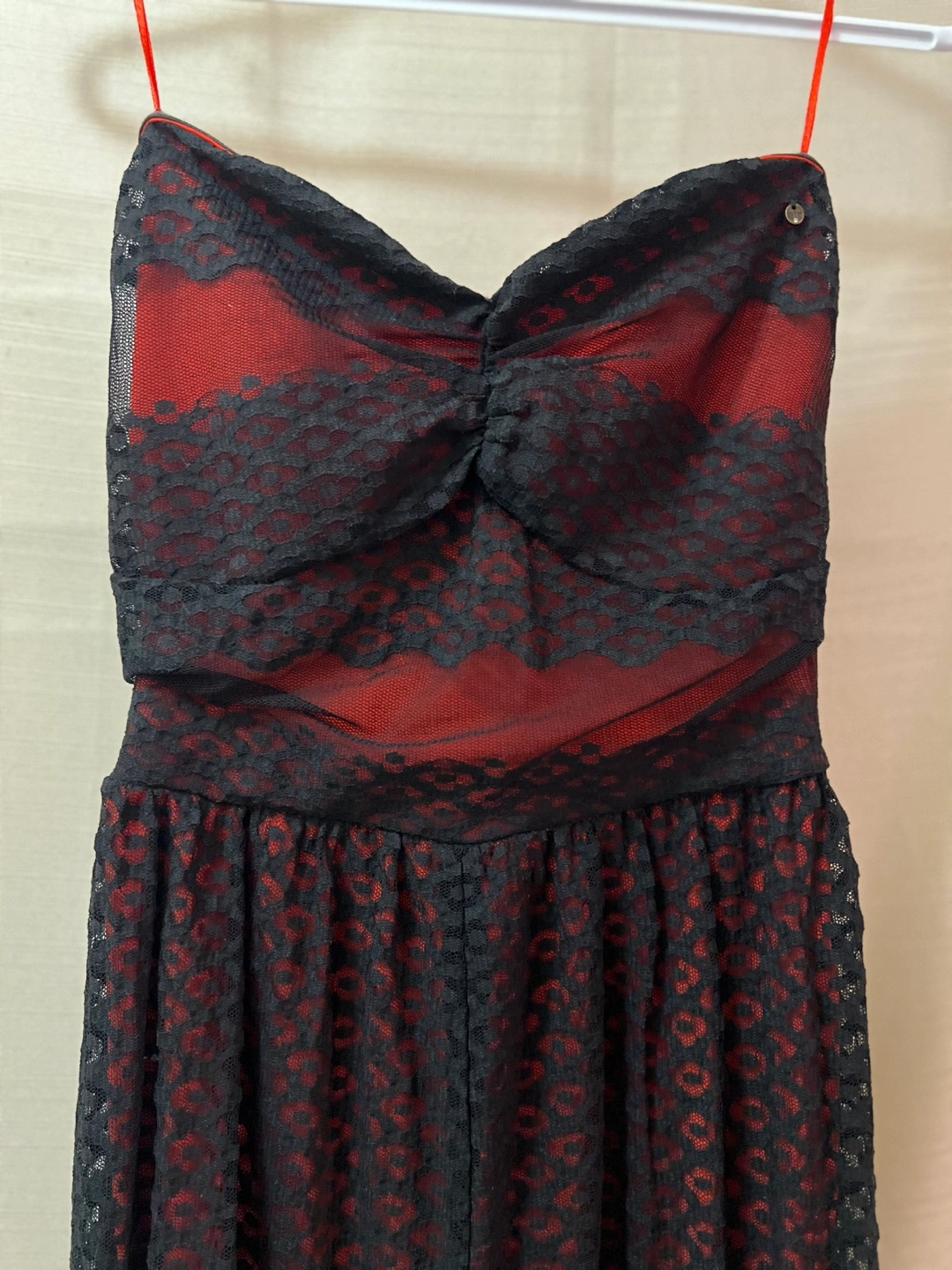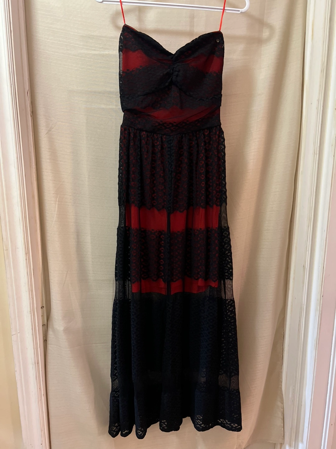 Beautiful Guess strapless maxi dress. Features red and black lace overlay. Floor-length skirt. Perfect for a special occasion, summer or vacation! Size small Ptp- 14 Length- 25 (under dress) 44 (sheer overlay) Waist- 13