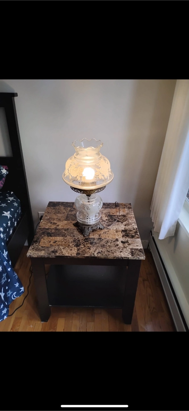 Beautiful vintage hurricane lamp. Features a clear glass shade with etched floral design. Brass coloured base. Great addition to any home decor. $30 or best offer.