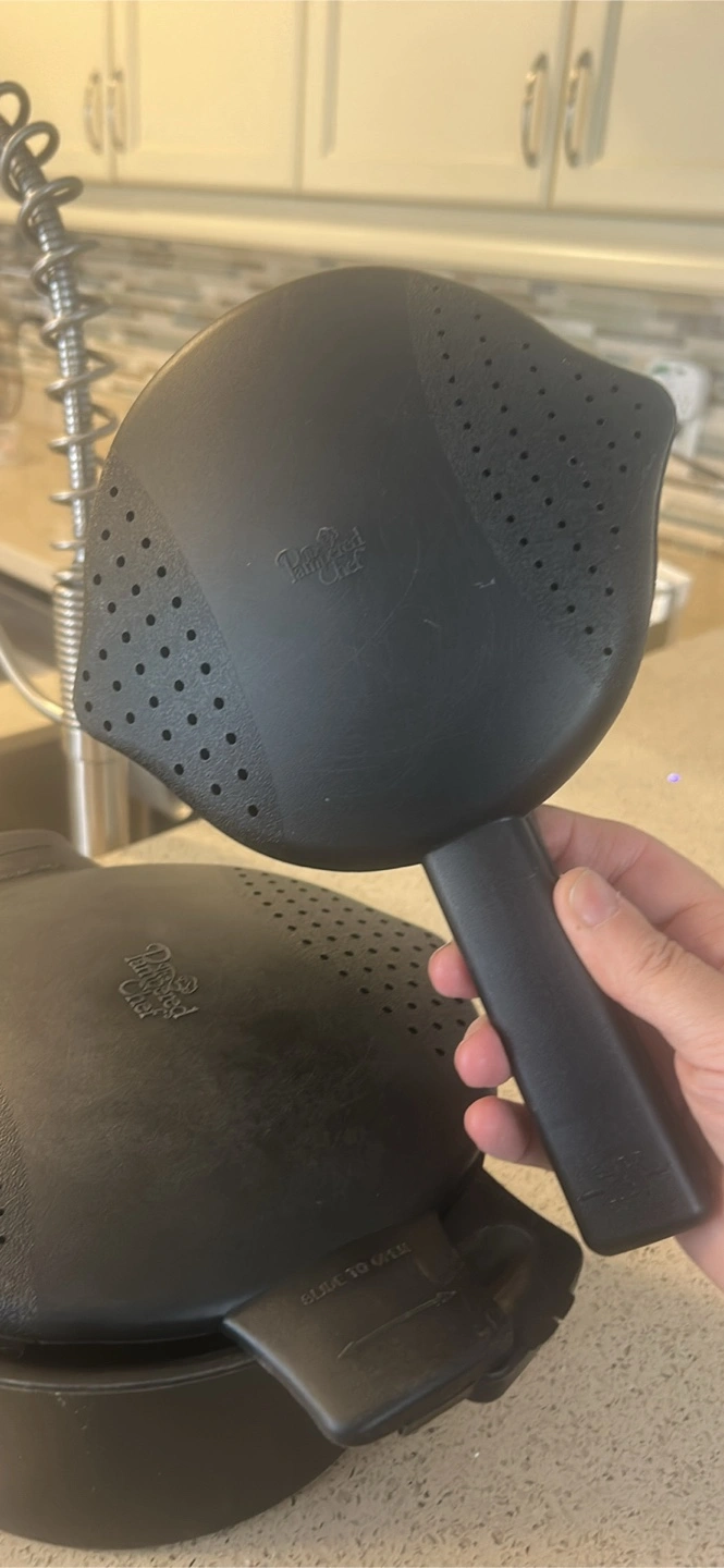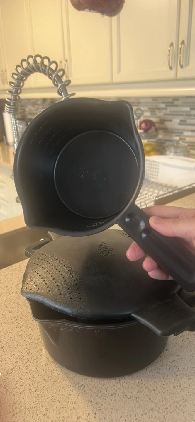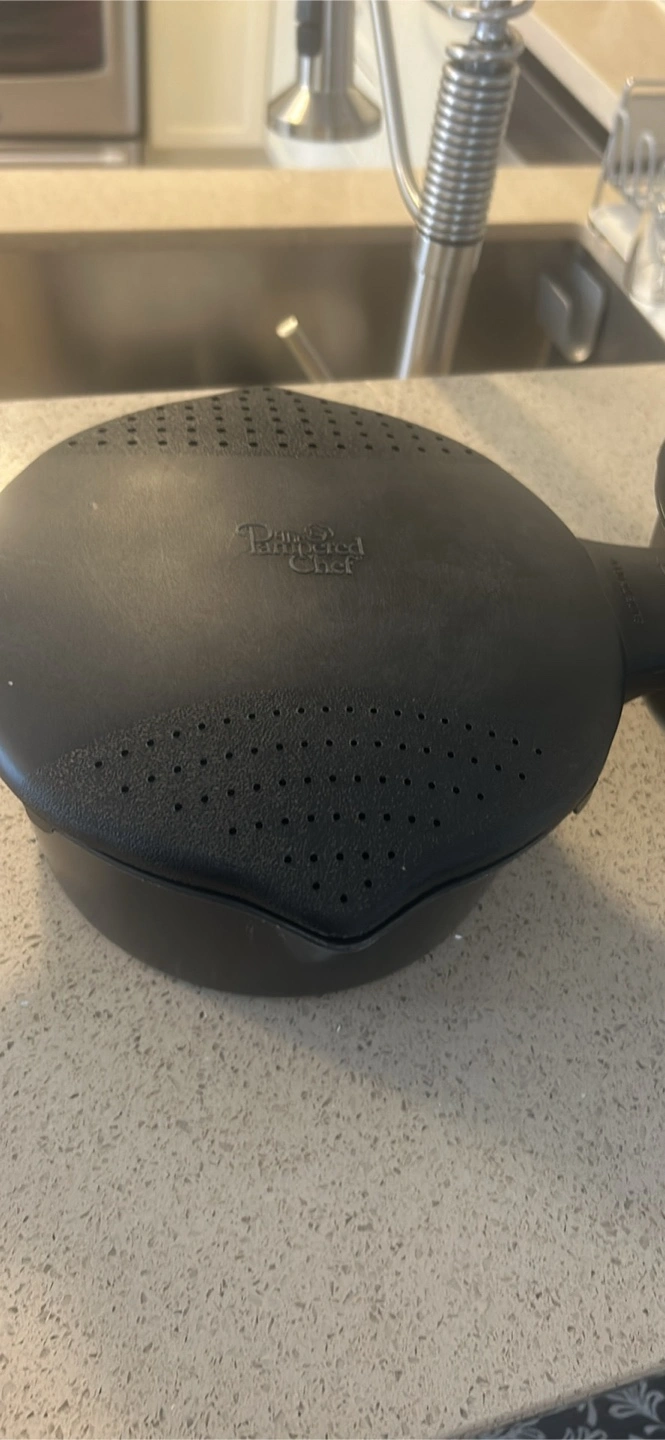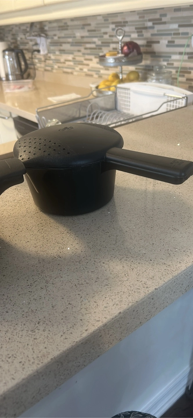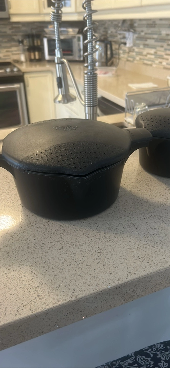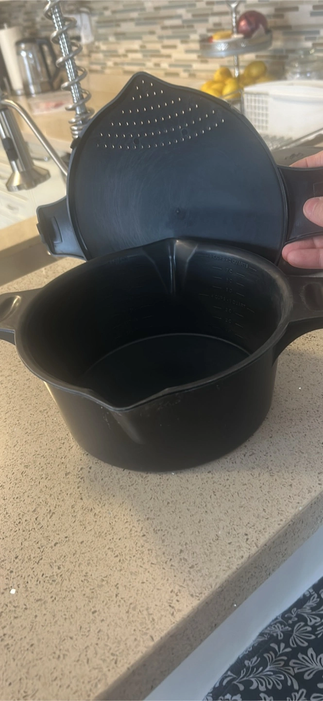 Black plastic pasta cooker. Features a strainer lid. Great for cooking pasta and straining water. 2 pieces both for $10.00