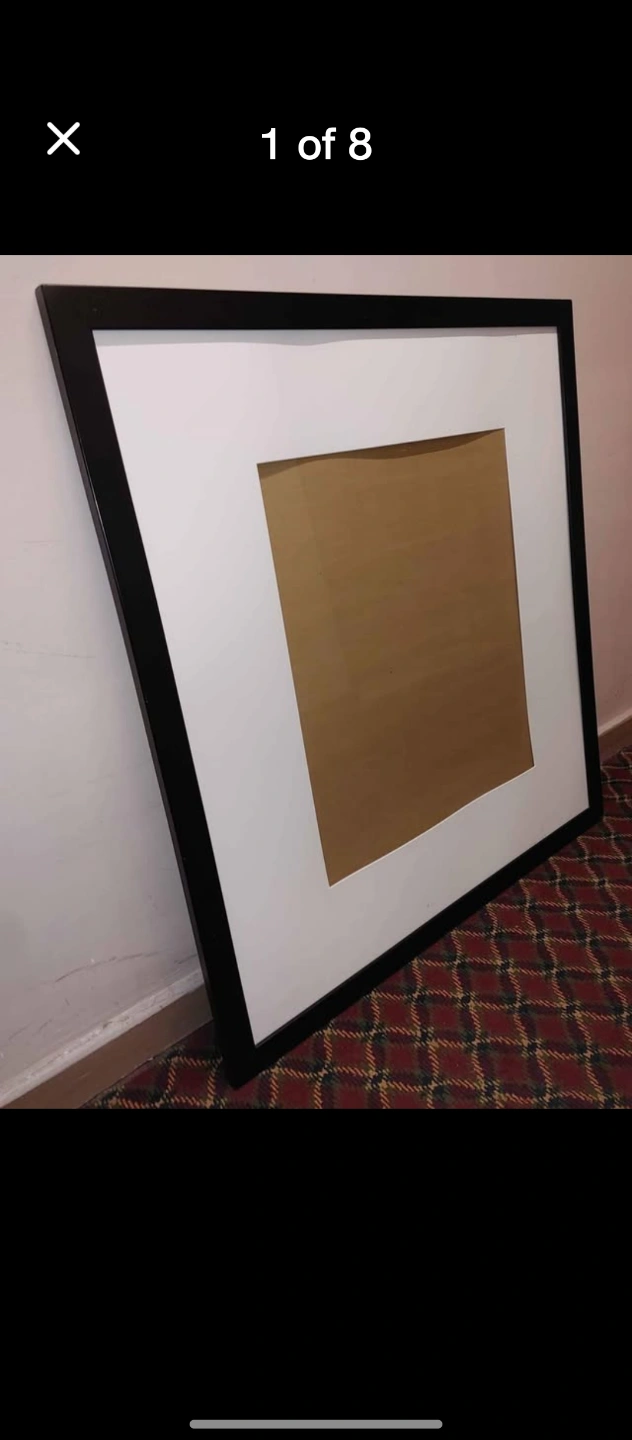 Large square picture frame. Black frame with white mat. Ready for your favourite photo or artwork. Great condition. 40.5" X 36.5" No damage to the frame or glass. Glass is completely intact. The mat is a little wonky but can be flattened or replaced. Smoke free home. $10 ca$h
