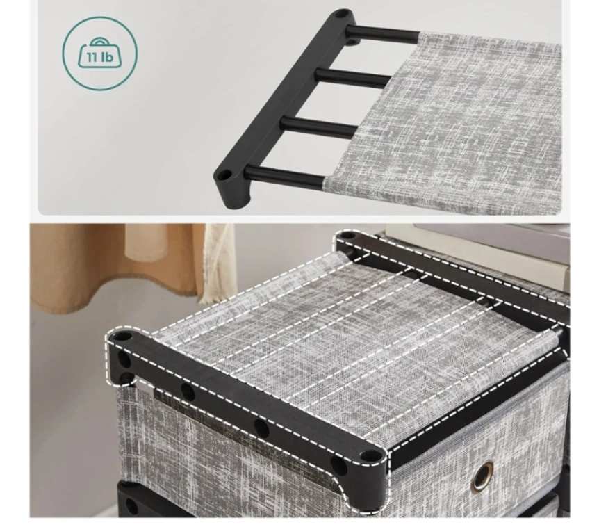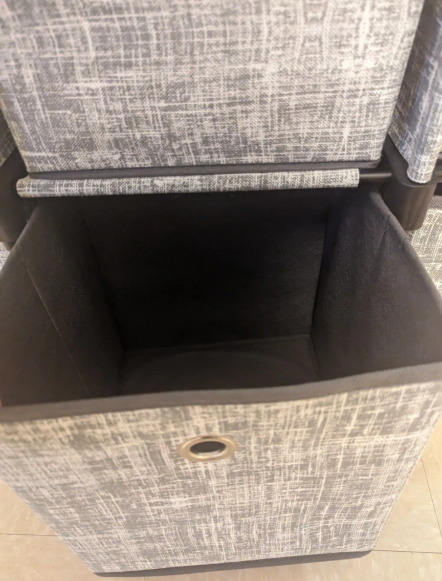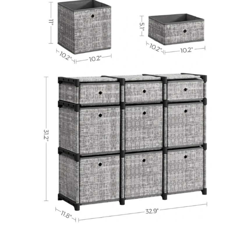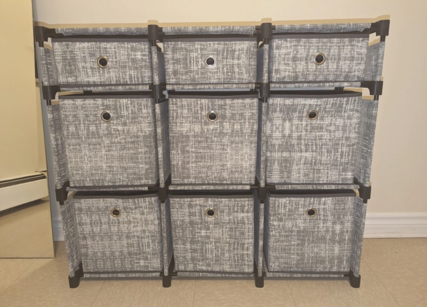 9 drawer fabric storage organizer. Grey fabric exterior with black frame. Ideal for closet organization or bedroom storage. Dimensions provided in images. Sturdy metal frame. Easy assembly. Collapsible for storage. Looks nicer in person, the lighting and also my camera isn't that great It will be together unless you want me to take it apart...I just don't have instructions to put it together anymore. Had it for 4 months. Comes from a clean smoke free home. $45 pick up only near Weston Rd and Black Creek