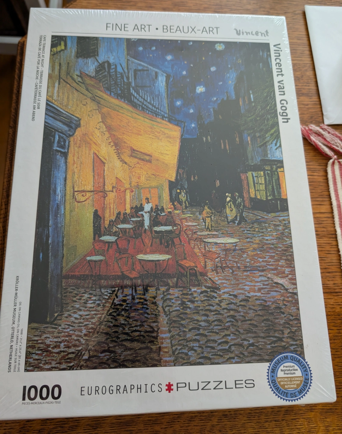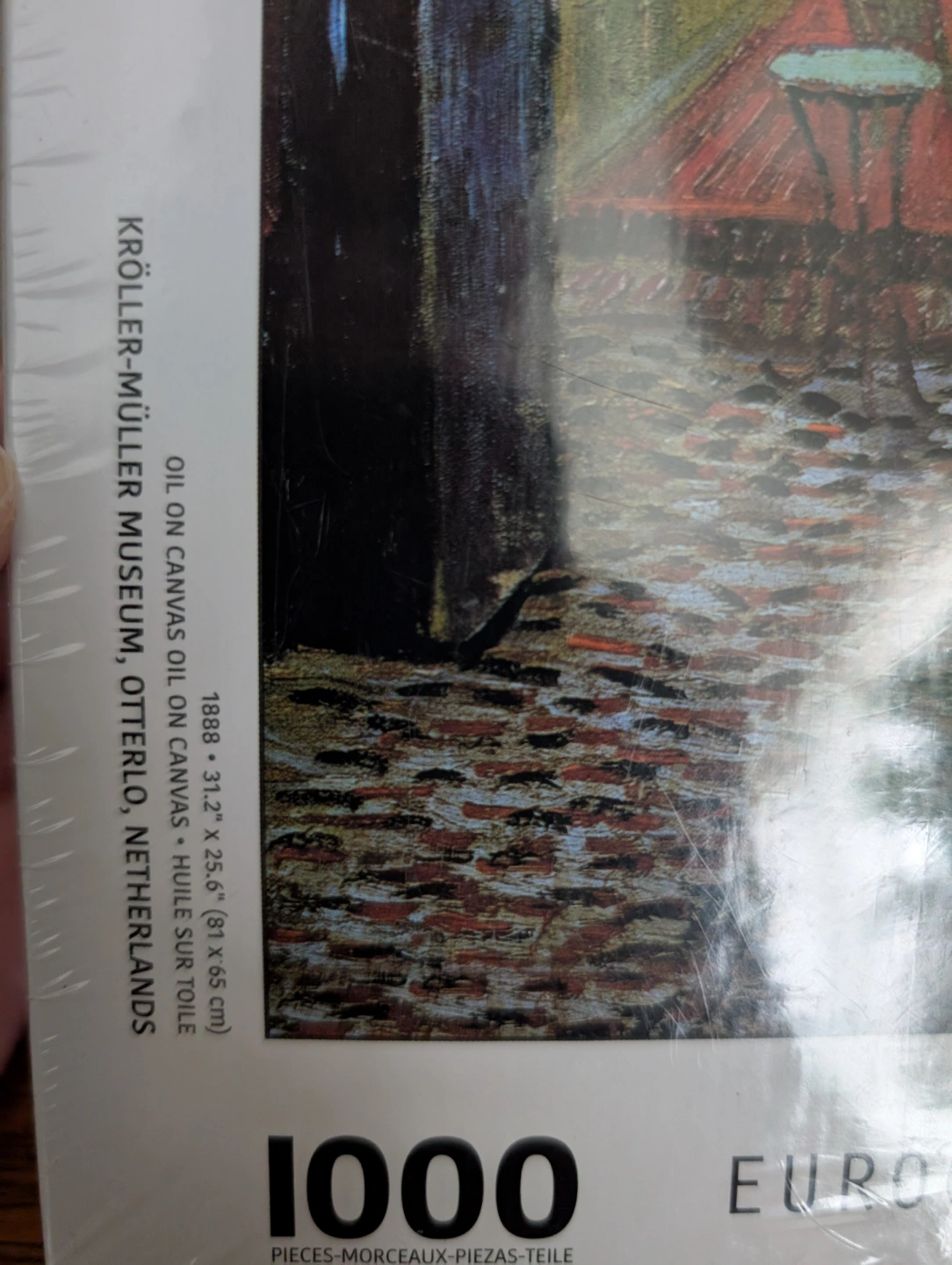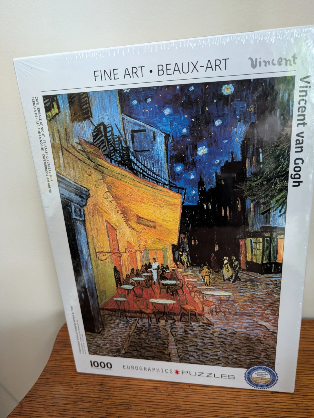 Eurographics Vincent van Gogh Cafe Terrace at Night 1000 Piece Puzzle 1000 piece jigsaw puzzle. Features Vincent van Gogh's Cafe Terrace at Night. Premium quality. New, unopened. Pick up by Keele and Eglinton