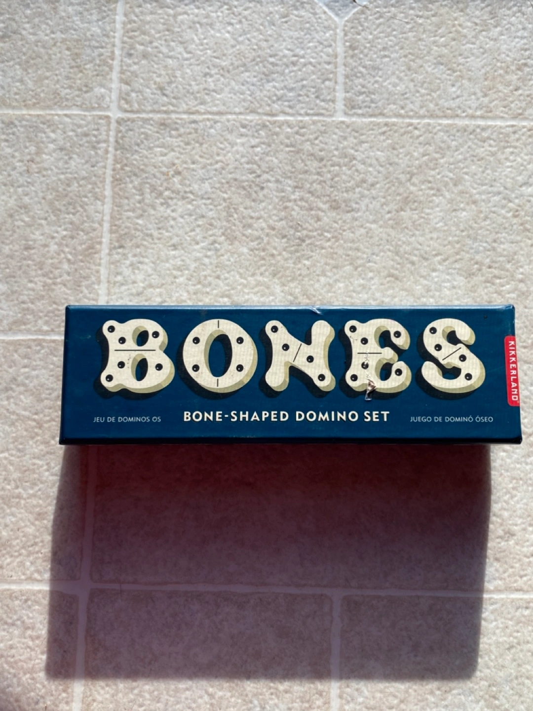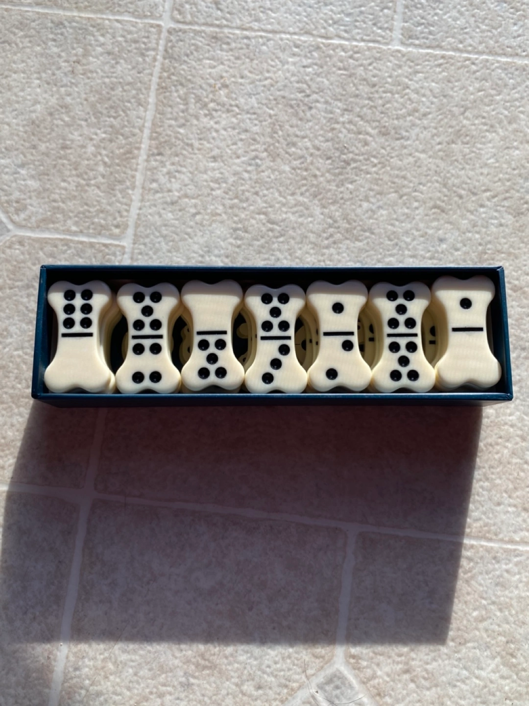 Bone-shaped domino set. Classic game, fun for all ages. Complete set in original box.