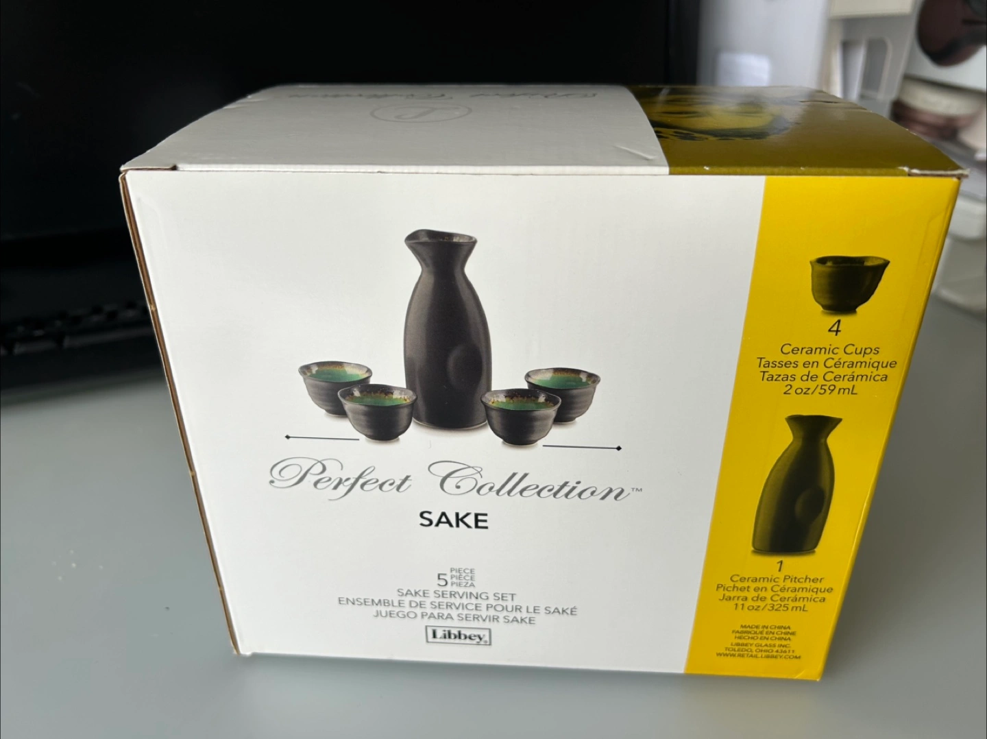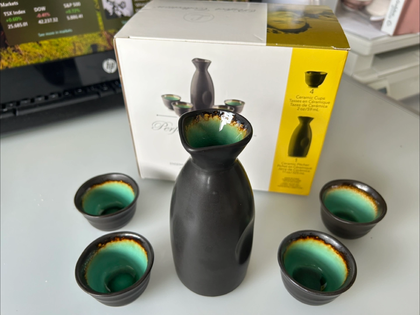 Five-piece sake set. Includes one ceramic pitcher and four ceramic cups. Dark grey/black ceramic with teal/green interior accents. New in box.