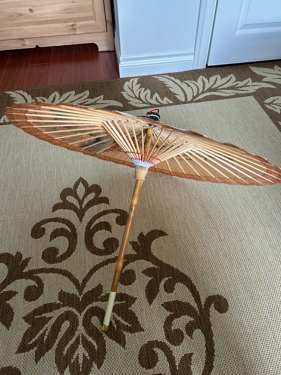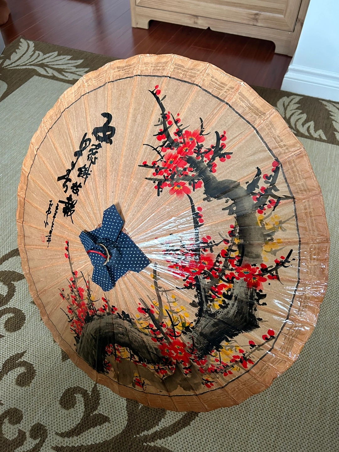 Beautiful hand-painted paper parasol. Features a traditional Japanese design with blossoming branches. Bamboo frame and wooden handle. Unique collectible or decorative piece. New condition.