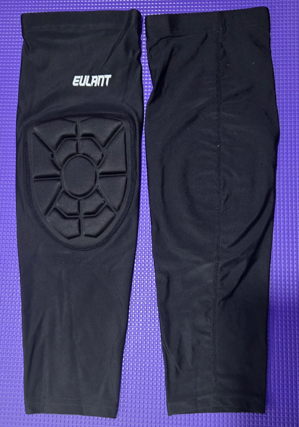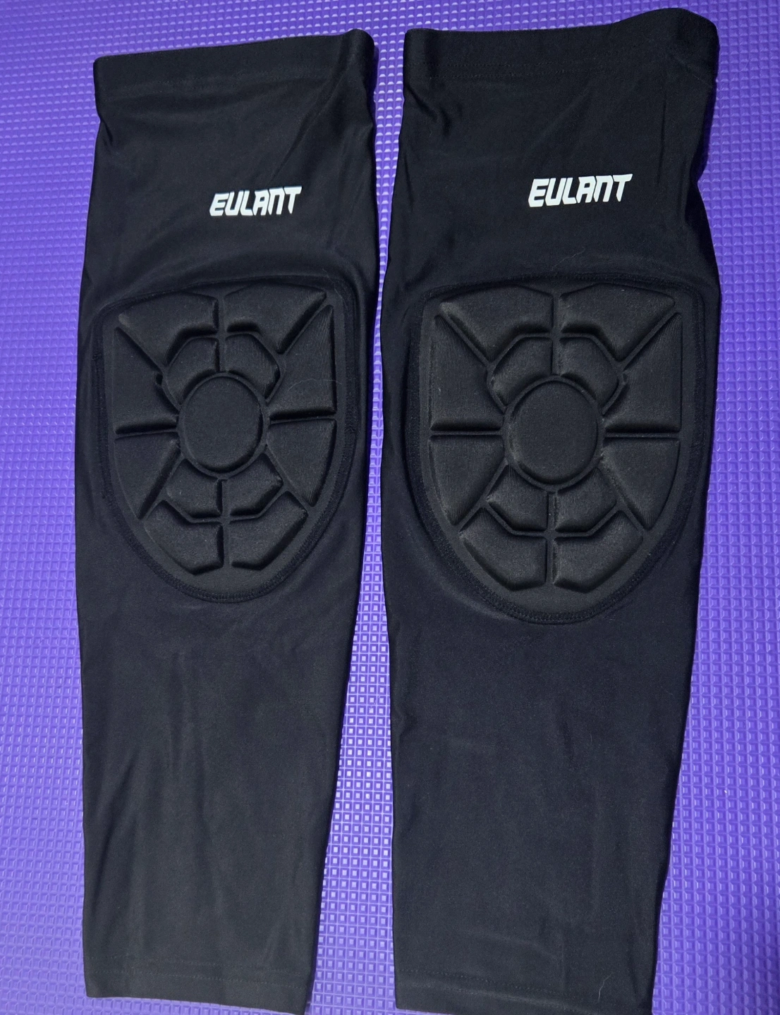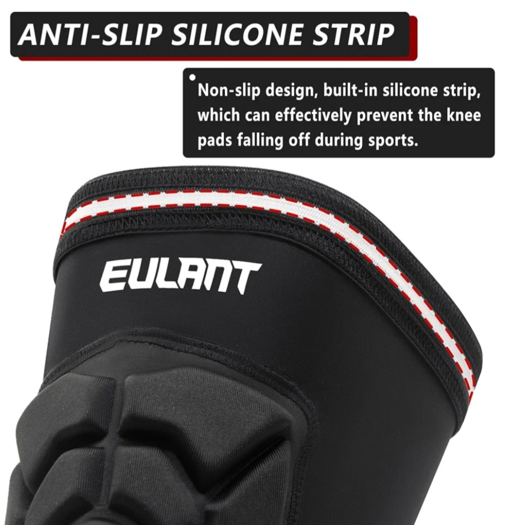 Pair of black EULANT knee pads. Breathable and quick-drying fabric. Comfortable and fitted design. Elastic wrap for secure fit. Lightweight, only 32g each. Includes anti-slip silicone strip.