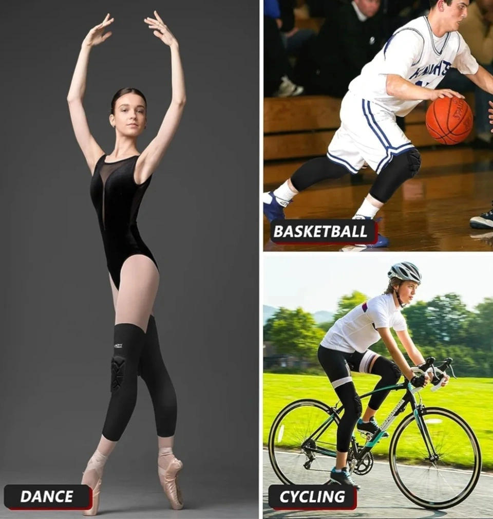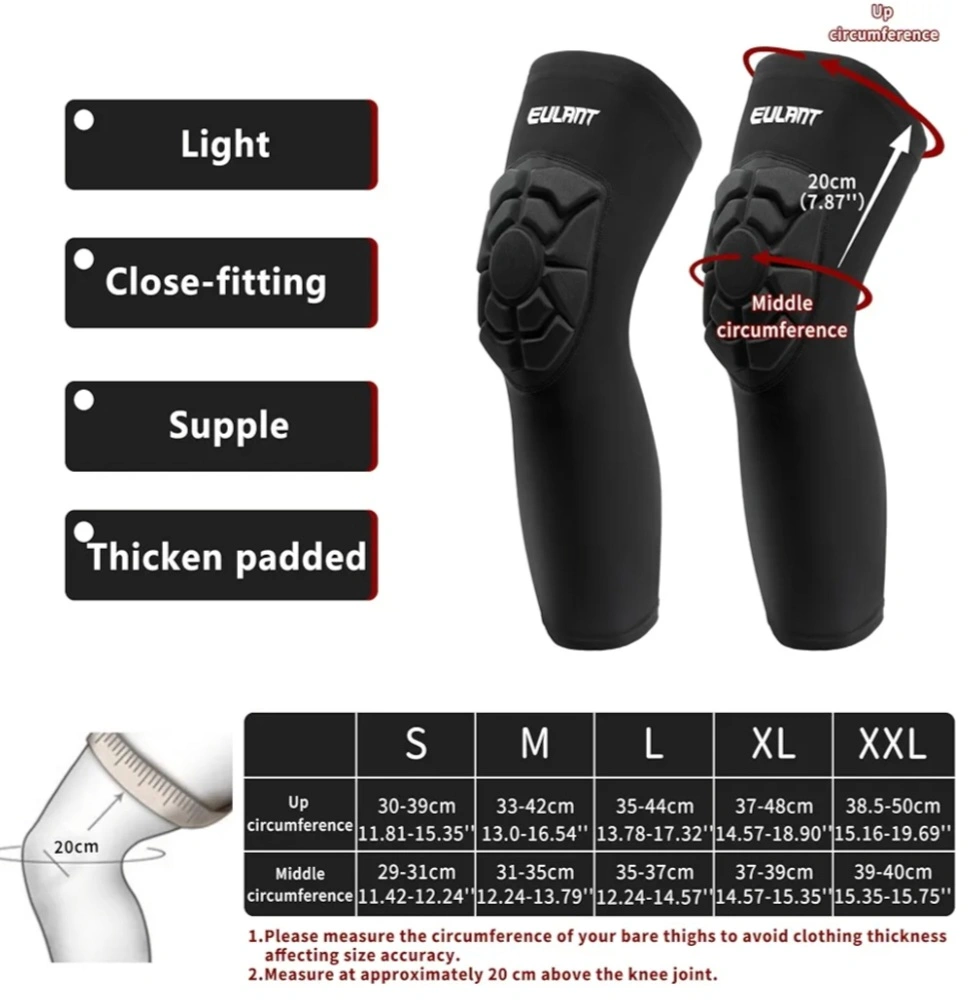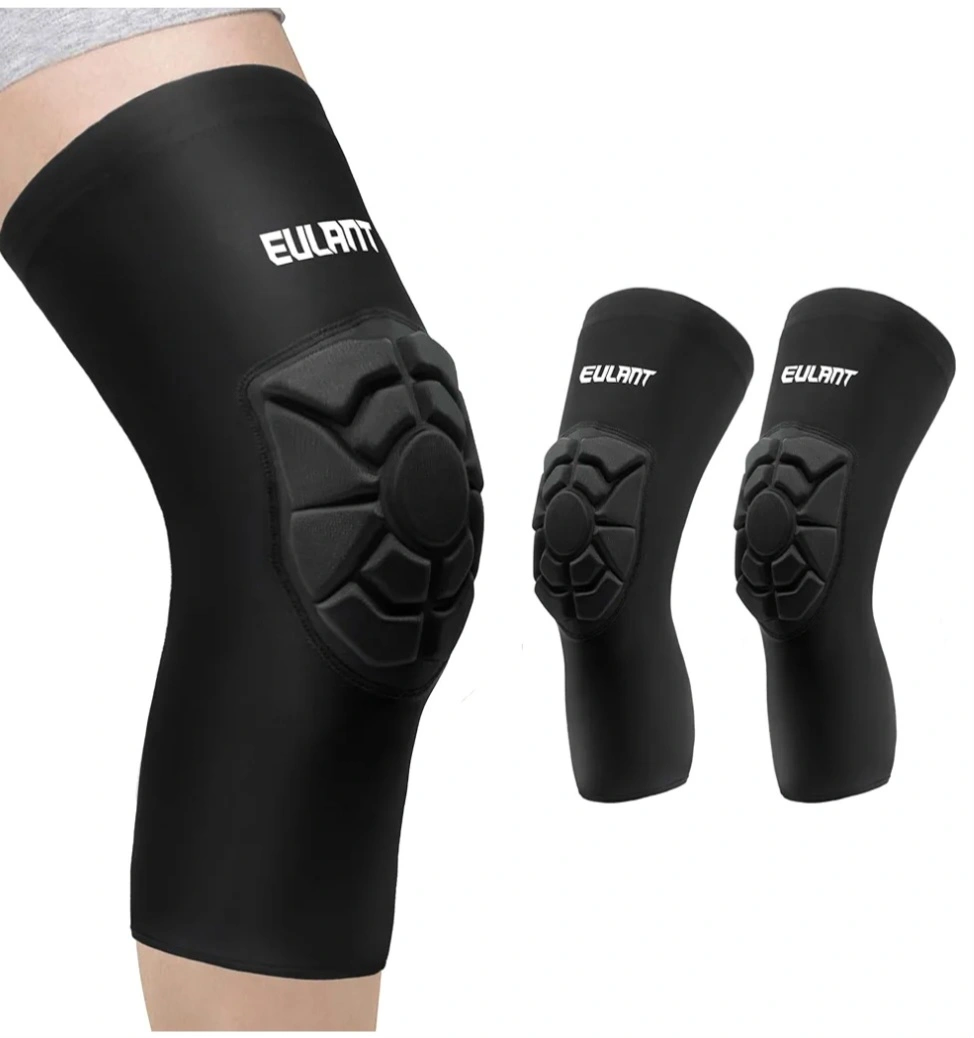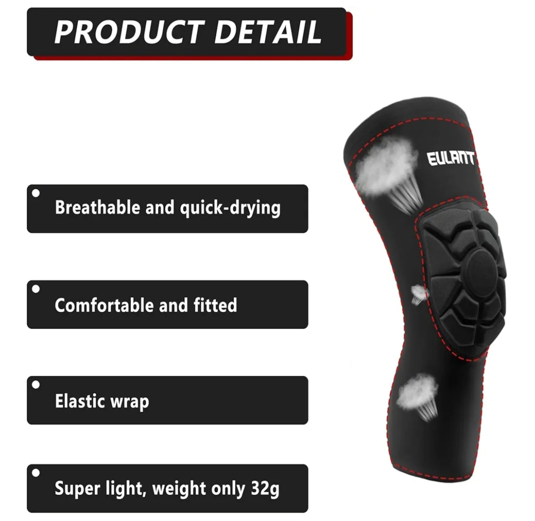 Pair of black EULANT knee pads. Breathable and quick-drying fabric. Comfortable and fitted design. Elastic wrap for secure fit. Lightweight, only 32g each. Includes anti-slip silicone strip.