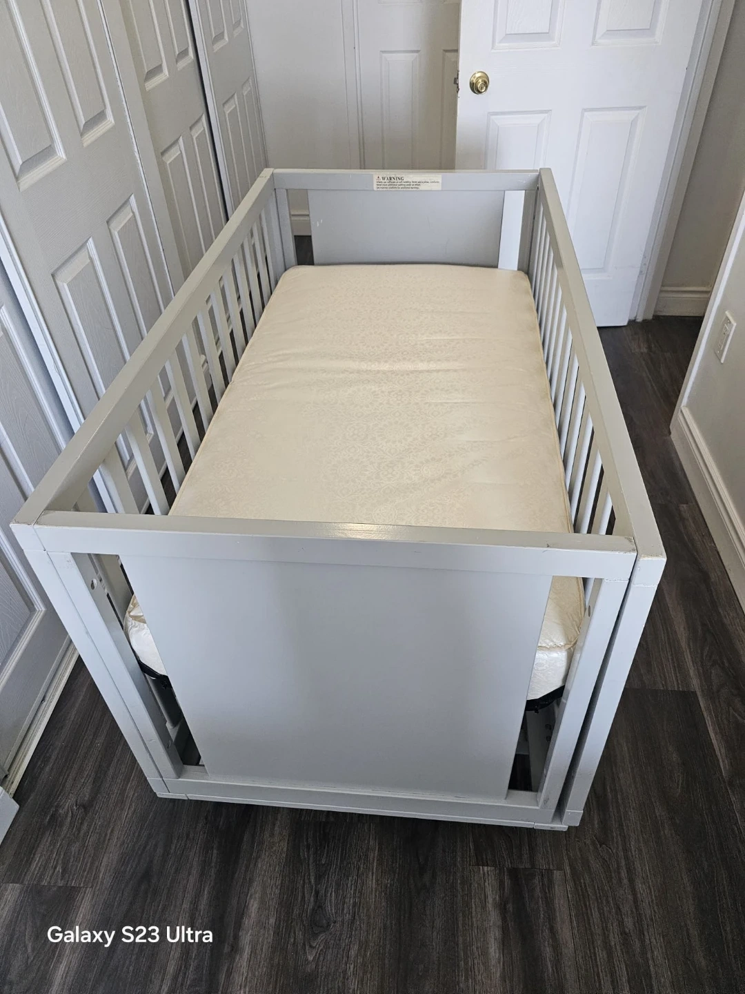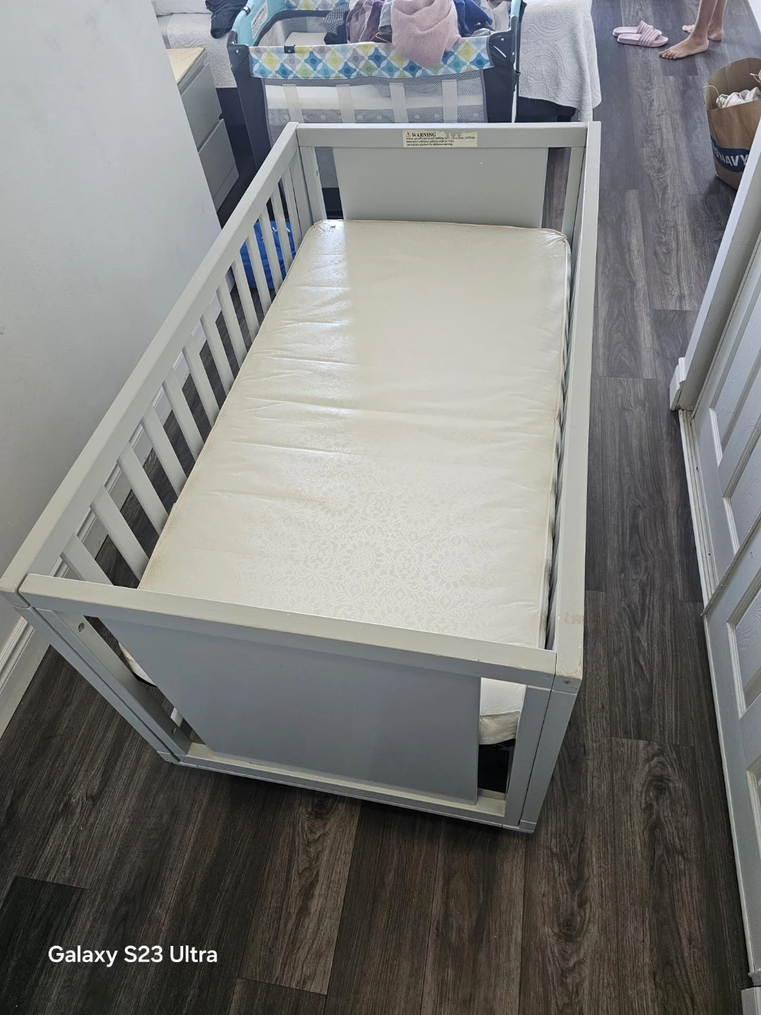 Grey crib and mattress included. Cot rail for added safety. Used only couple.of times, very good condition.