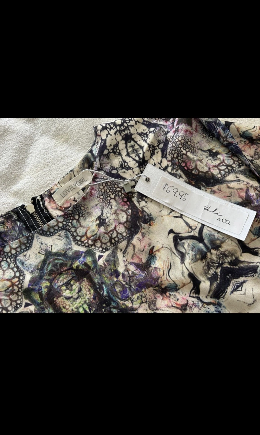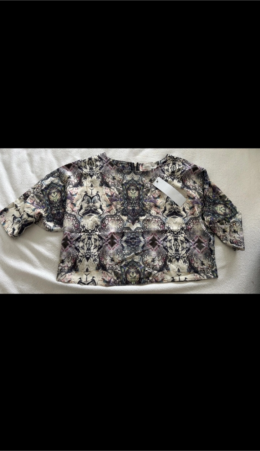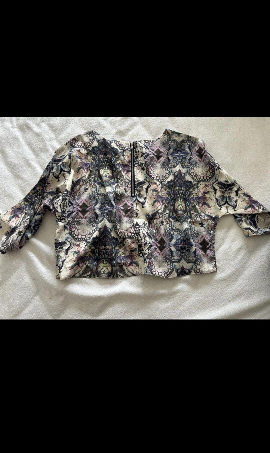 Unique cropped blouse. Features a stunning abstract print. Three-quarter sleeves. Back zipper closure. Brand new with tags.