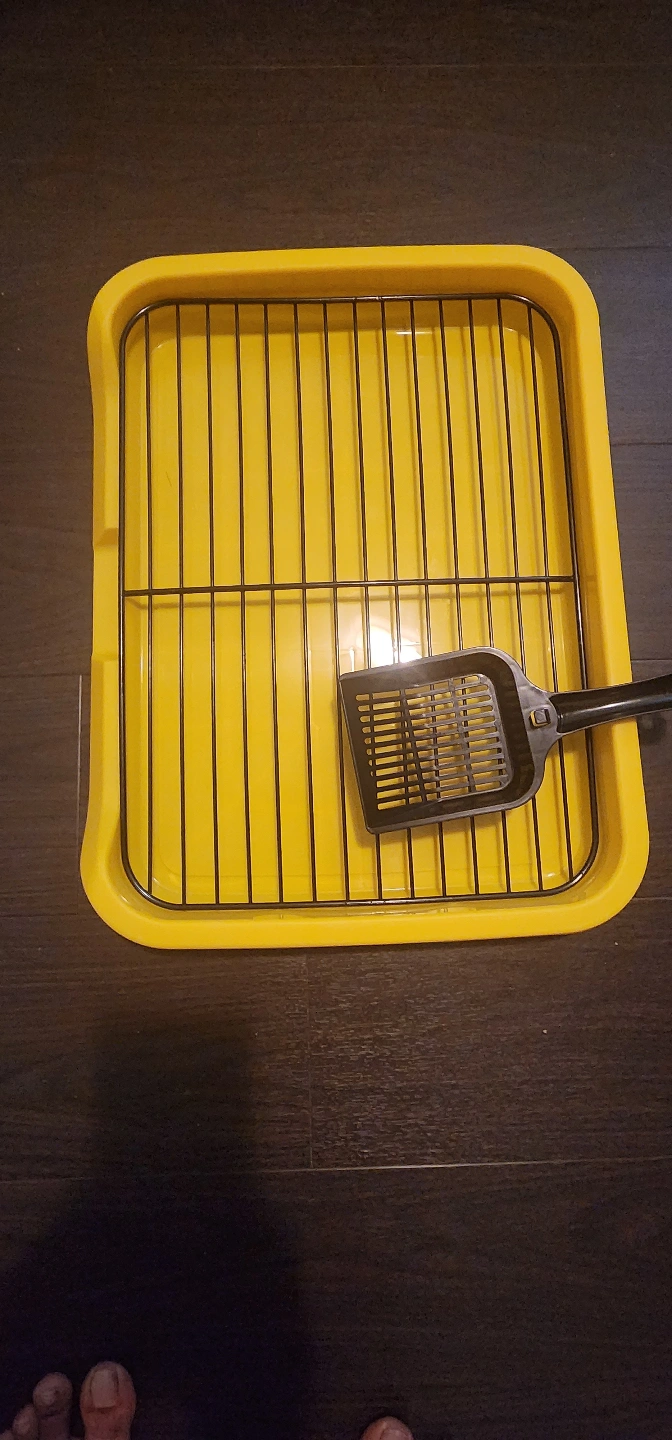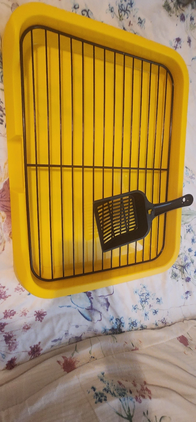 Yellow plastic litter box. Includes metal grate and black plastic scoop. New