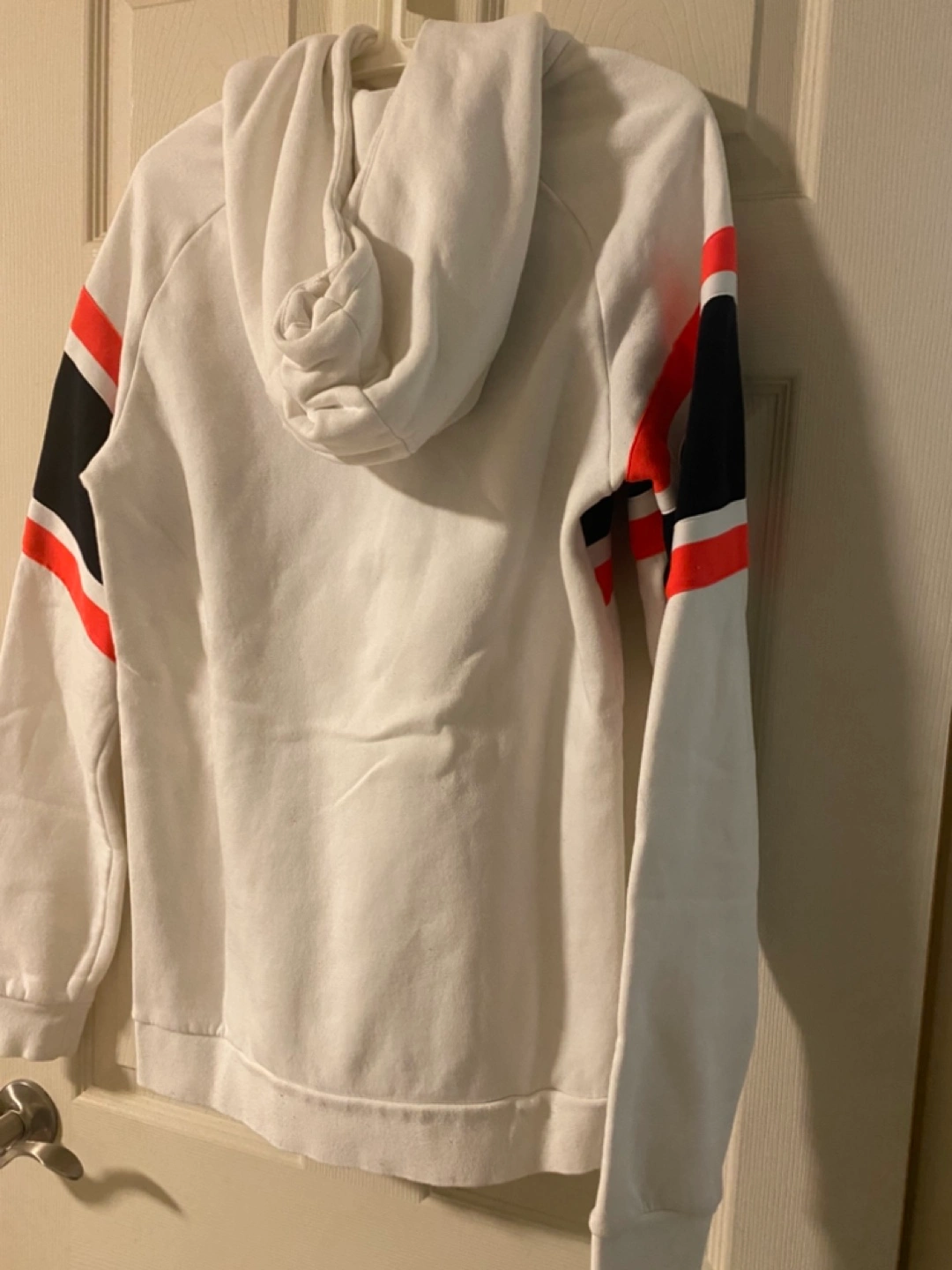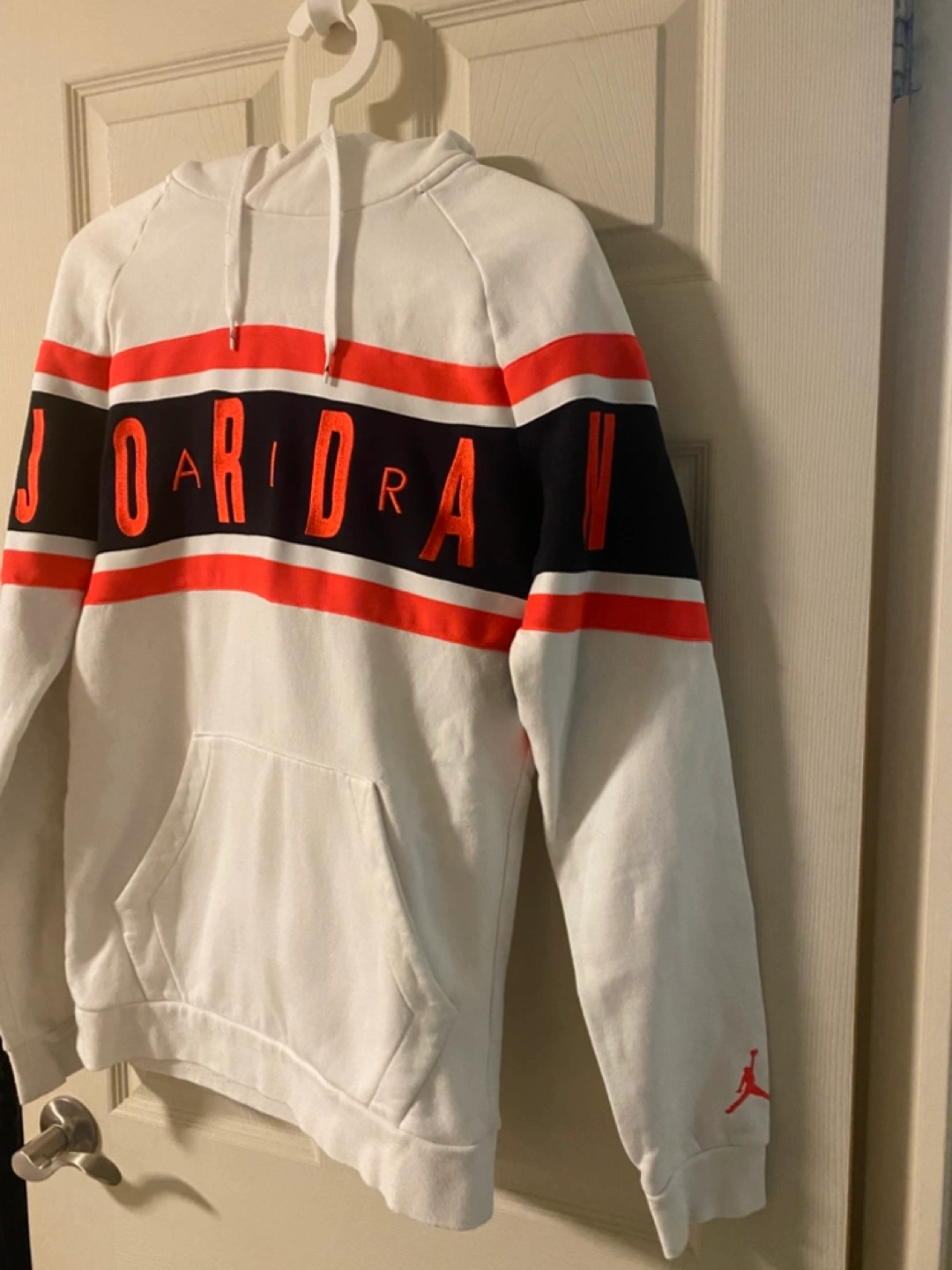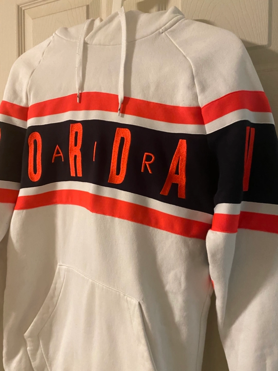 Men's Jordan Brand hoodie. White with red and black stripes across the chest. Features the Jordan logo. Size small.