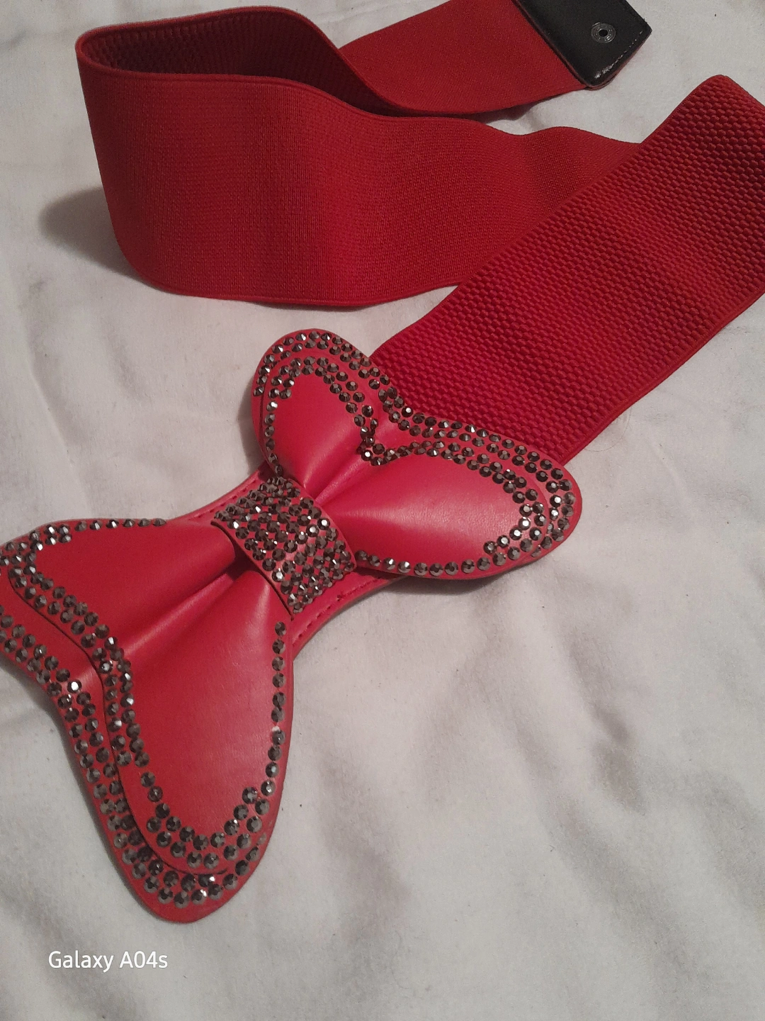 Stretchy red fabric belt. Features a large red bow with rhinestones. Great accent piece.