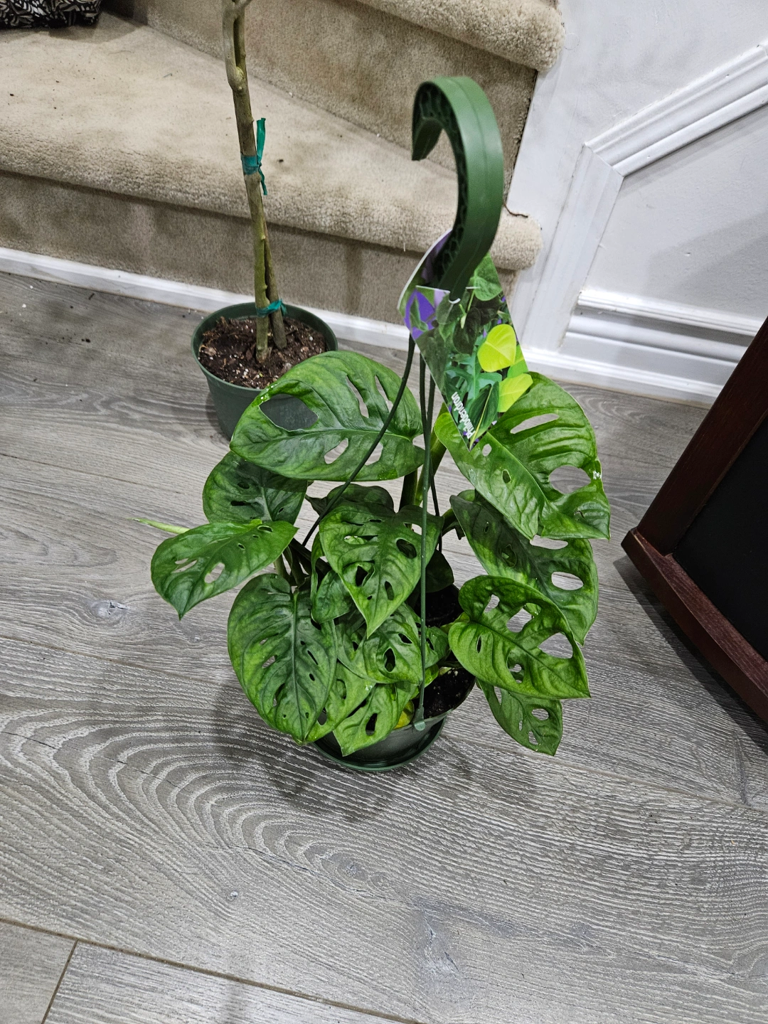 Healthy Monstera Adansonii. Beautiful, fenestrated leaves. Perfect addition to any home. Growing in a black plastic pot.